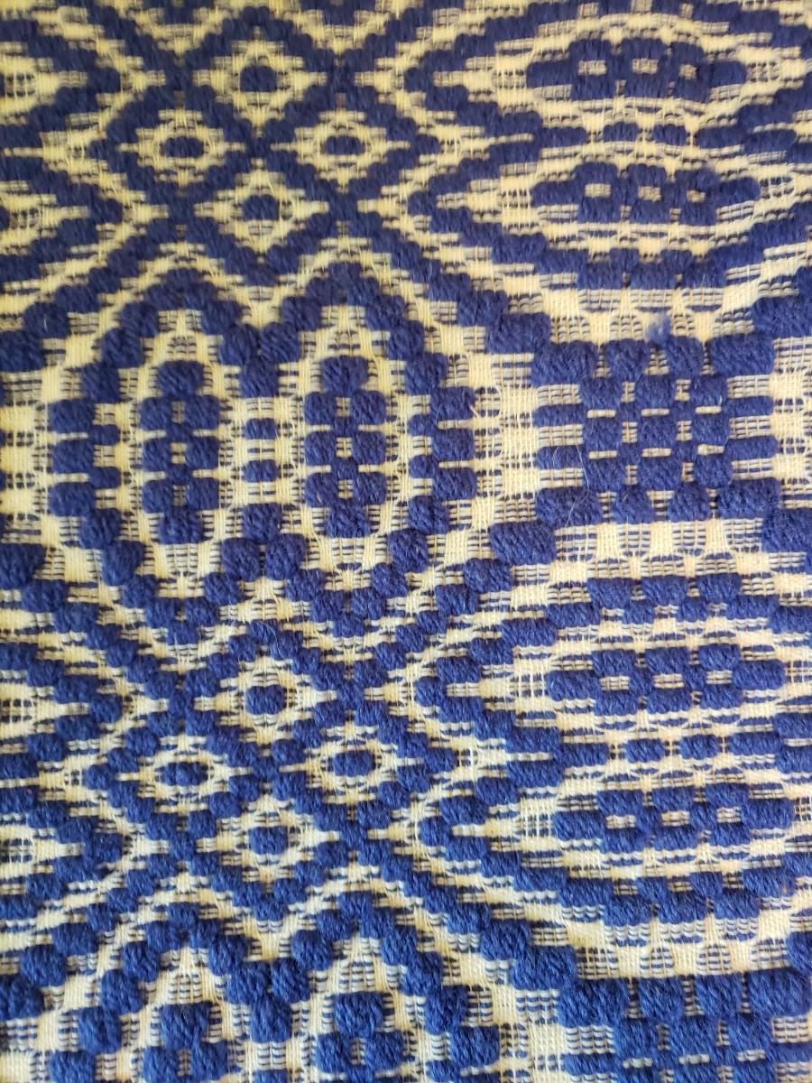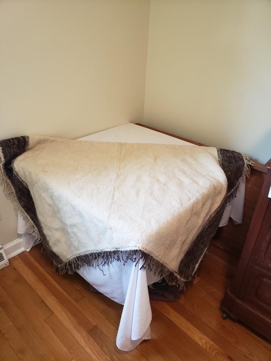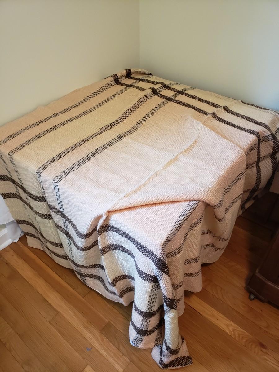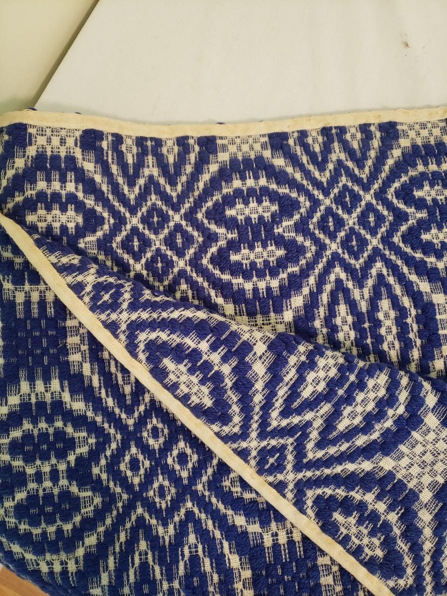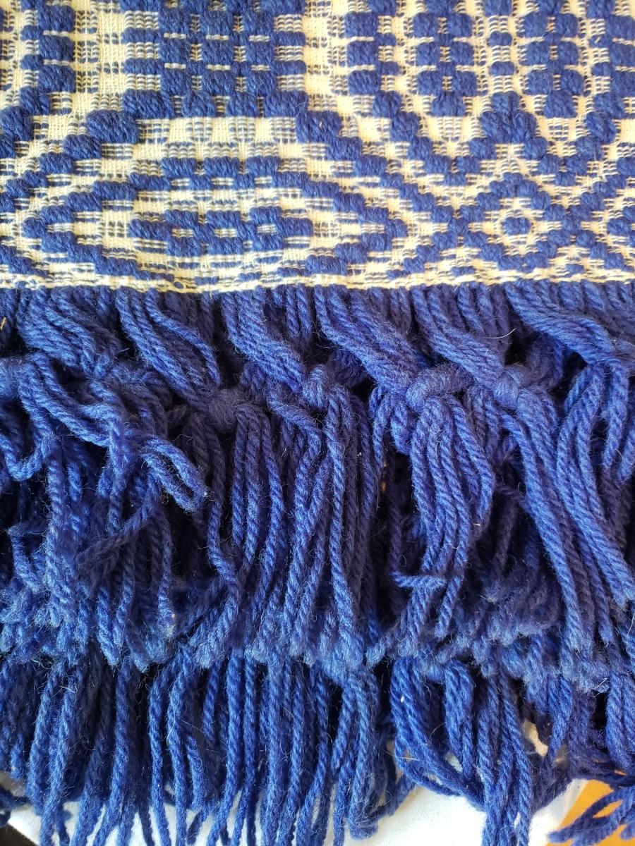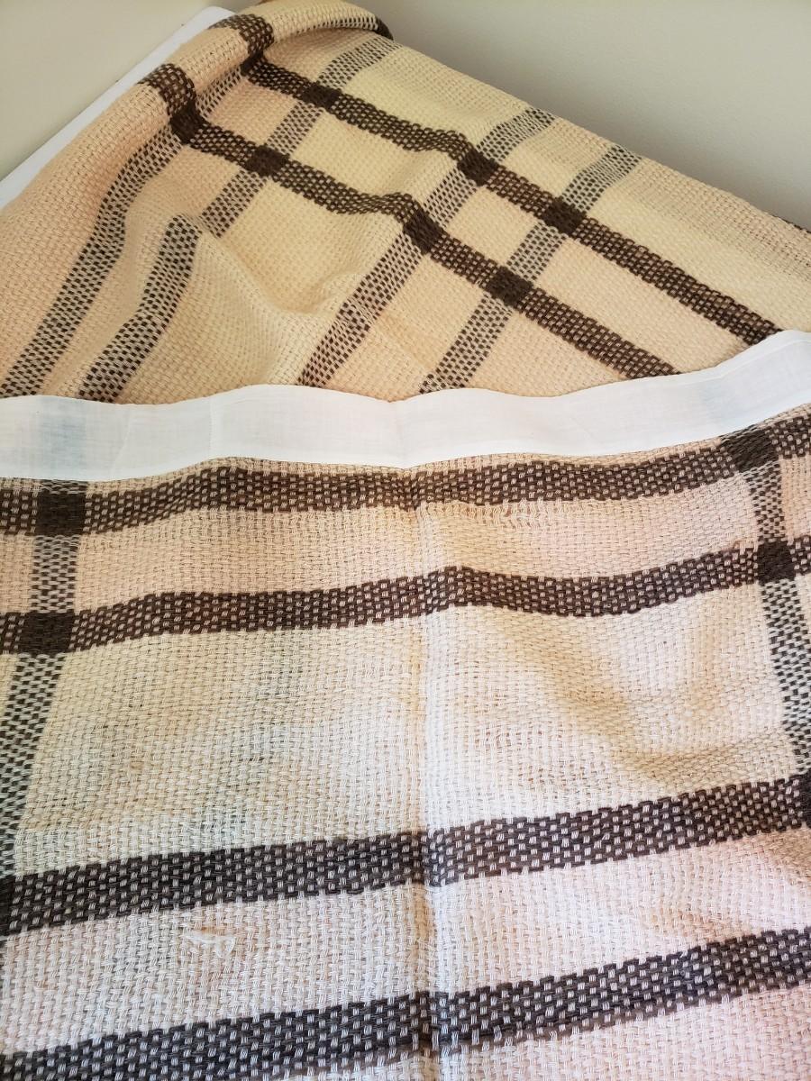 The first blanket pictured in this lot is believed to wool. It is tan with brown plaid strips. On the back one end is lined with linen as seen in the pictures. This blanket measures 56"x74". The wool tan blanket with a big brown strip on the edge with fringe, measures 60"x60" appears to be in good condition. The large blue and white patterned blanket is 76"x60" and is fringed in blue yarn on only two opposing sides. Shipping available.
