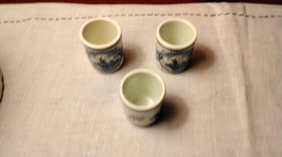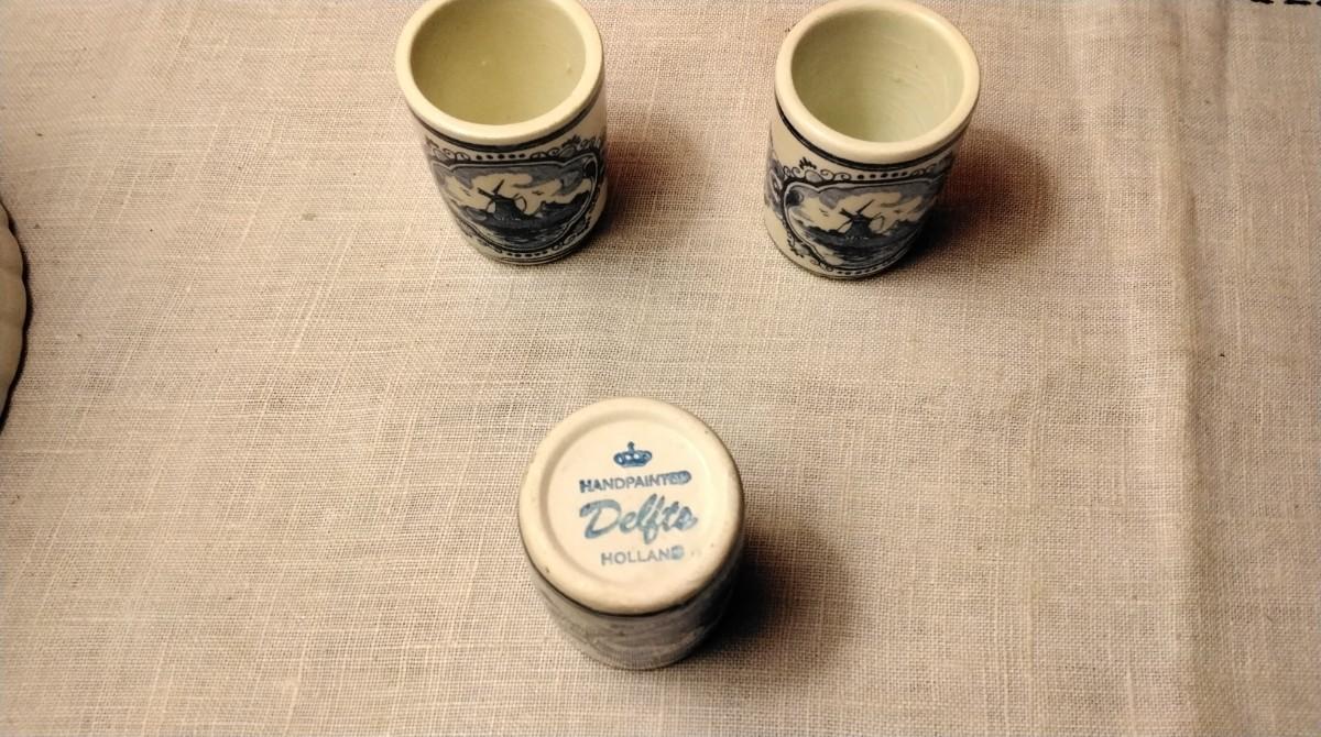 These cute little Holland Delft shot glasses were made in Holland. They are ceramic and stand 2 inches high. Set of 3 and made by the Vandermint Company.1"× 2"