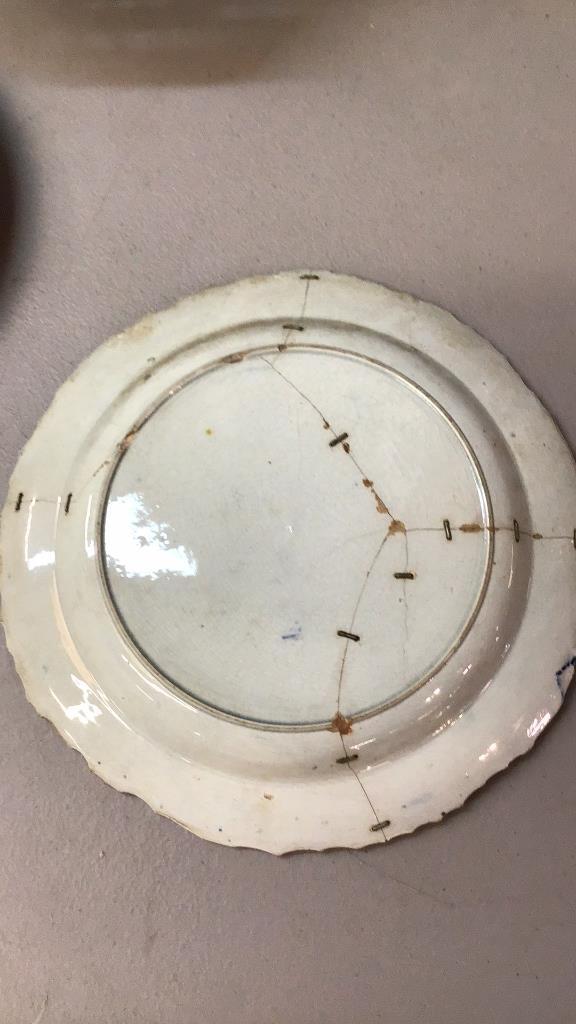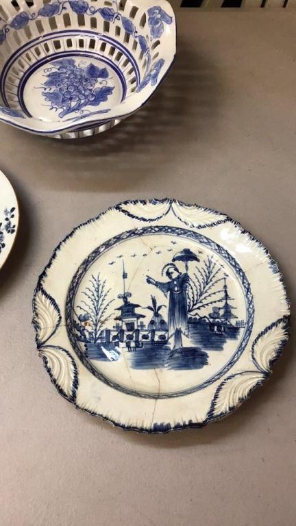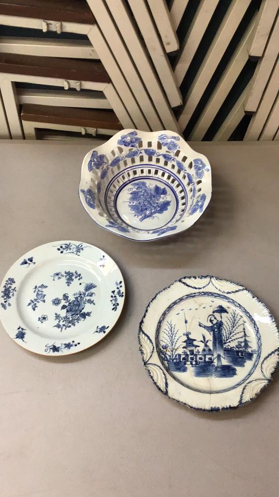 Hand painted bowl..2 blue Transferware plates, one has been repaired Line Item # 40
