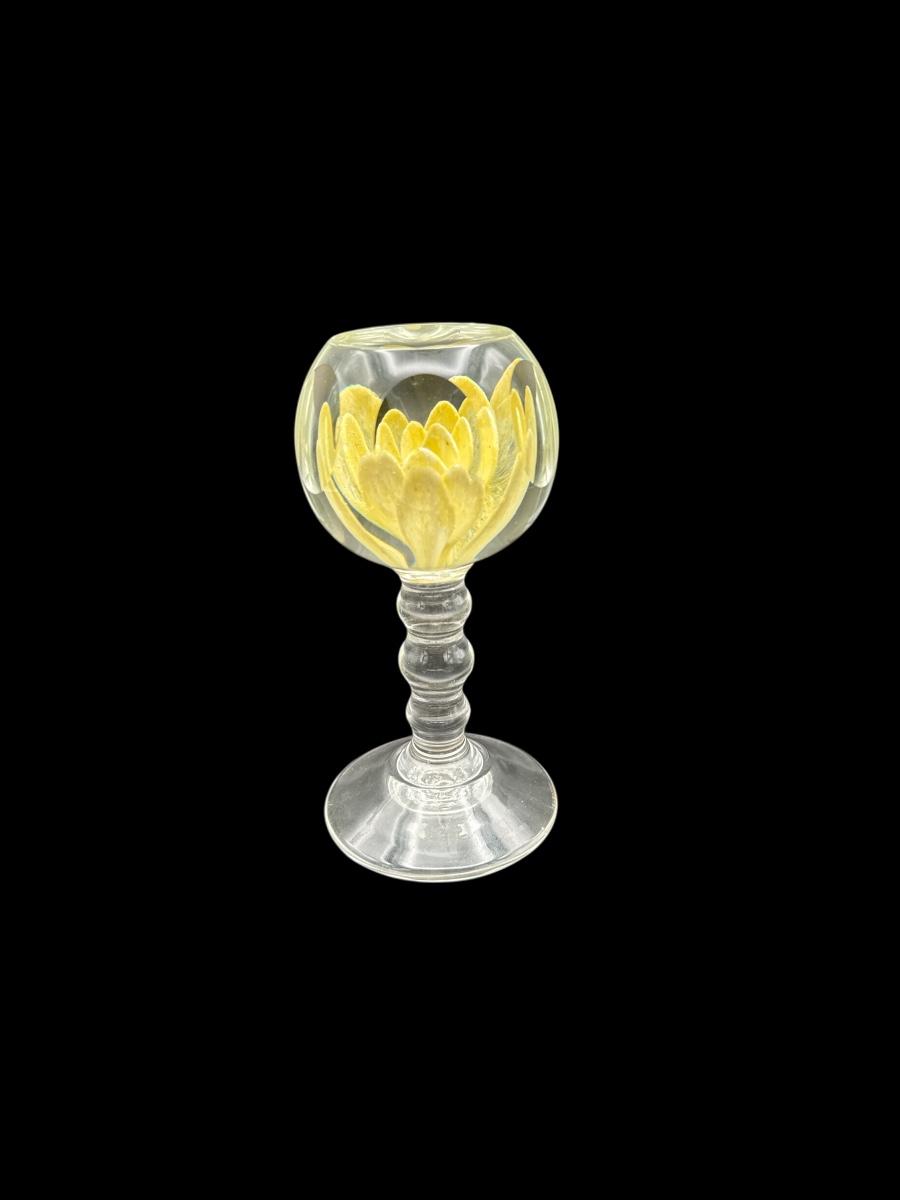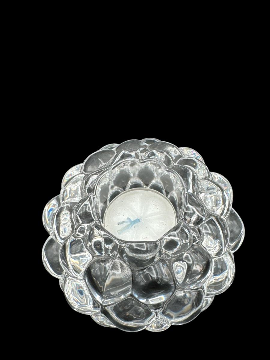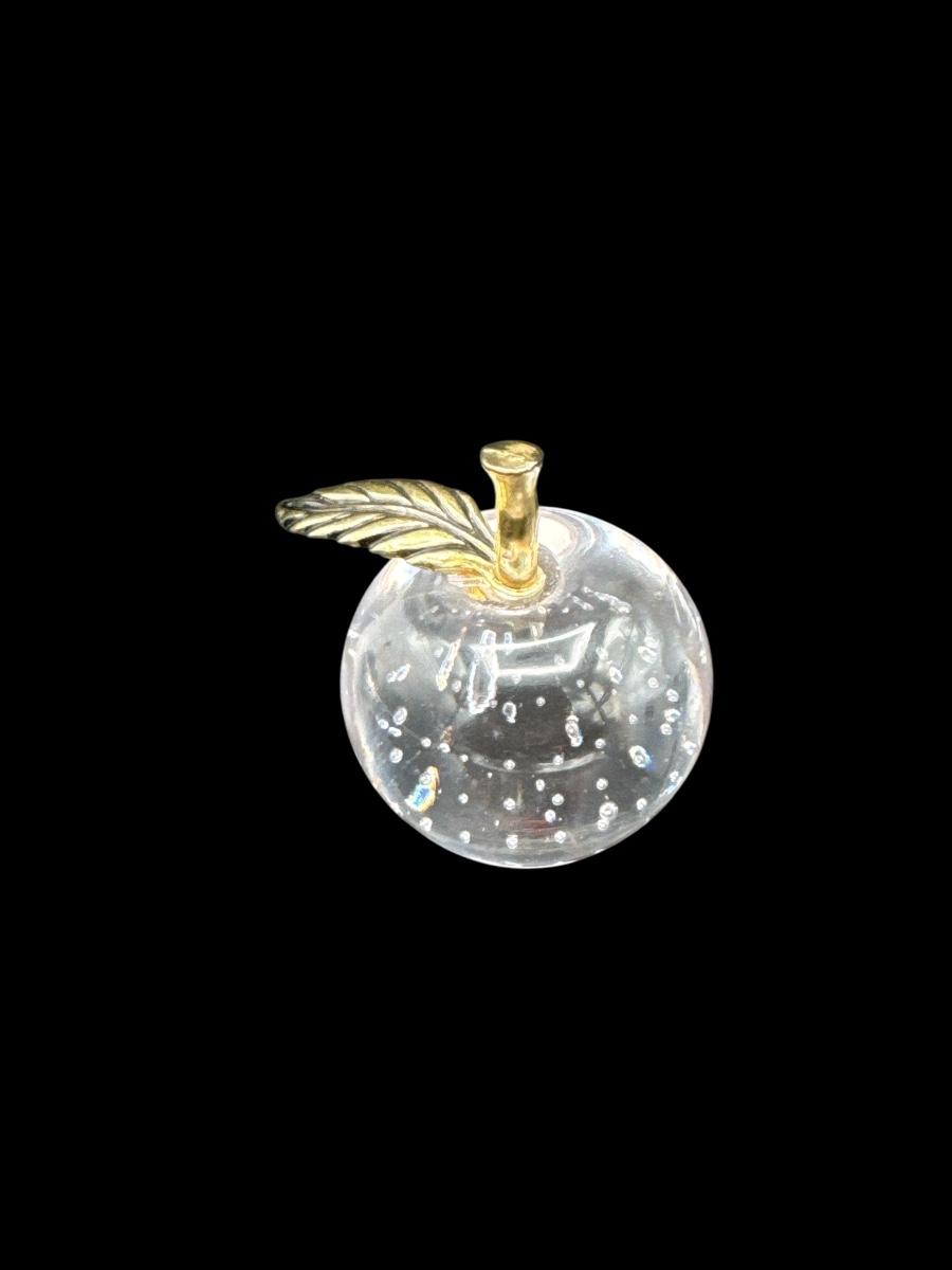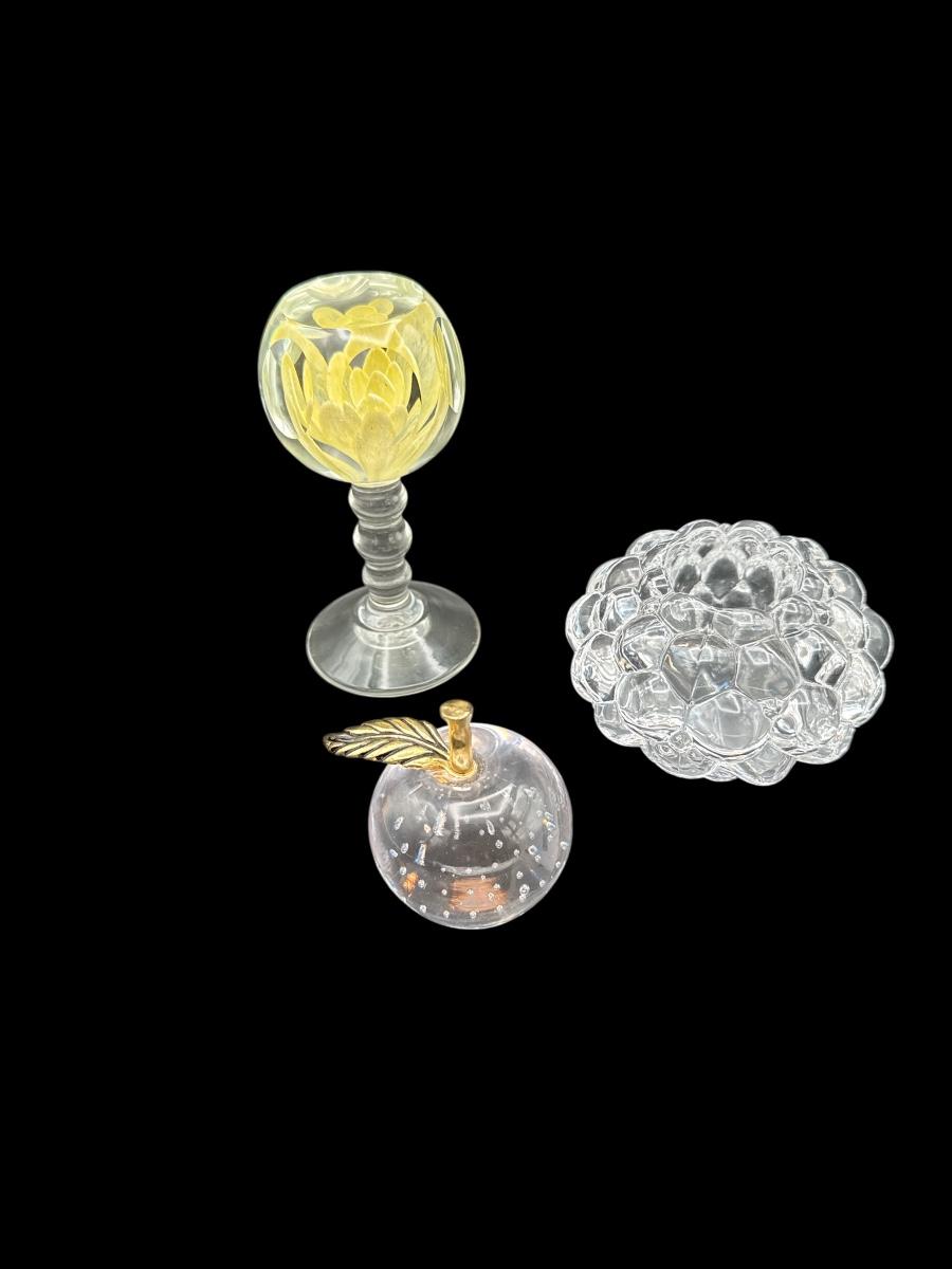 Includes a yellow flower-in-glass stemmed orb 6” tall, a clear glass apple with gold-tone stem, and a scalloped glass dish signed orrefors . All in very good condition.