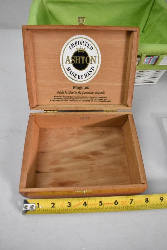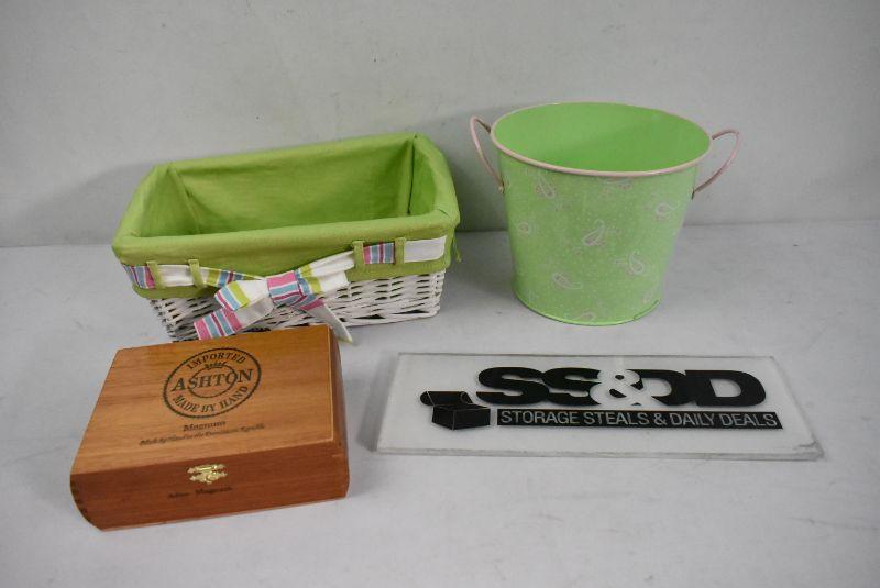 3 Decorative Storage Items: Ashton Cigar Box, White/Green Basket, and Green/Pink Bucket