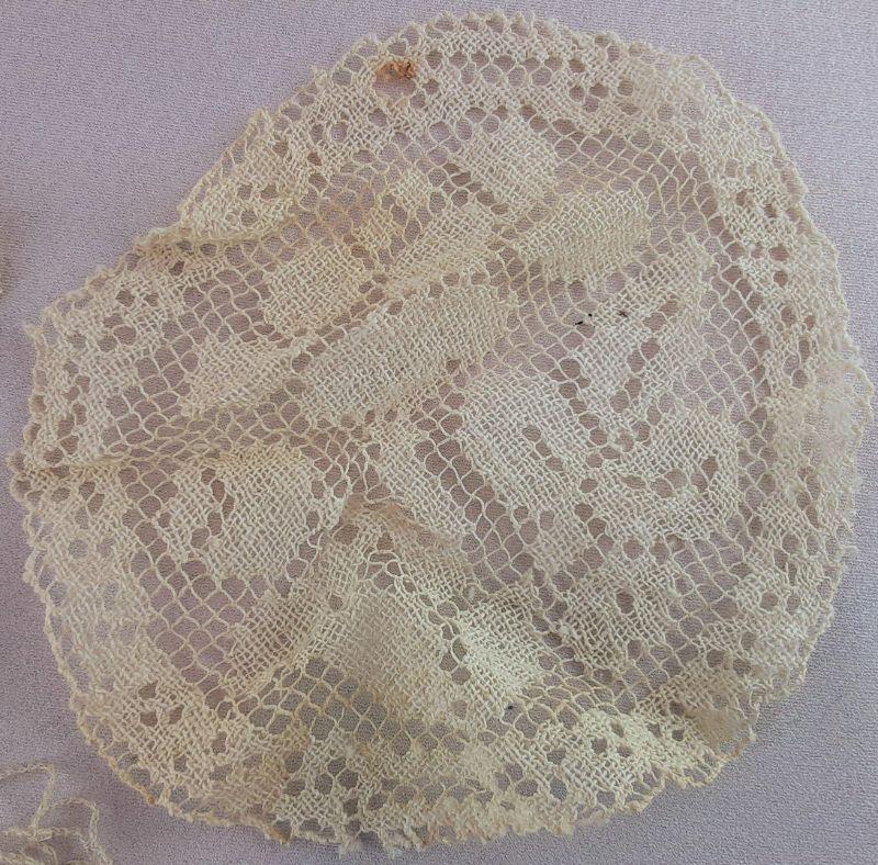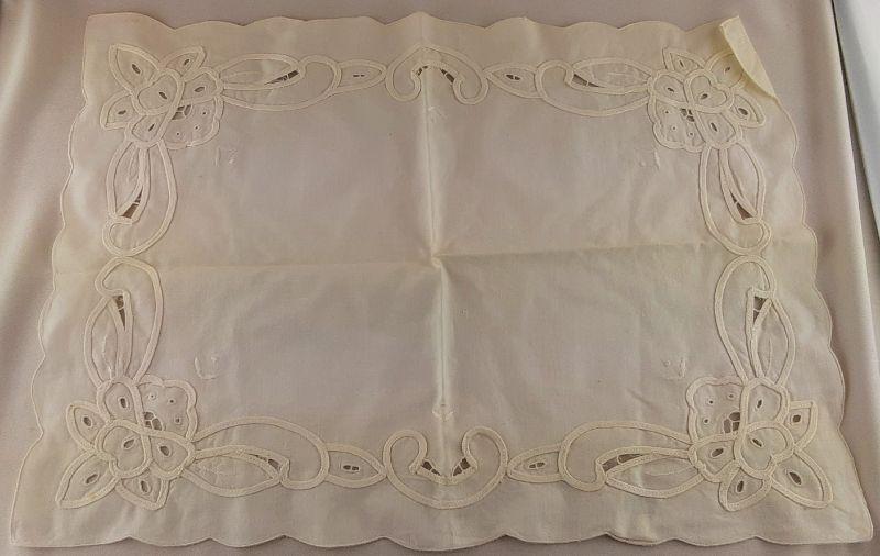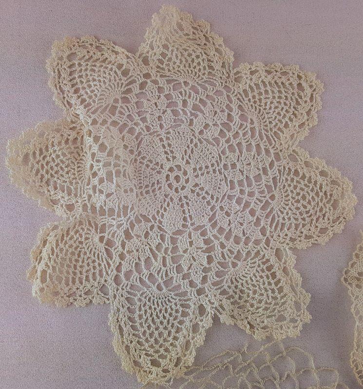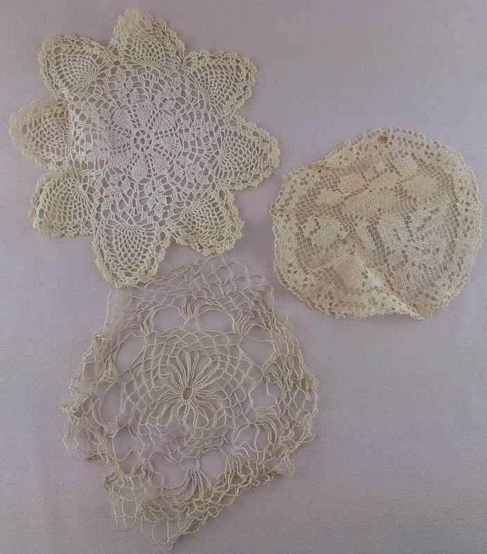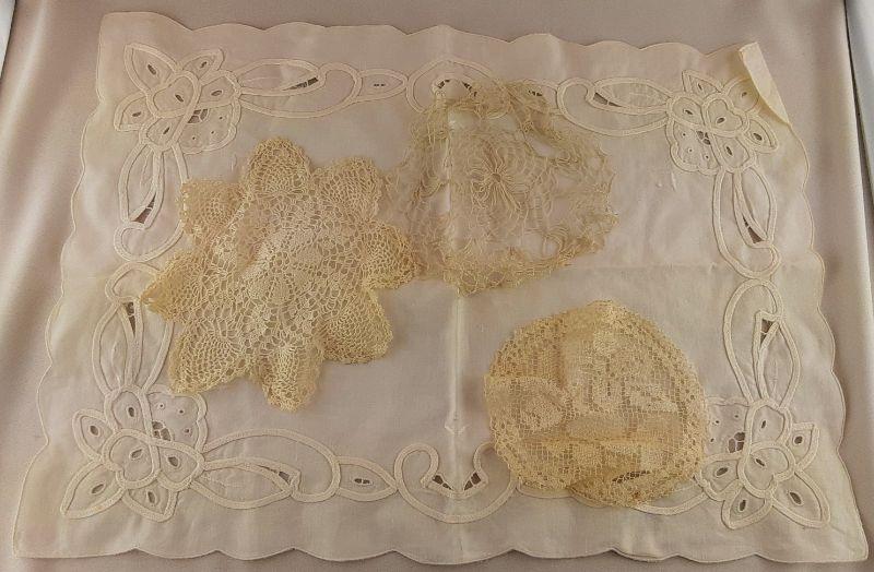 2 vintage doilys that measure 6in. diameter and one 6.5in diameter. The placemat measures 19 by 14in.