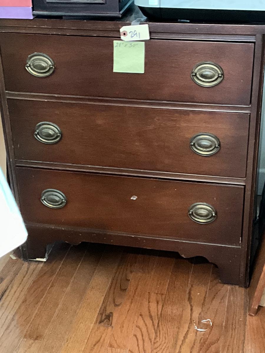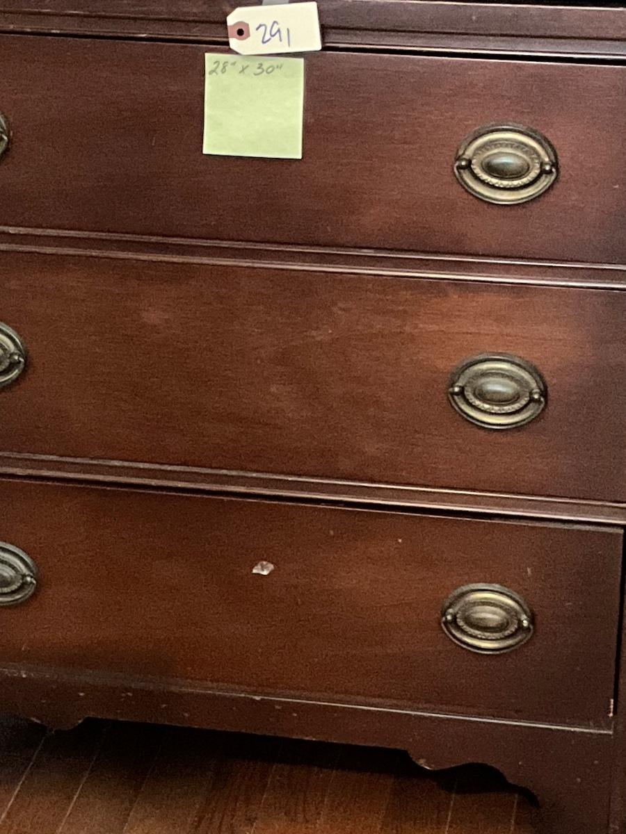 3 Drawer Bachelor Chest, 28" x 30", could use refinishing as pictured