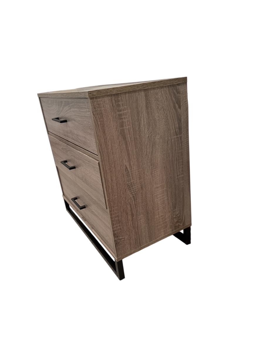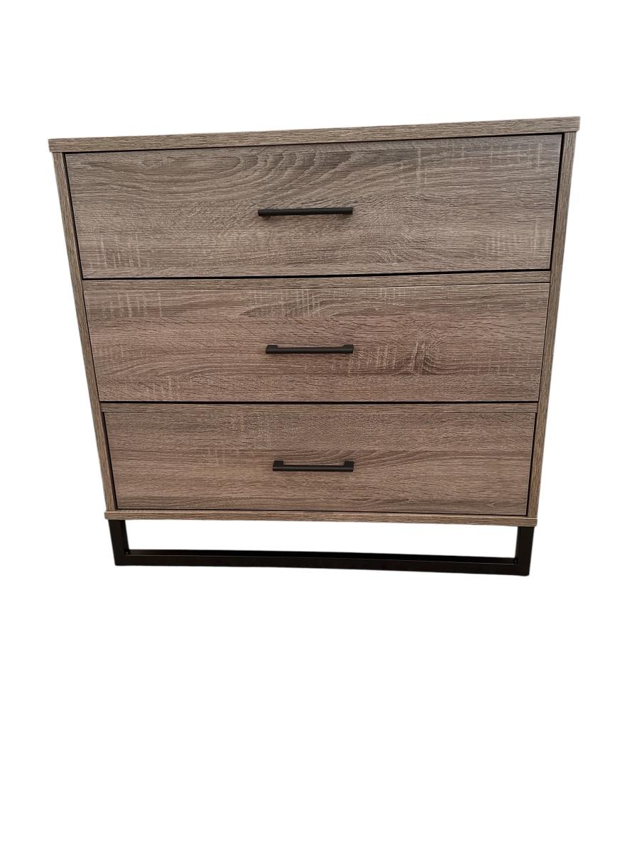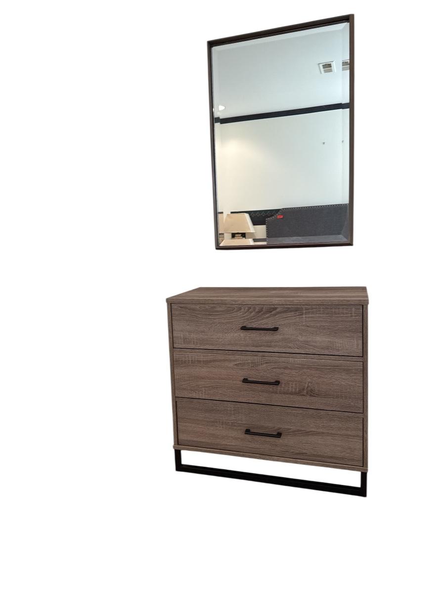 three-drawer chest with coordinating mirror. The chest features a wood-look finish, clean lines, and black metal drawer pulls and base for a sleek, industrial touch. Includes a matching rectangular wall mirror with a black metal frame. Stylish and functional set for bedroom or entryway.