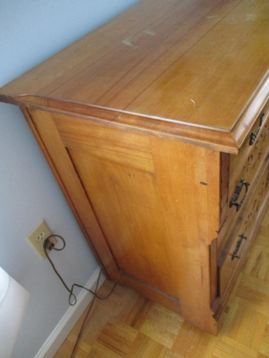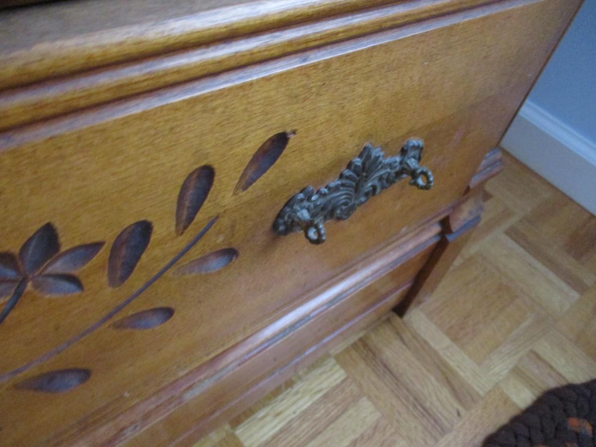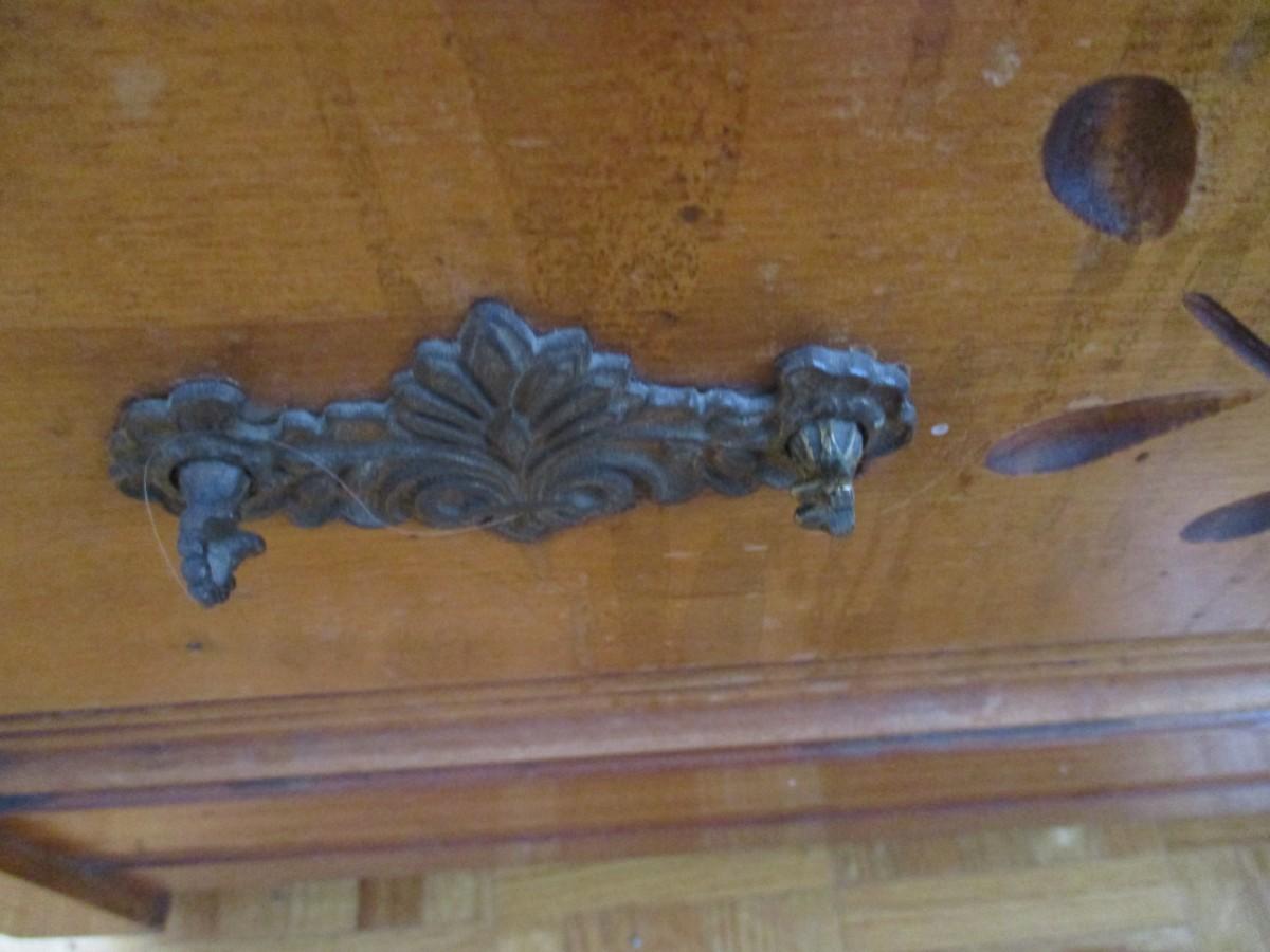The bottom drawer does have a broken handle on the left side, the right side handle is off. Handles are inside