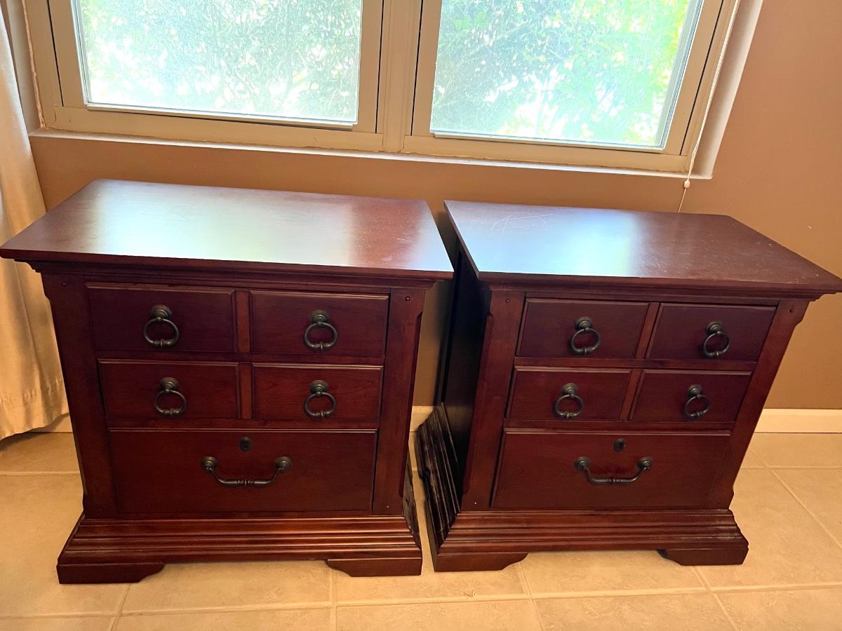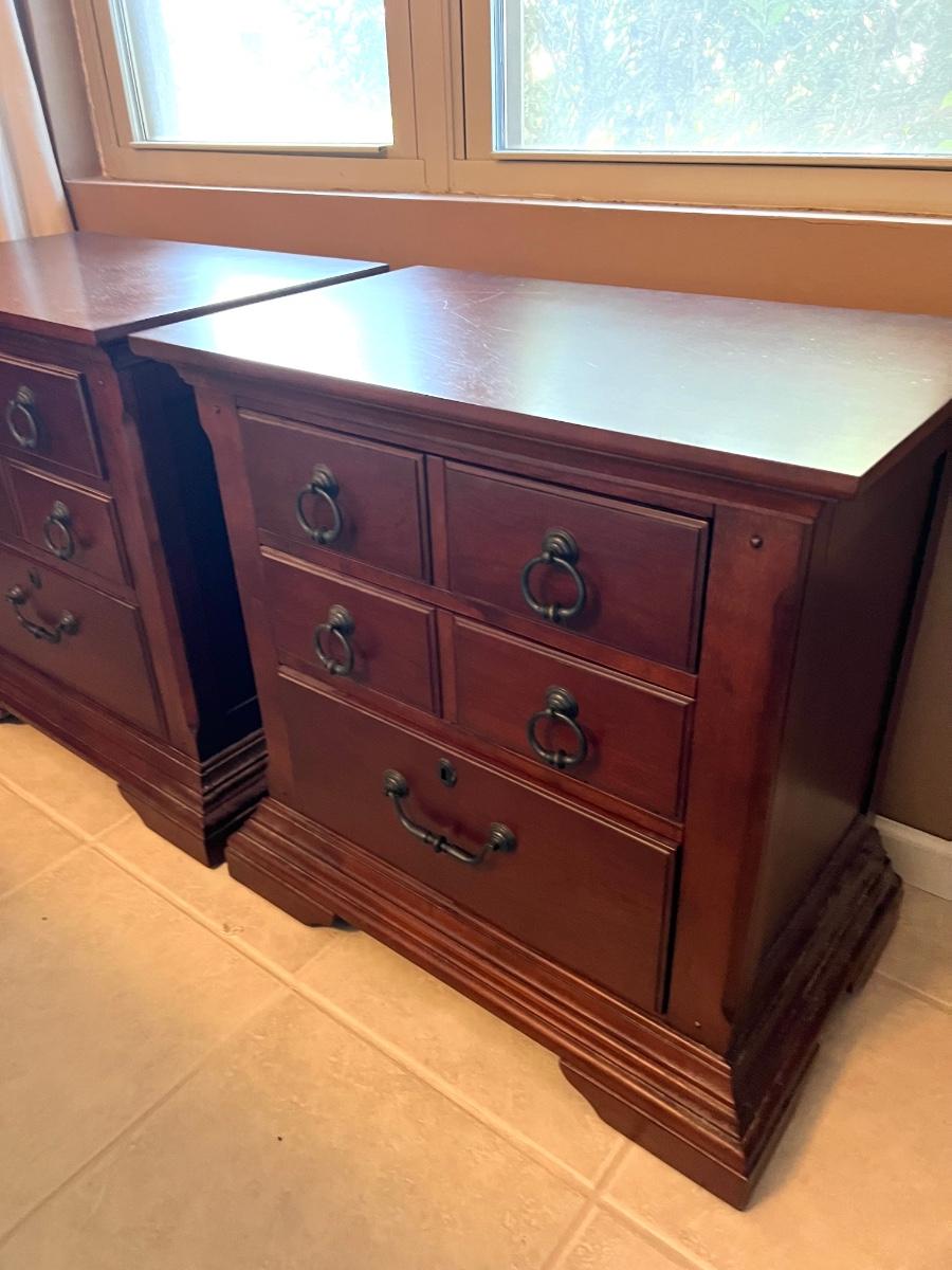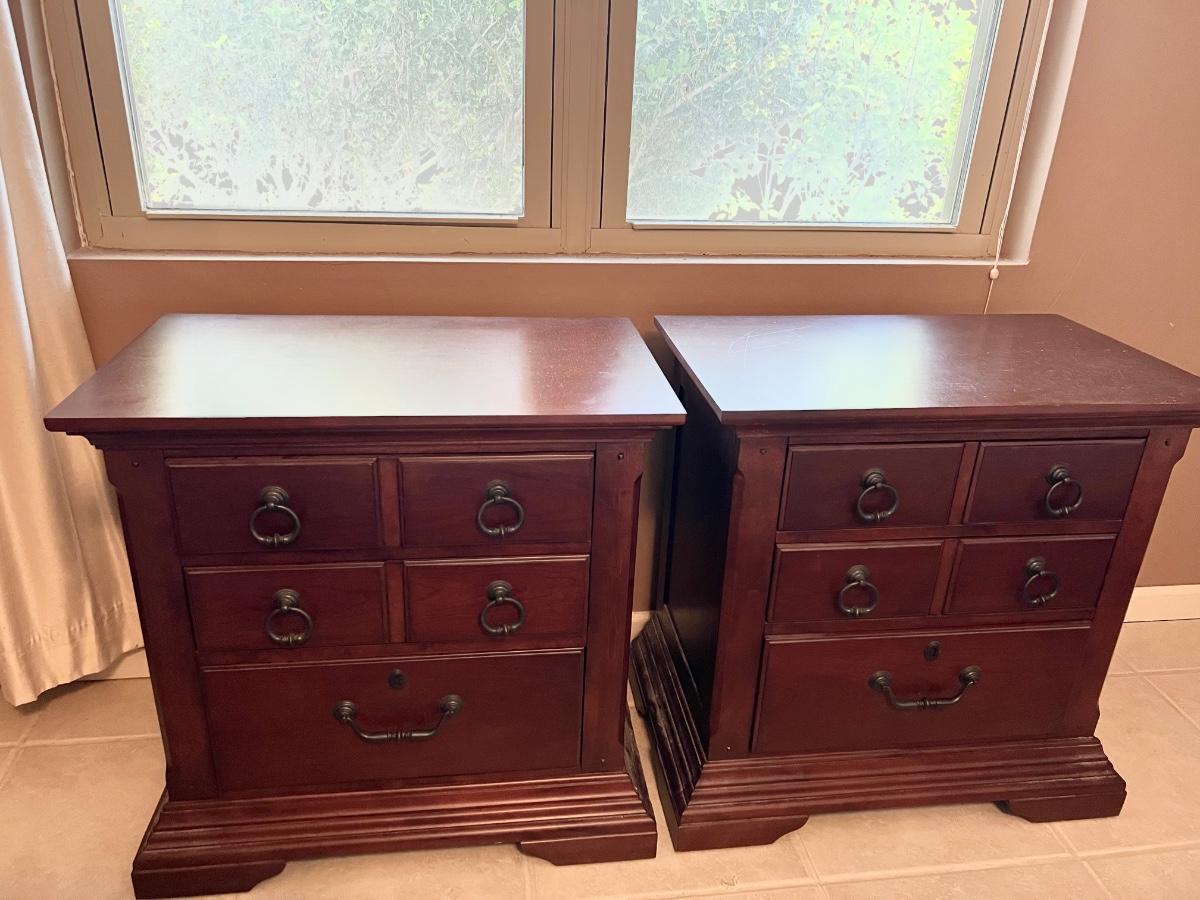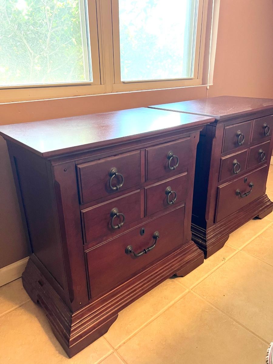 Pair of cherrywood night stands with three drawers. Measures 28 inches tall, 28 inches wide and 17 inches deep. One nightstand is in brand new condition and the other has some minor surface scratches. from use
