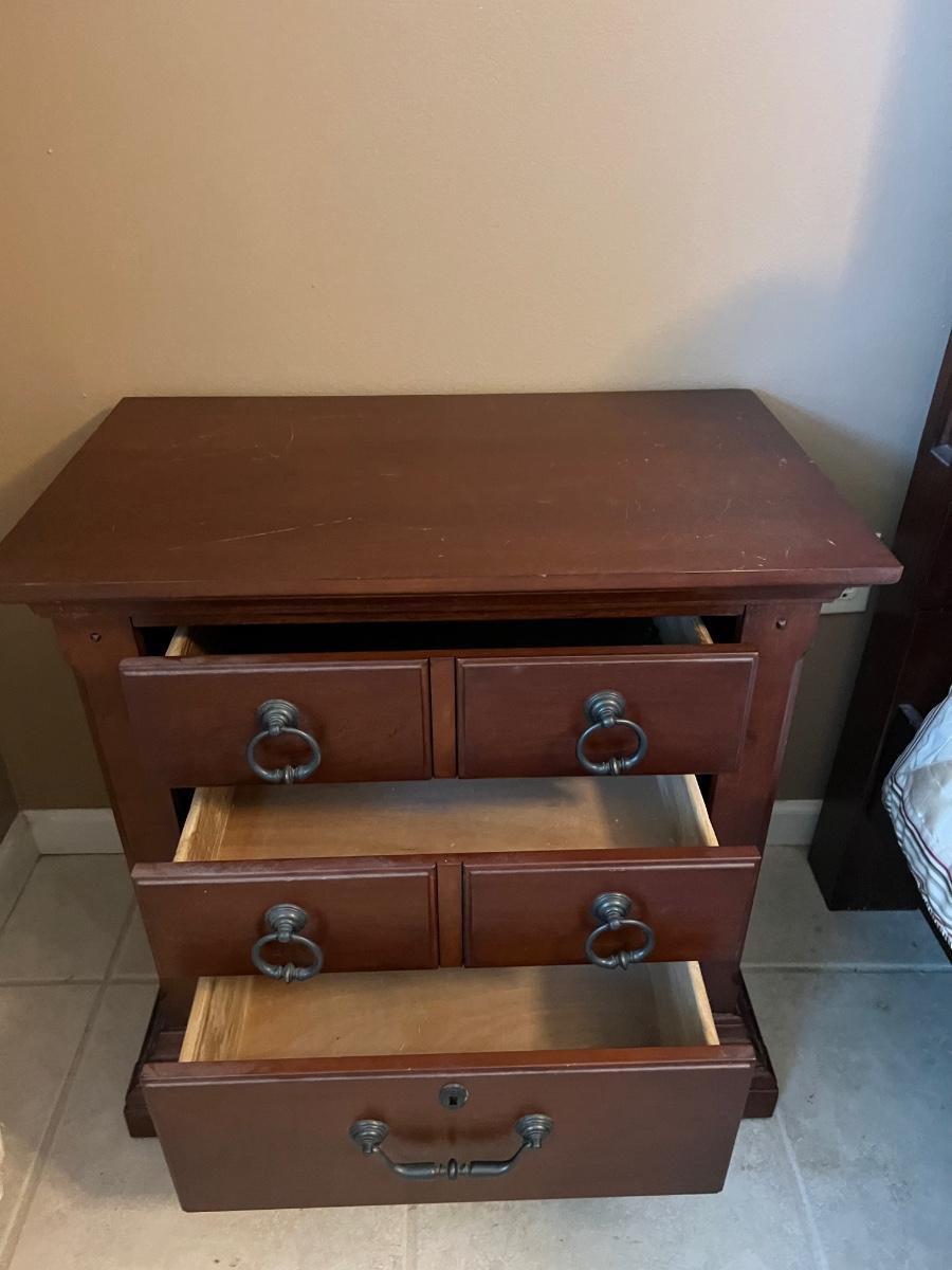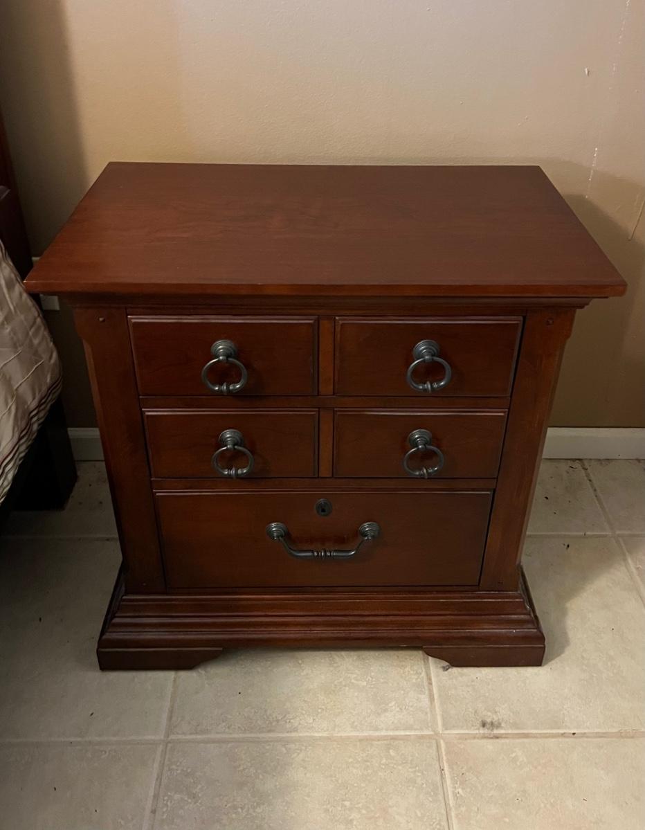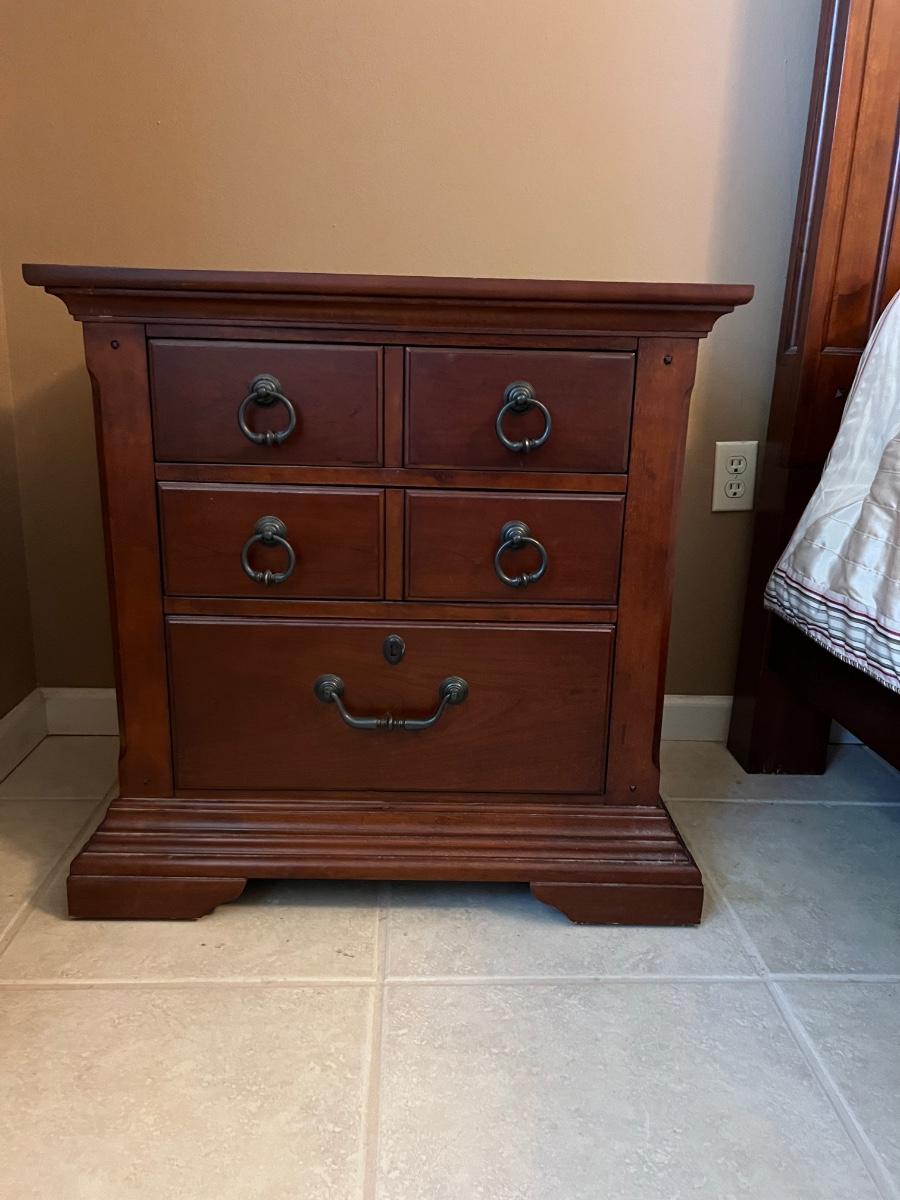 Pair of cherrywood night stands with three drawers. Measures 28 inches tall, 28 inches wide and 17 inches deep. One nightstand is in brand new condition and the other has some minor surface scratches. from use