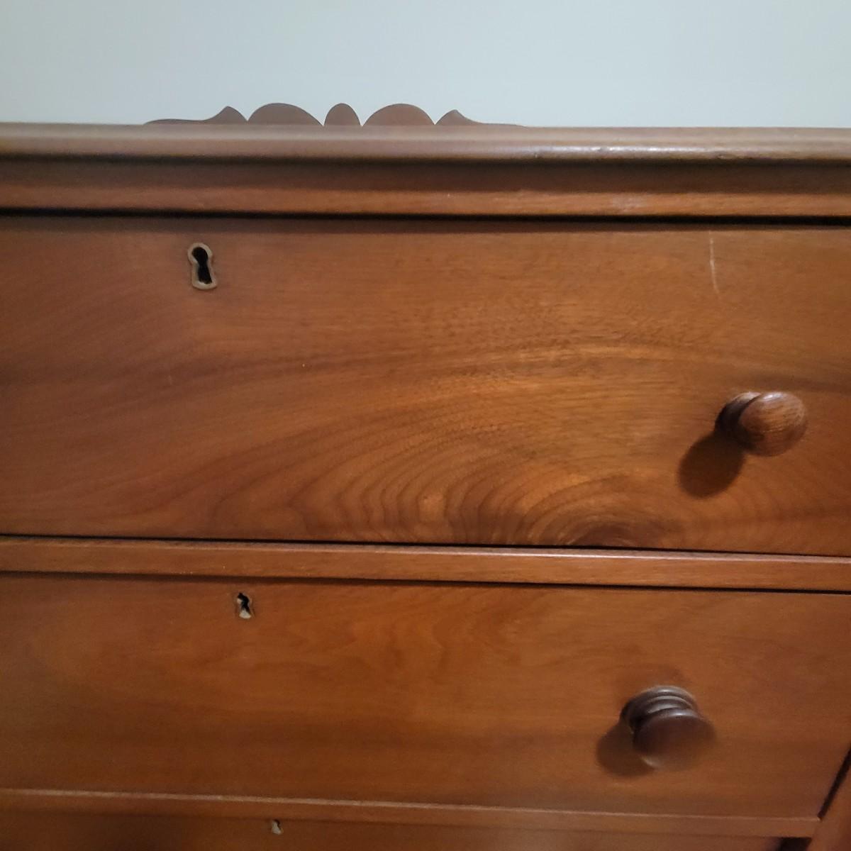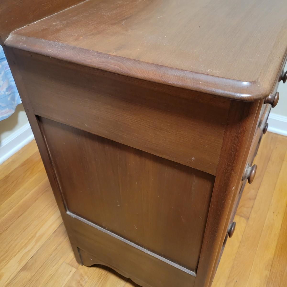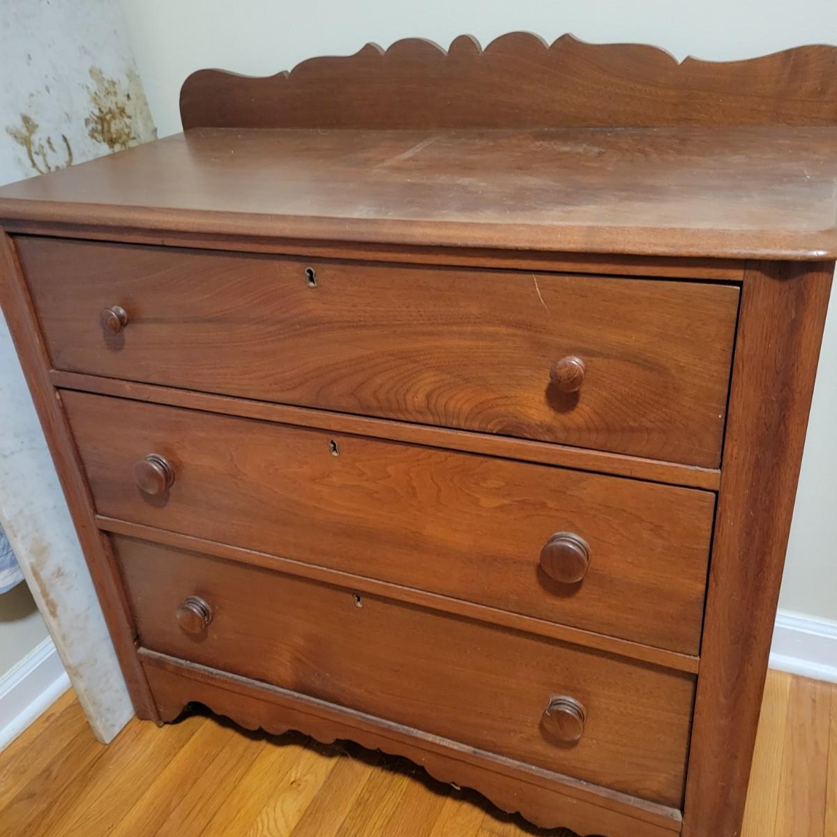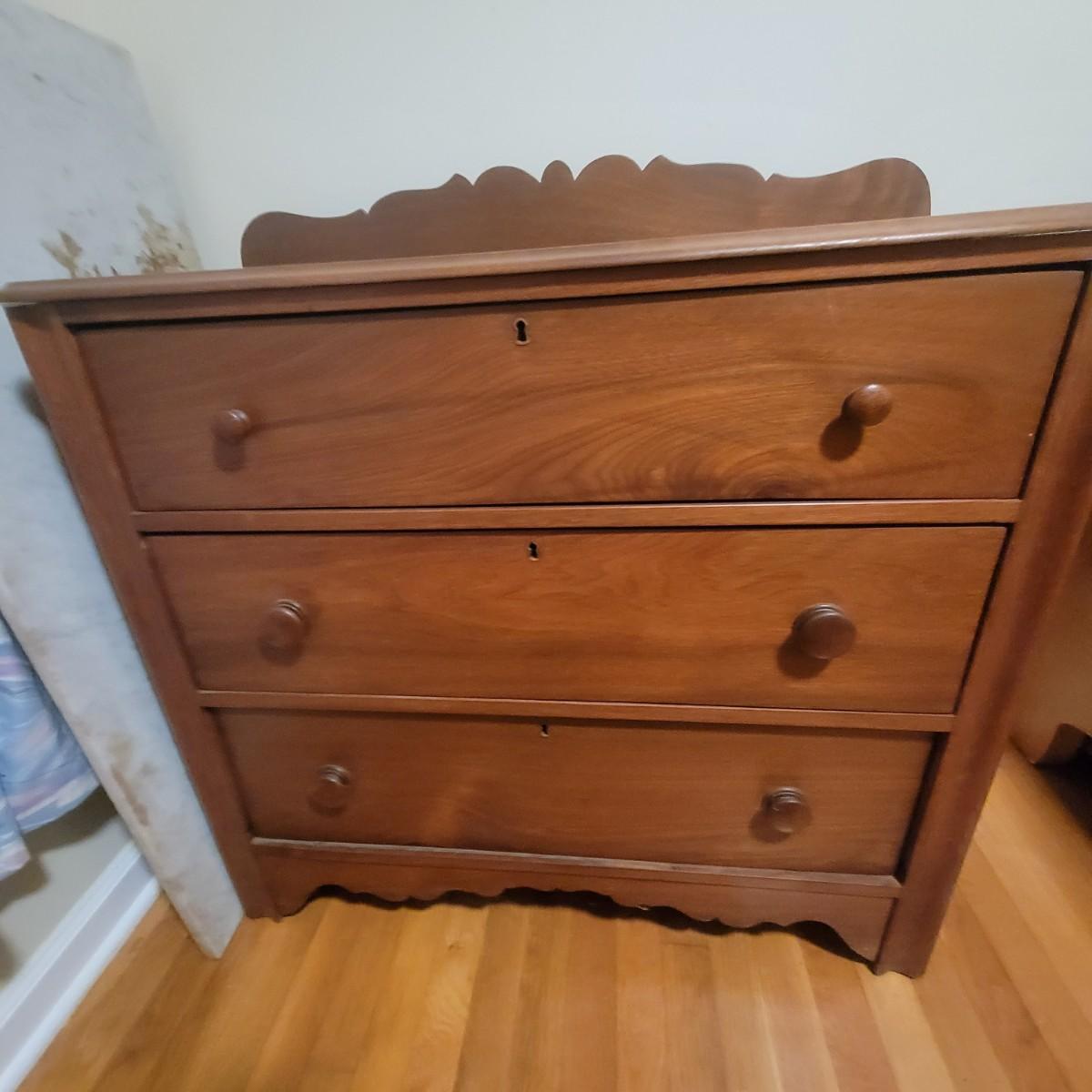 Solid wood dresser with three drawers in good condition. There are some minor blemishes, see attached pictures. Dovetailed drawers and wooden drawer handles. There is no key for locks. Does show some wear in accordance with its age. Measures approximately 36" x 18" x 36.5" Local pickup only