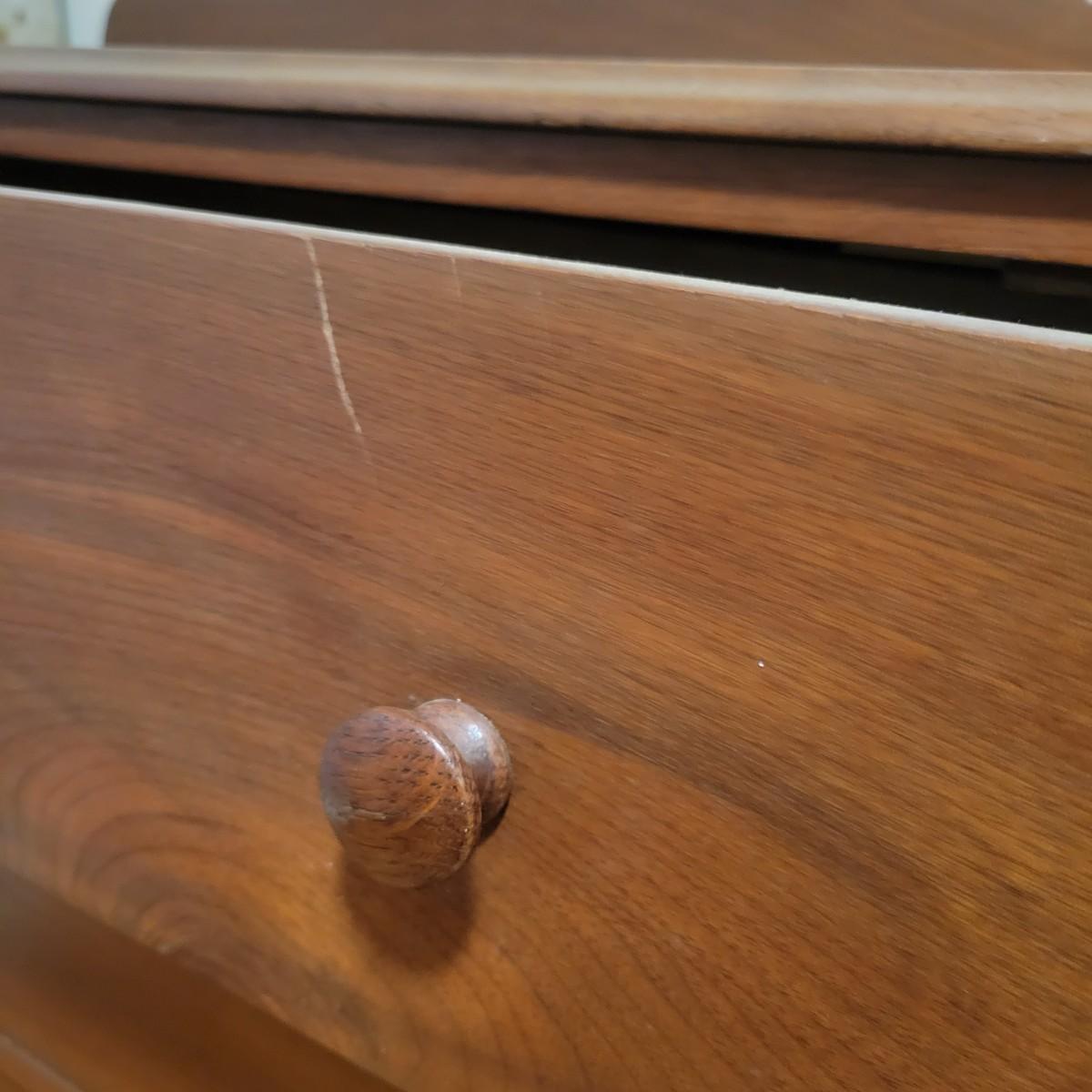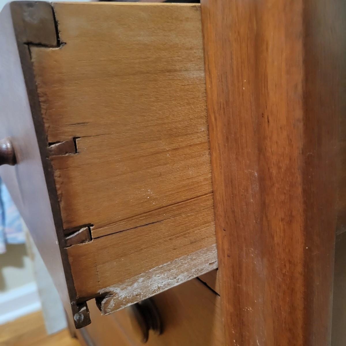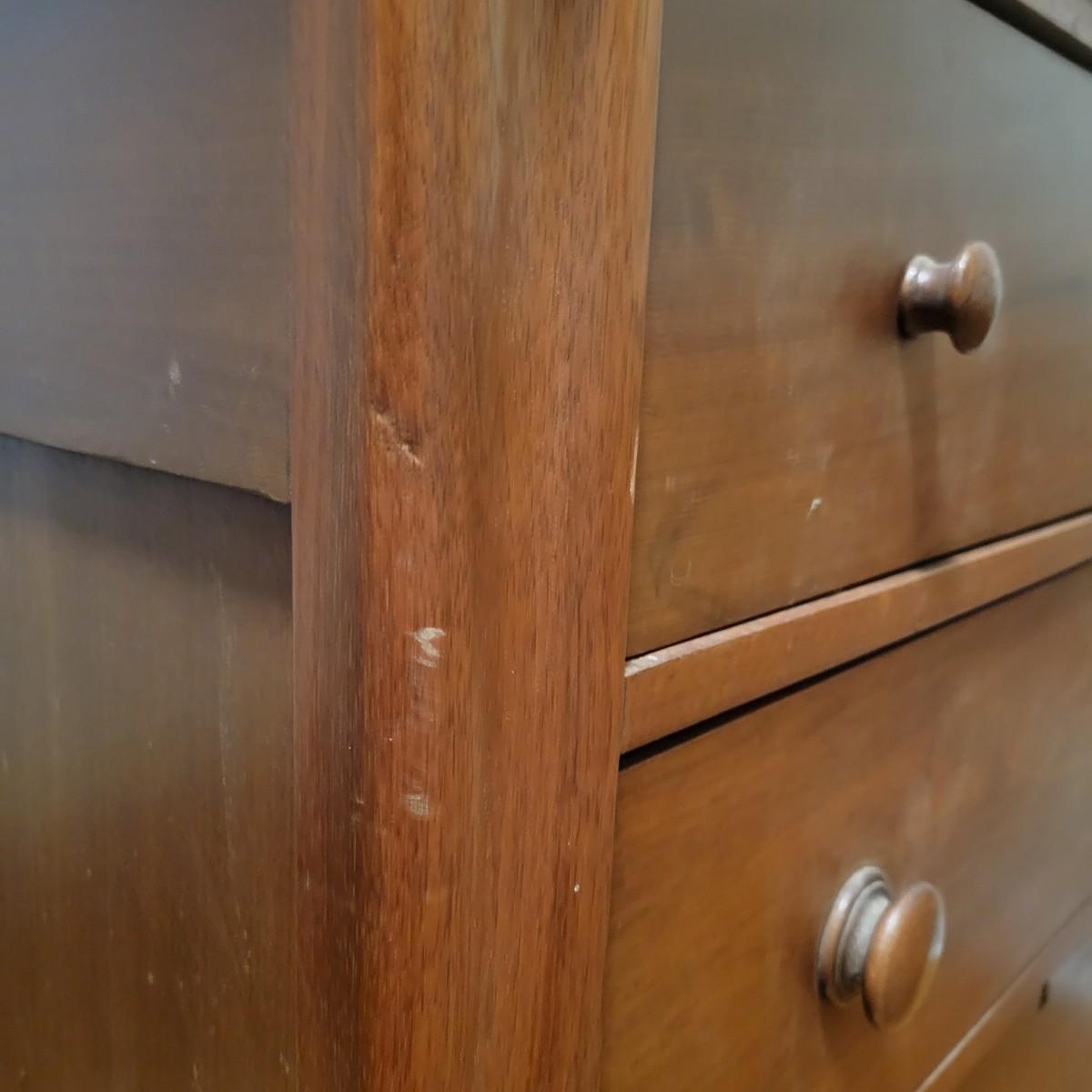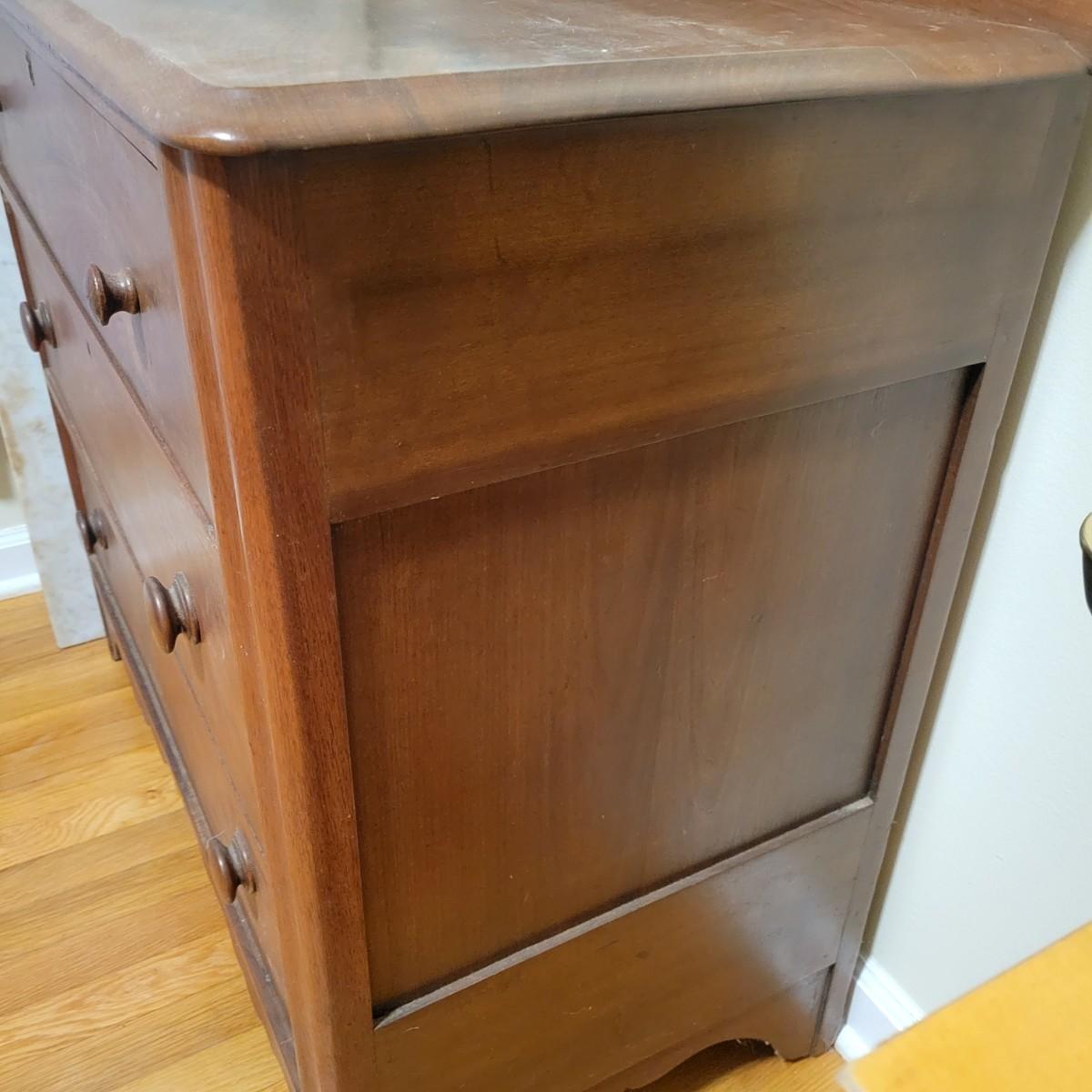 Solid wood dresser with three drawers in good condition. There are some minor blemishes, see attached pictures. Dovetailed drawers and wooden drawer handles. There is no key for locks. Does show some wear in accordance with its age. Measures approximately 36" x 18" x 36.5" Local pickup only