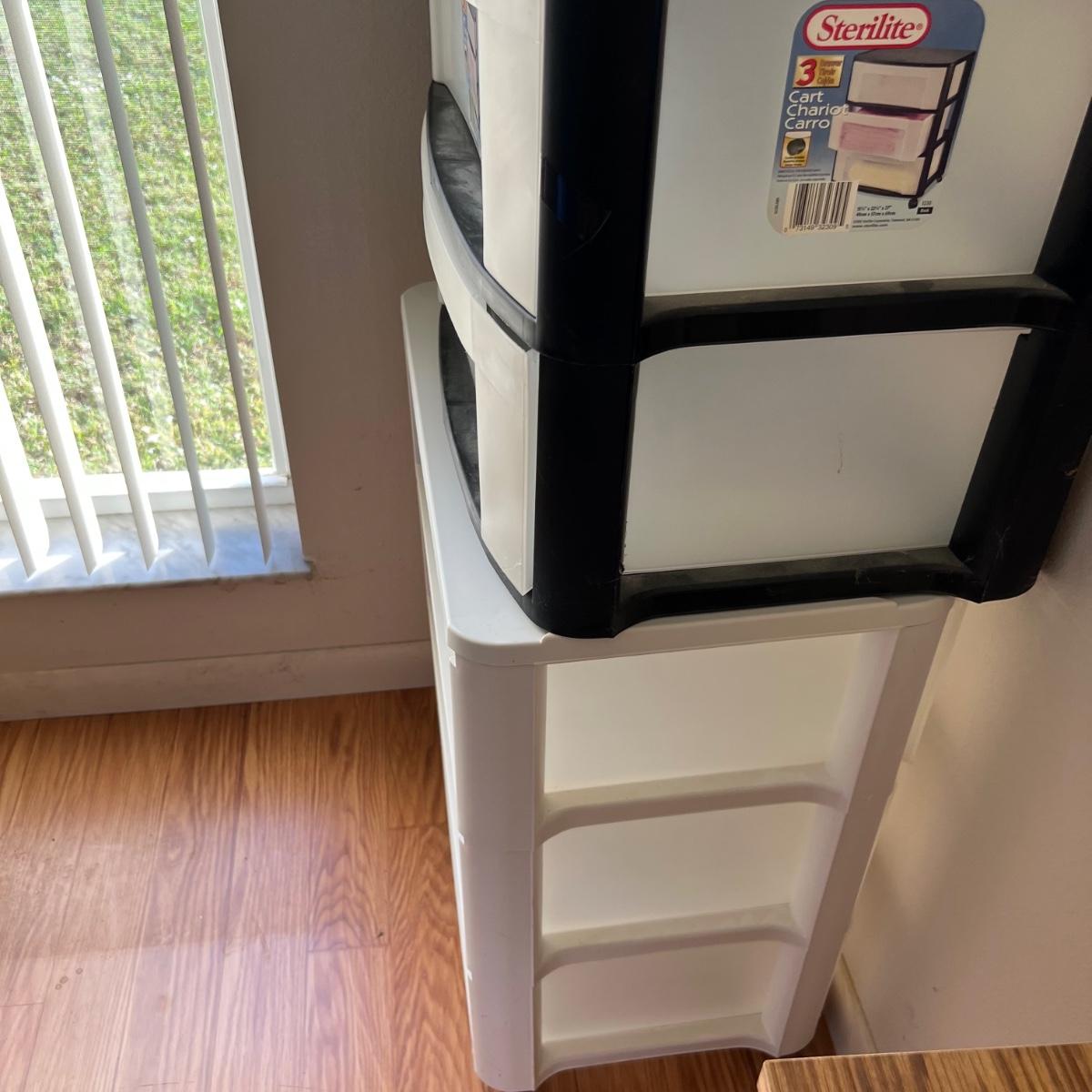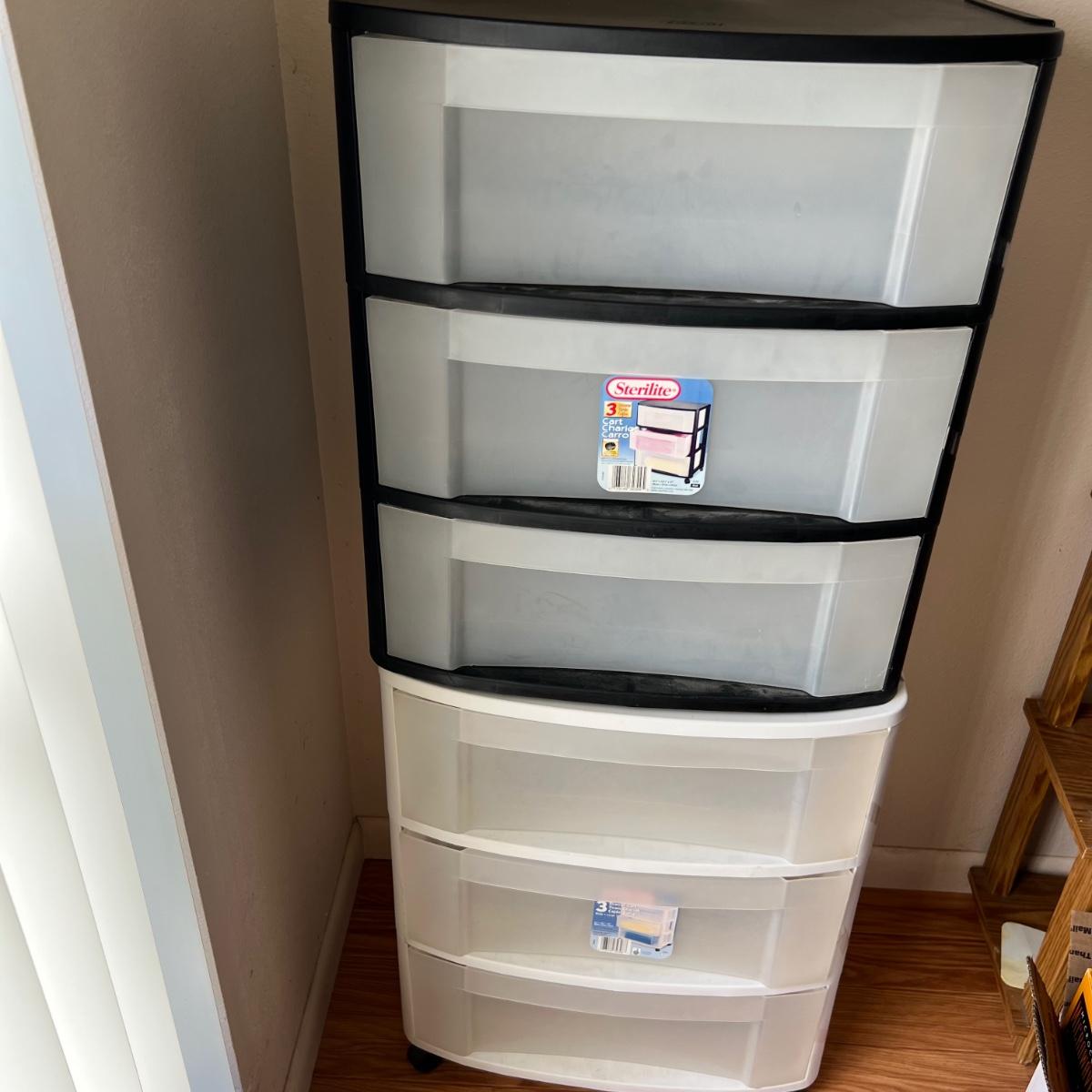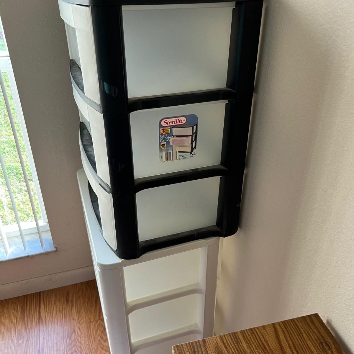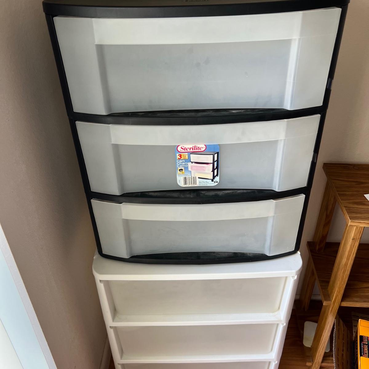 Two - Three drawer plastic containers. Both measure 22”Lx16”Wx27”H. White cart is on wheels.