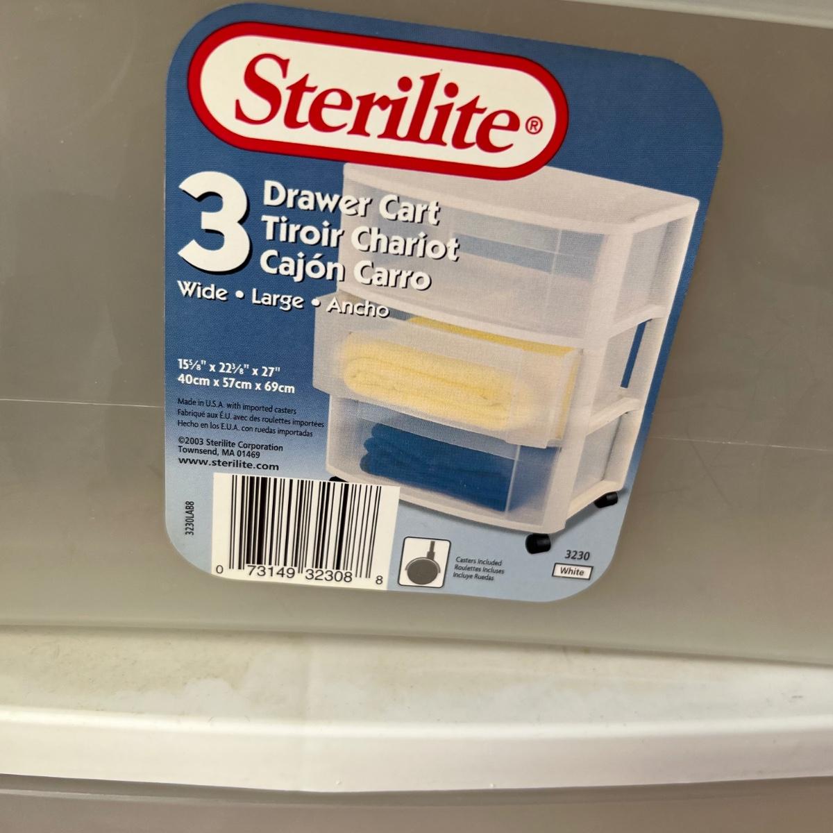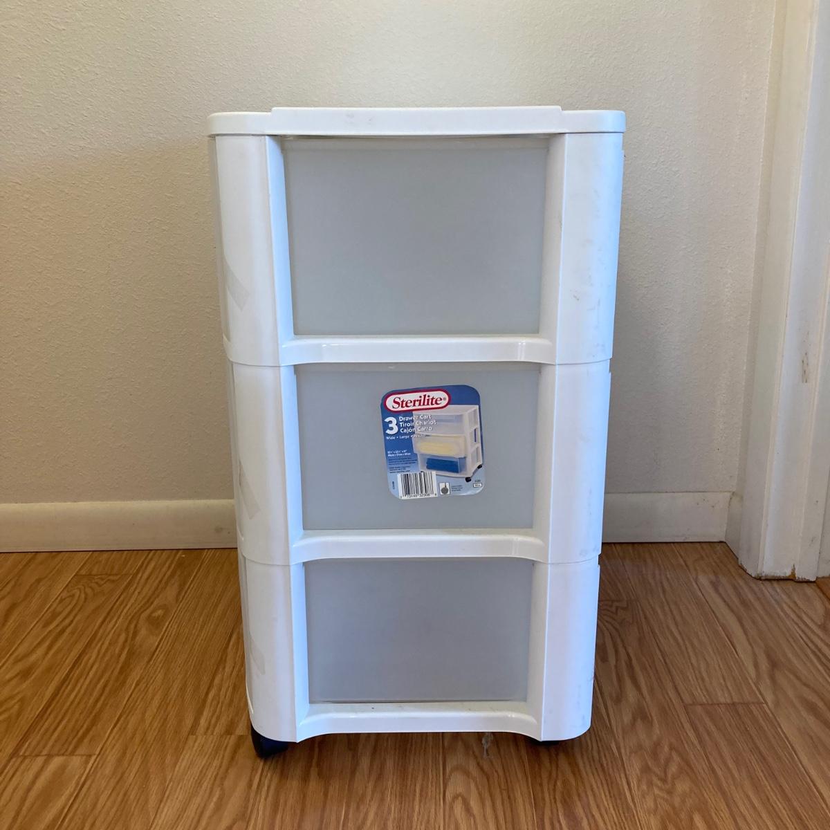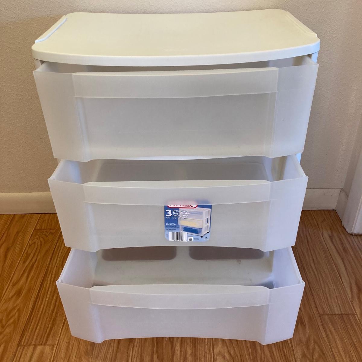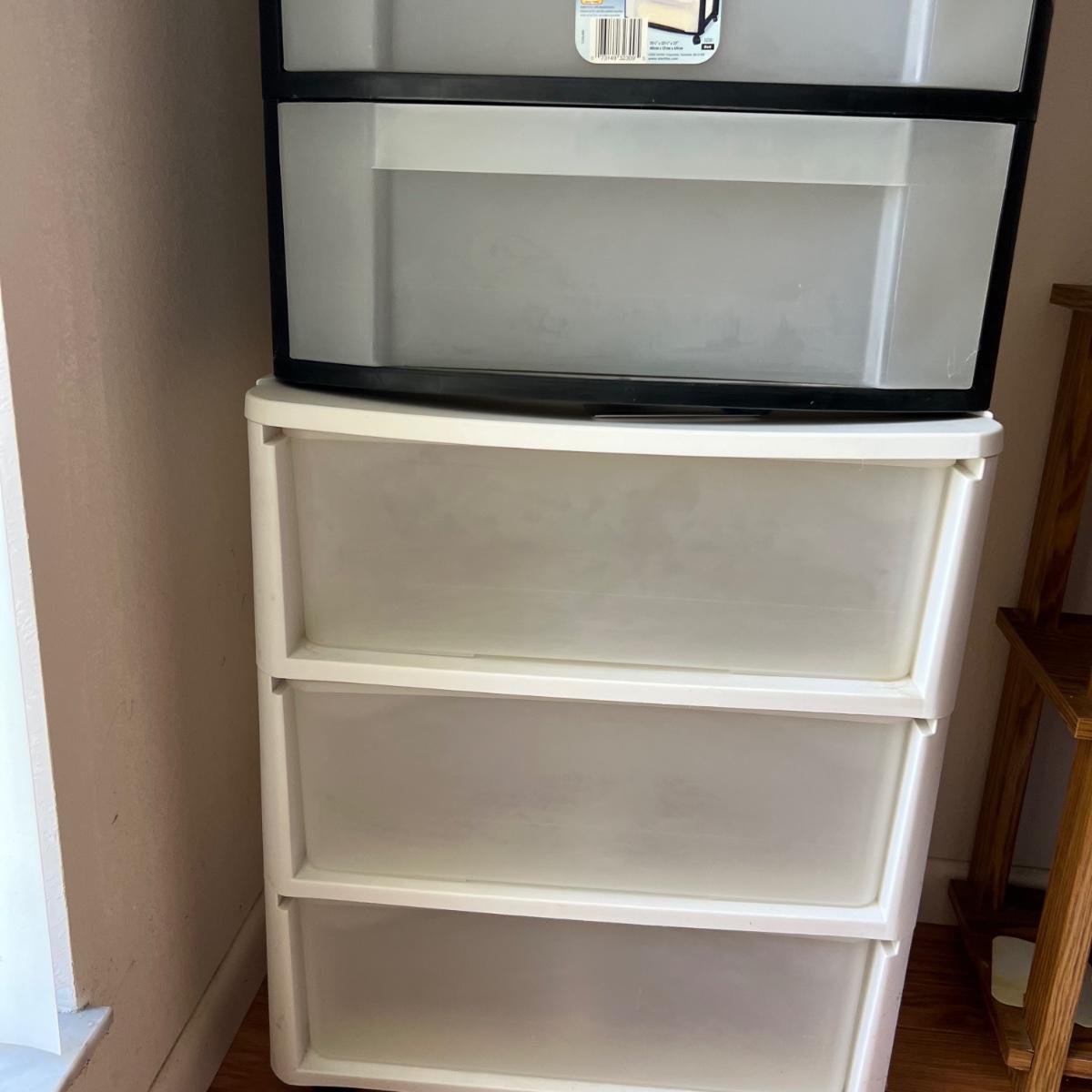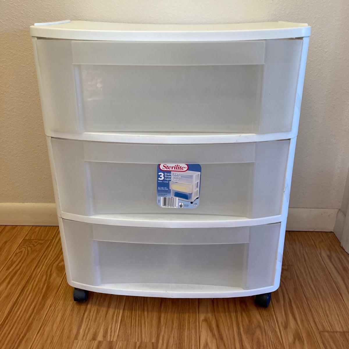 Two - Three drawer plastic containers. Both measure 22”Lx16”Wx27”H. White cart is on wheels.
