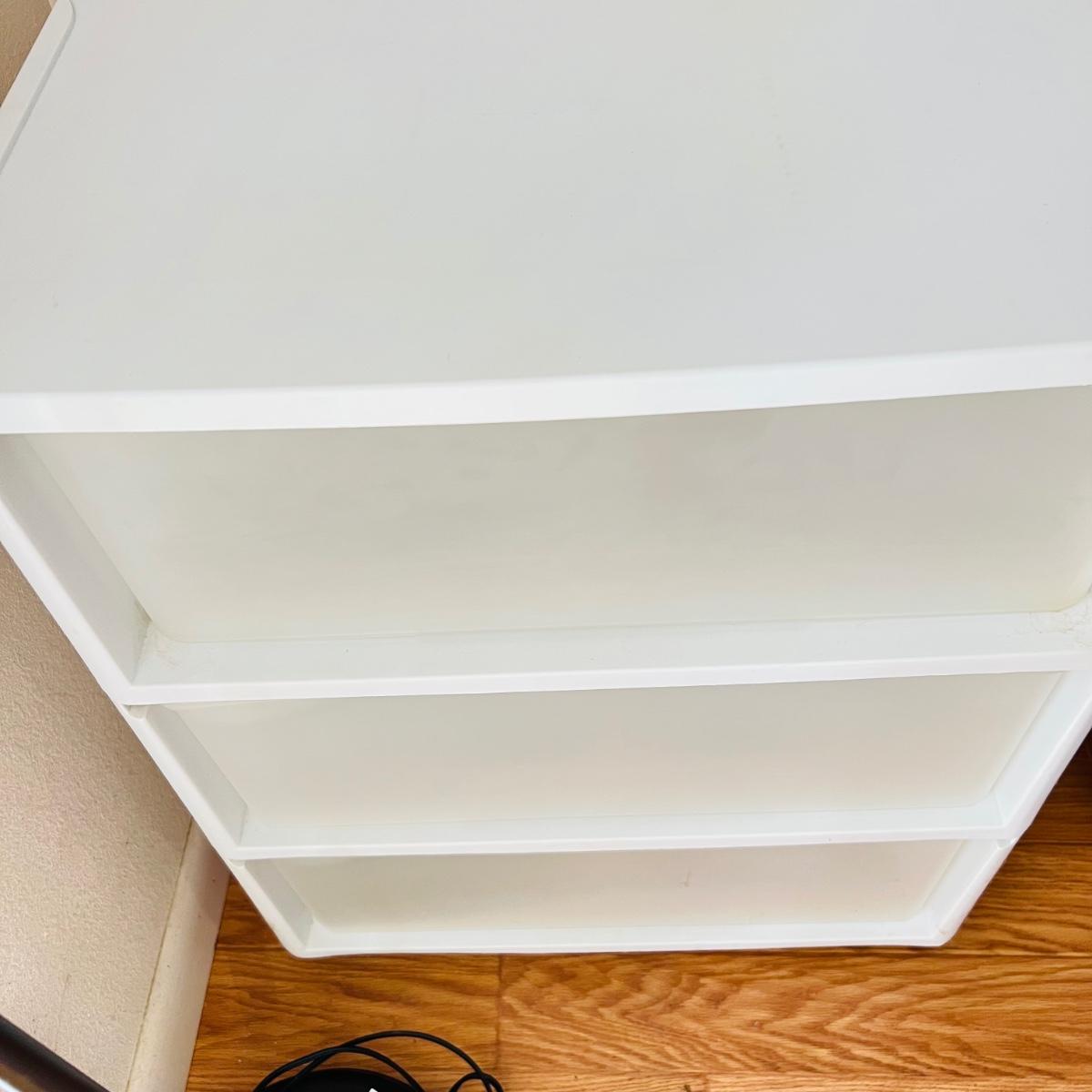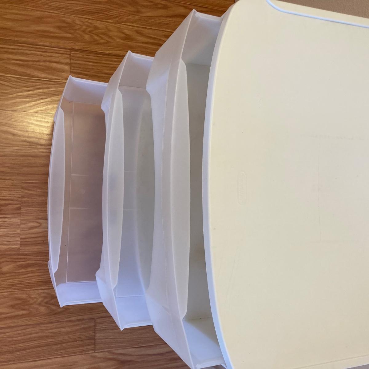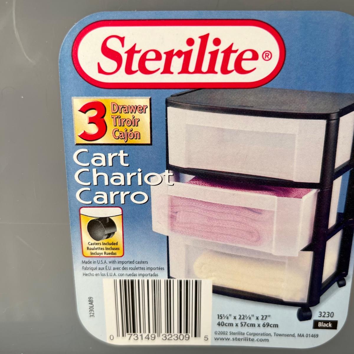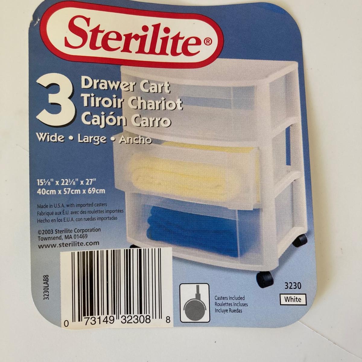 Two - Three drawer plastic containers. Both measure 22”Lx16”Wx27”H. White cart is on wheels.