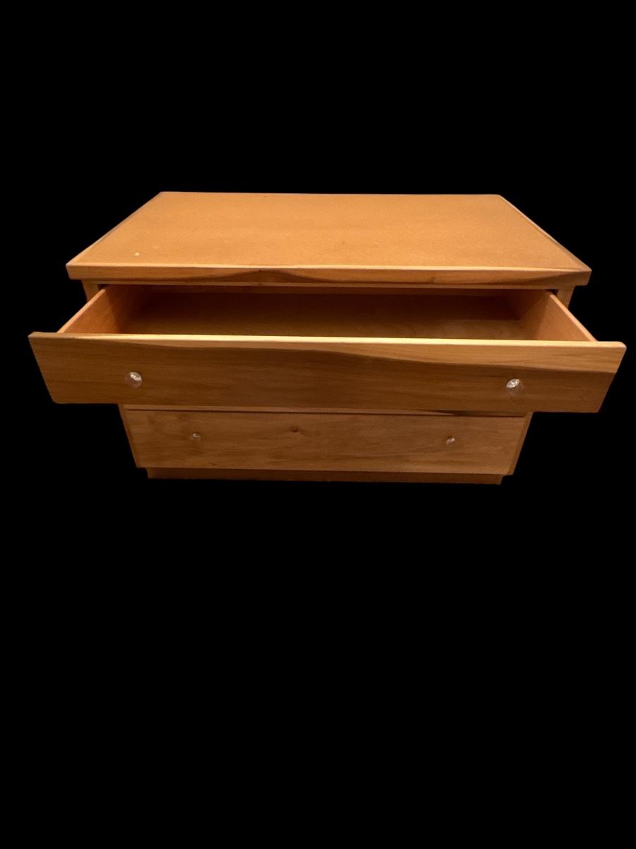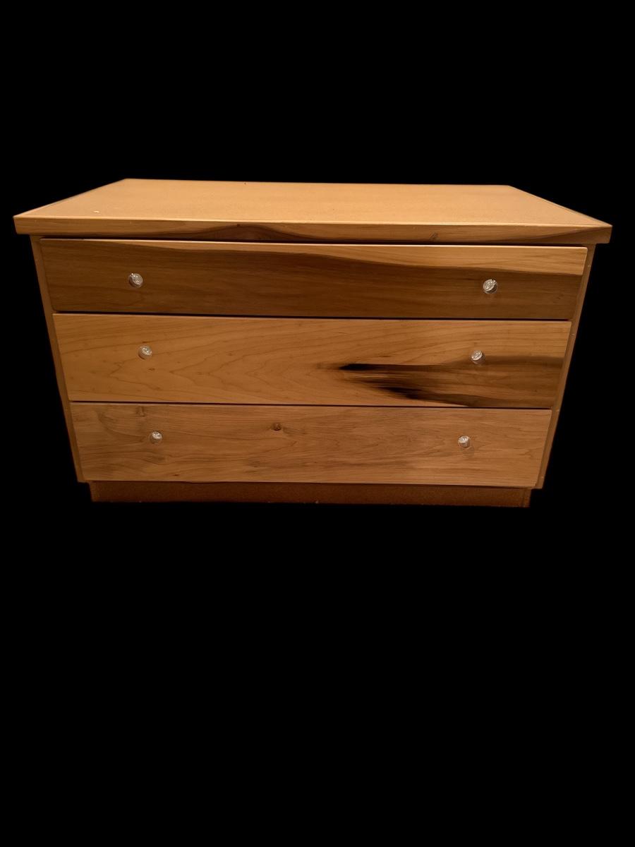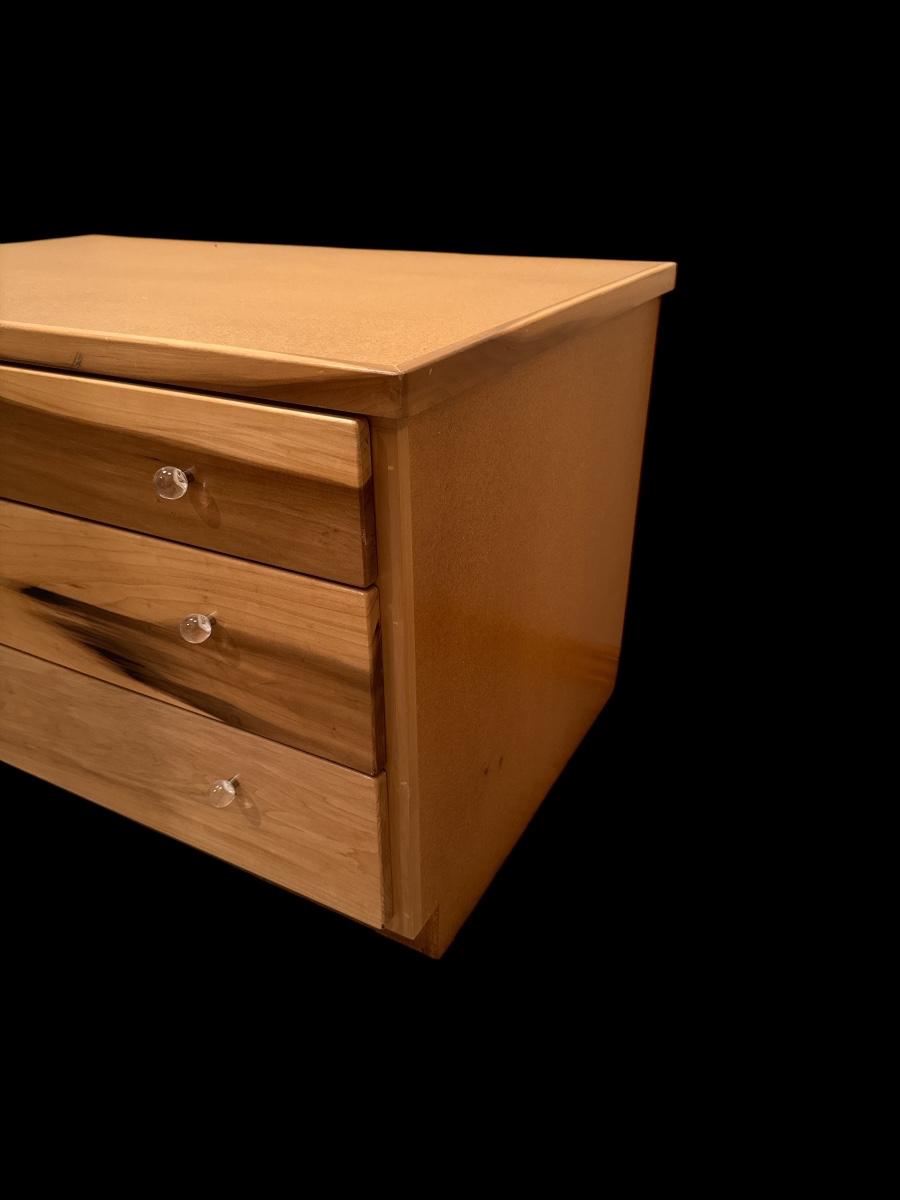Modern solid wood storage chest featuring clean lines and natural wood grain with striking variations, including a dramatic dark streak across the drawer fronts. The piece includes three spacious drawers with minimalist clear acrylic knobs. The beveled top and angled side profile add a subtle design flair.