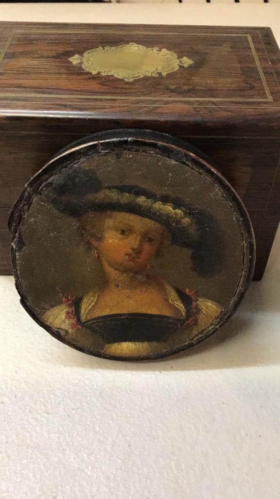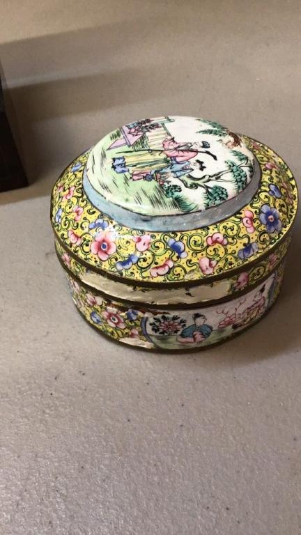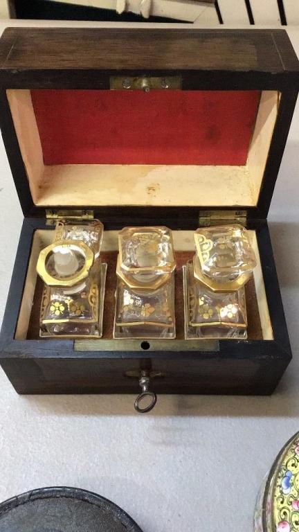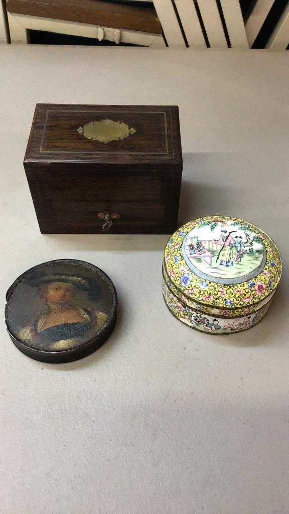 Wooden box with 3small perfume bottles, 1 broken stopper..cloisonné box with some enamel loss..round lacquer box with hand painted portrait.