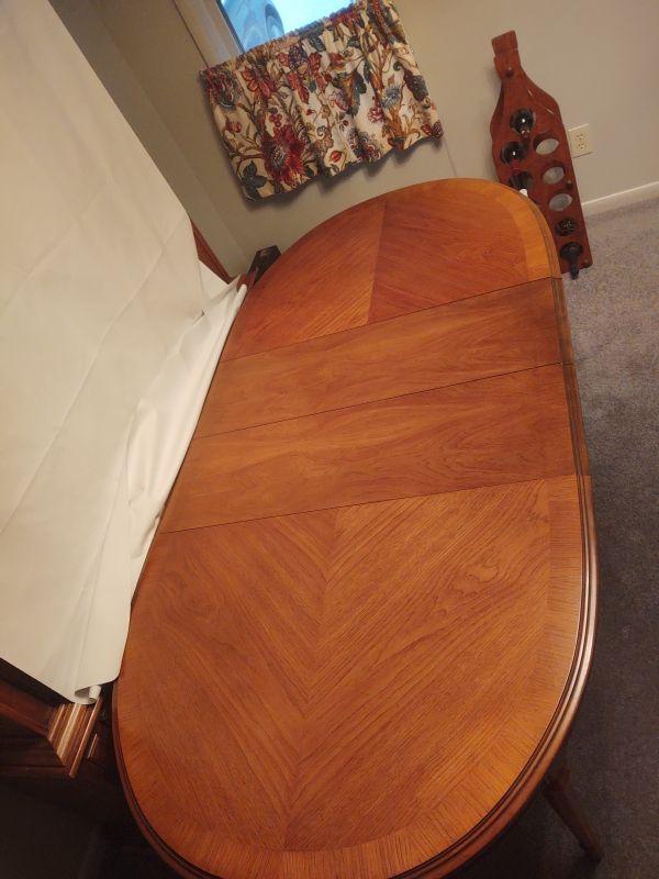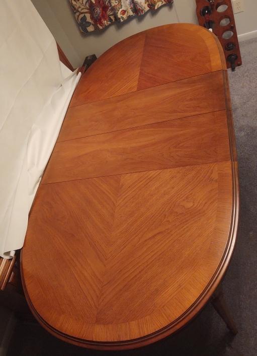 This Drexel dining room table comes with 2 leaves and protector pads expanding all 4 sections. Table with all pieces included measures 79"x40"x28".