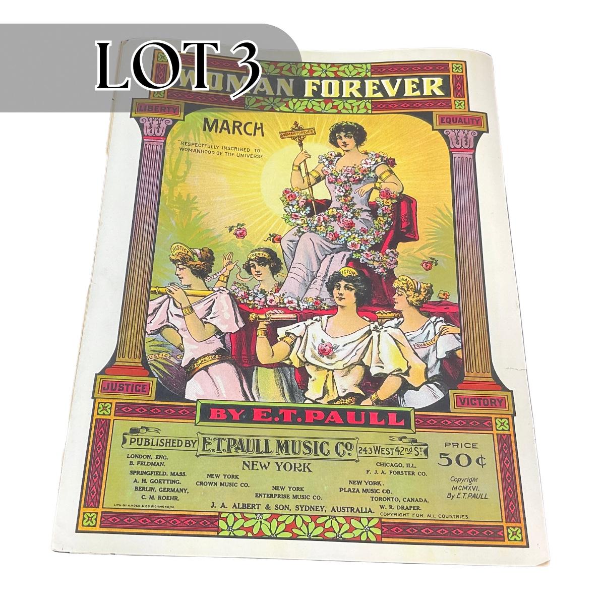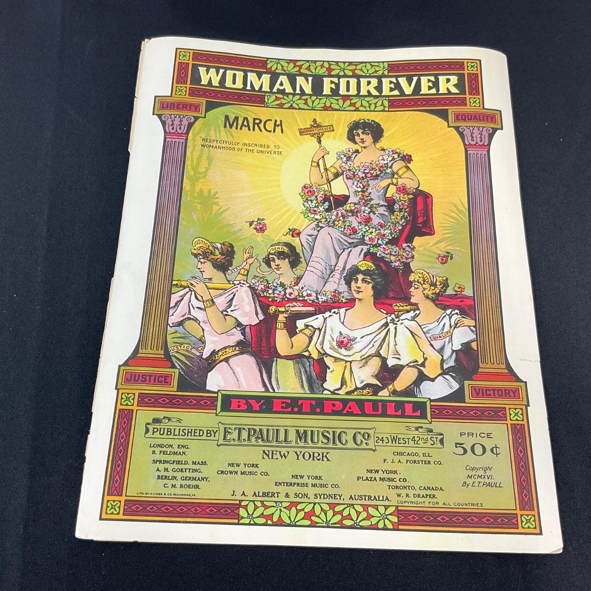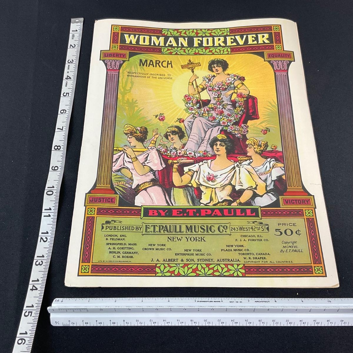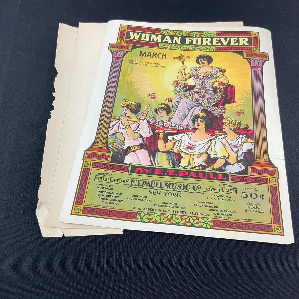 One vintage full color cover art E.T. Paul Woman Forever March by E.T. Paul. This piece Has a damaged detached cover but is otherwise complete. Please see photos for details and condition. Any condition statement is given as a courtesy to a client, is an opinion, and should not be treated as a statement of fact. Reference to condition written, oral or within a condition report shall not be regarded as a full account of condition and may not include all defects, alterations, or restorations. Absence of a condition report does not imply a lot is flawless or lacking imperfections or damage. Katherine’s Auction & Appraisal Service shall have no responsibility for any error or omission. Returns shall not be accepted on the basis of condition. ::: Shipping is available on this lot. If you require shipping you must let us know at the close of the auction. We will coordinate with you after the item has been won. Shipping fees will include insurance up to or exceeding the value of all items being mailed. If you have any questions regarding this lot please contact the auctioneer either via this website, by direct email or by phone. PICK UP TIMES and other important information can be found in the TERMS and DESCRIPTION of the auction. Please take a look for pertinent information. Thanks!