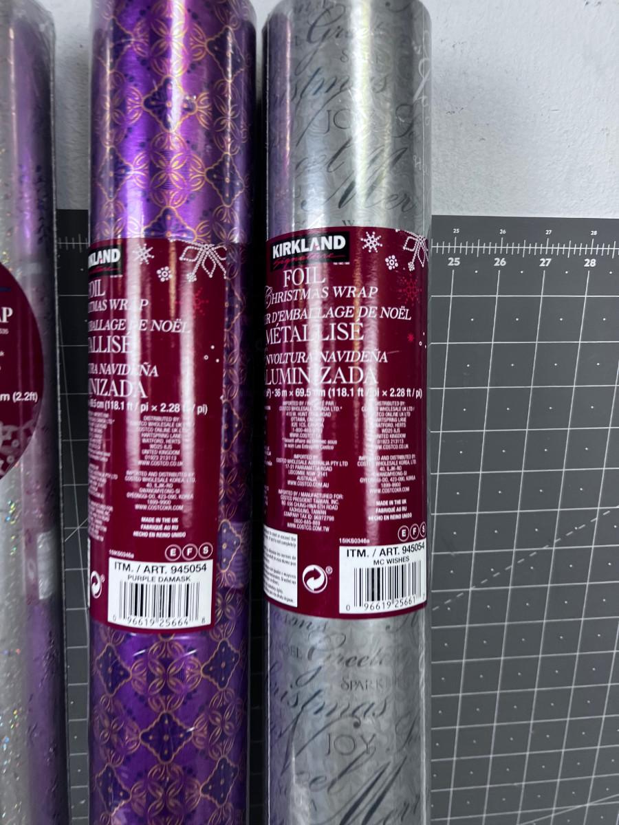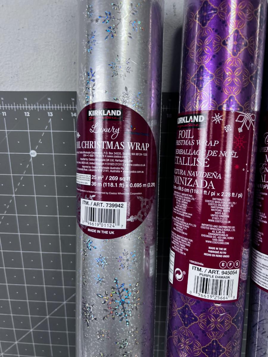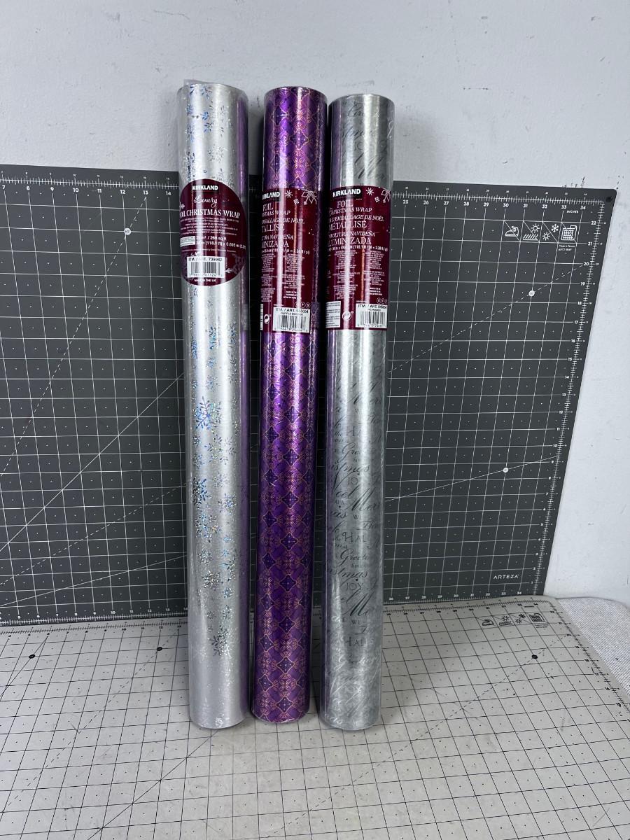 3 EXTRA Large Rolls of NEW 118 feet each X-mas WRAP NEW Silver (2) and (1) Purple
