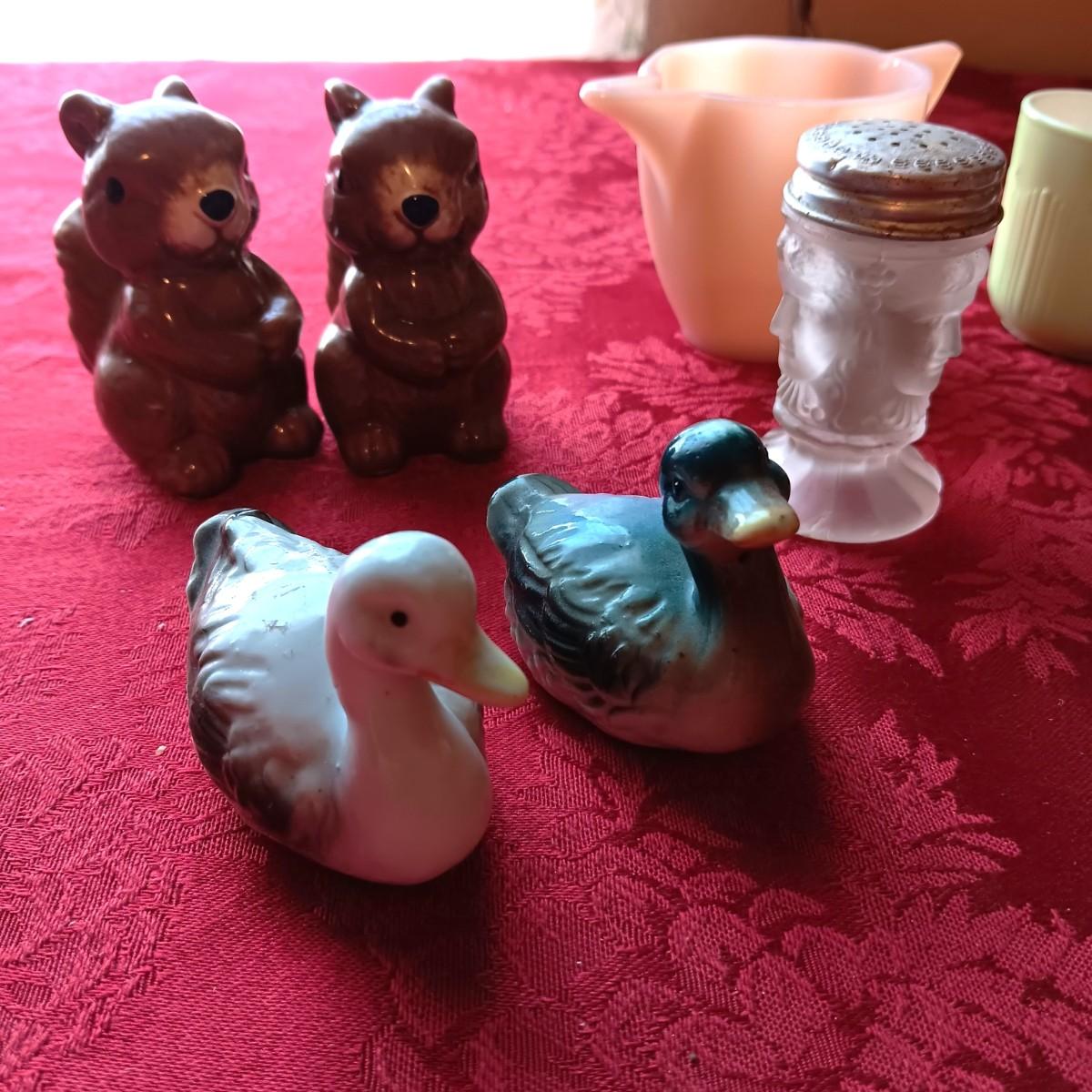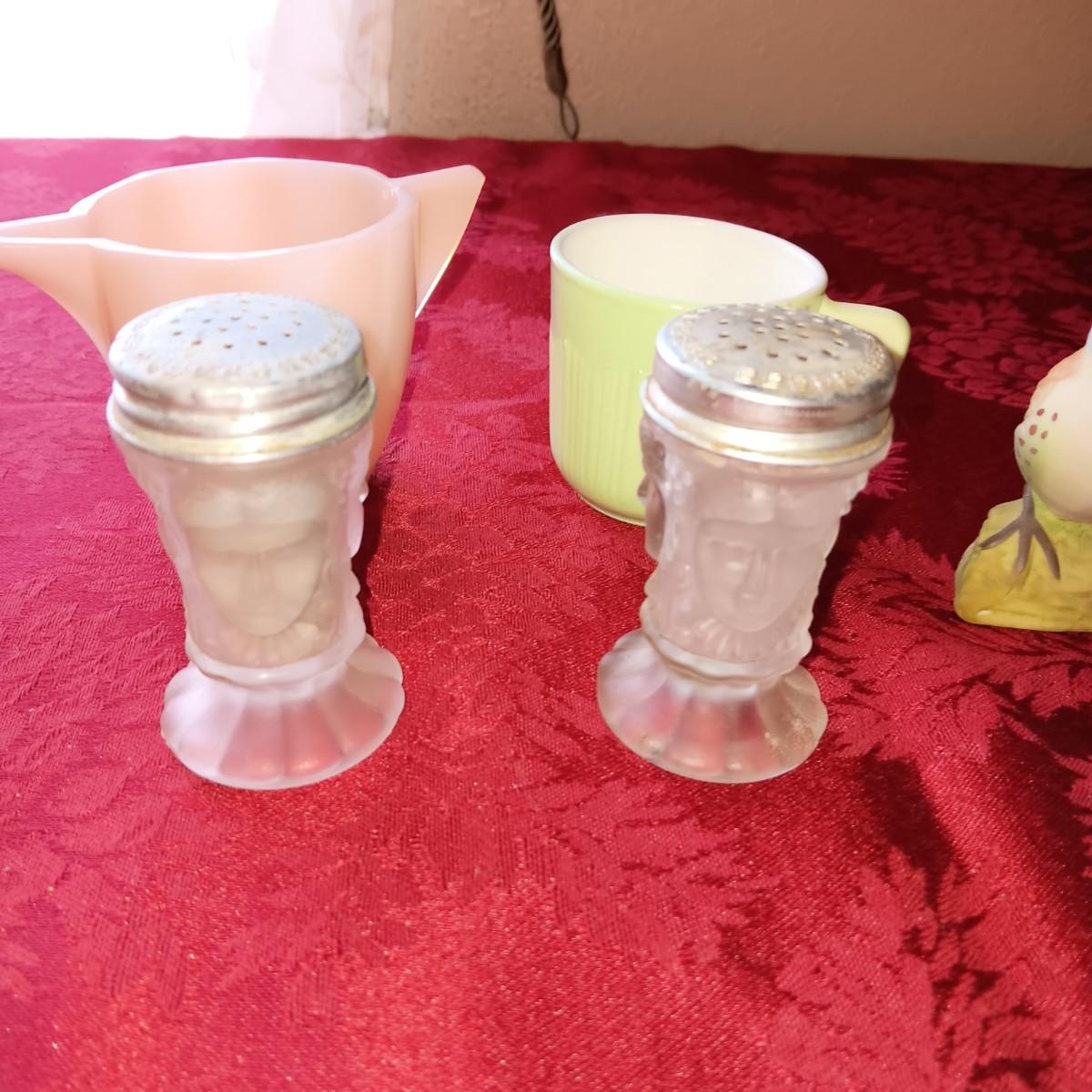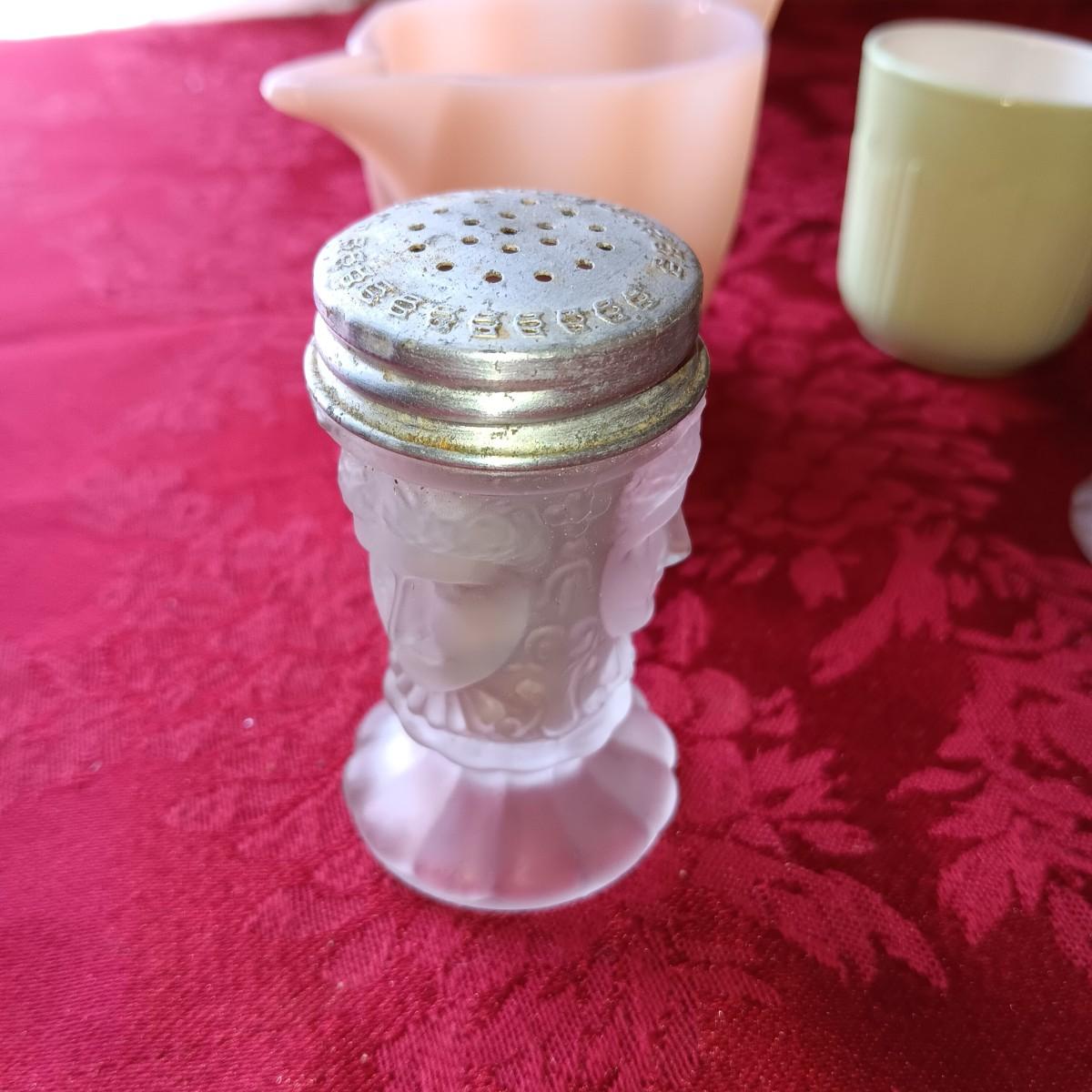 3 FACE SATIN GLASS SHAKERS PLUS OTHER VINTAGE SHAKERS