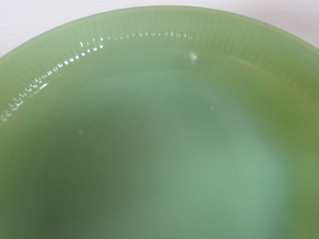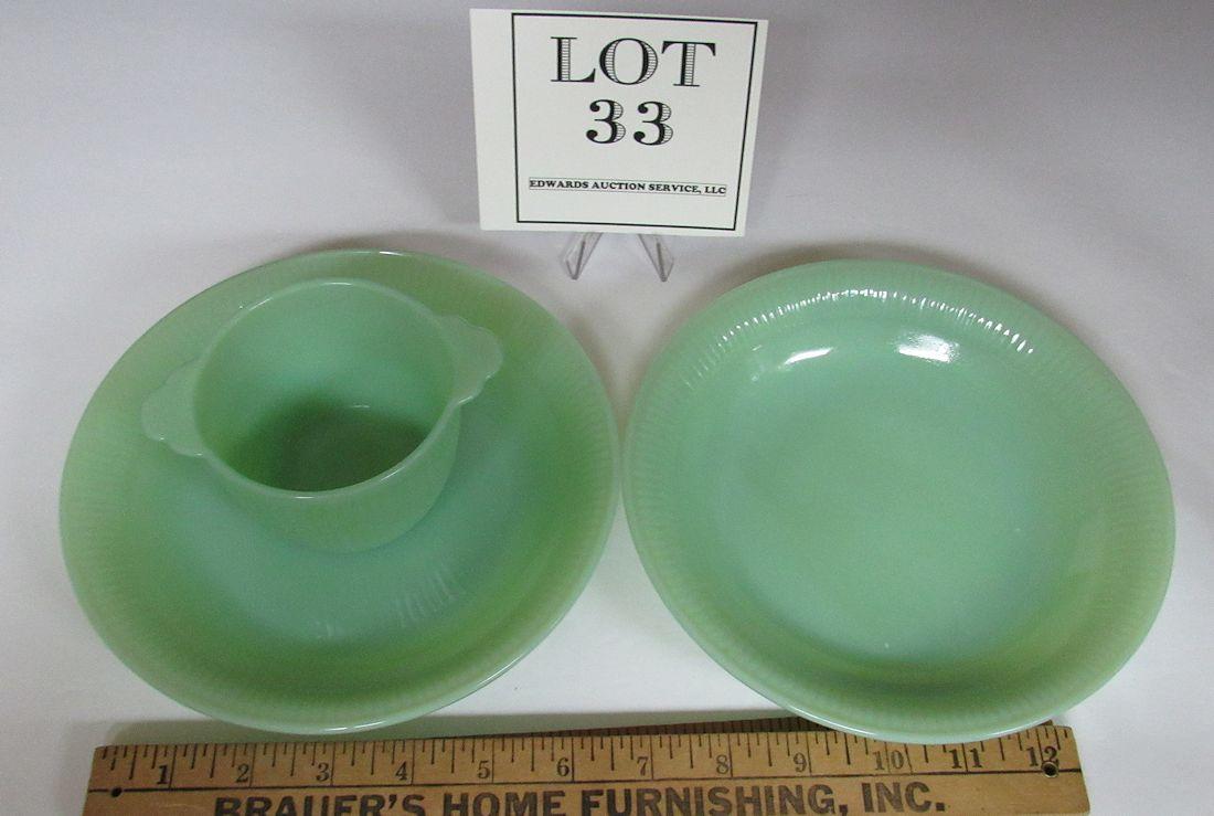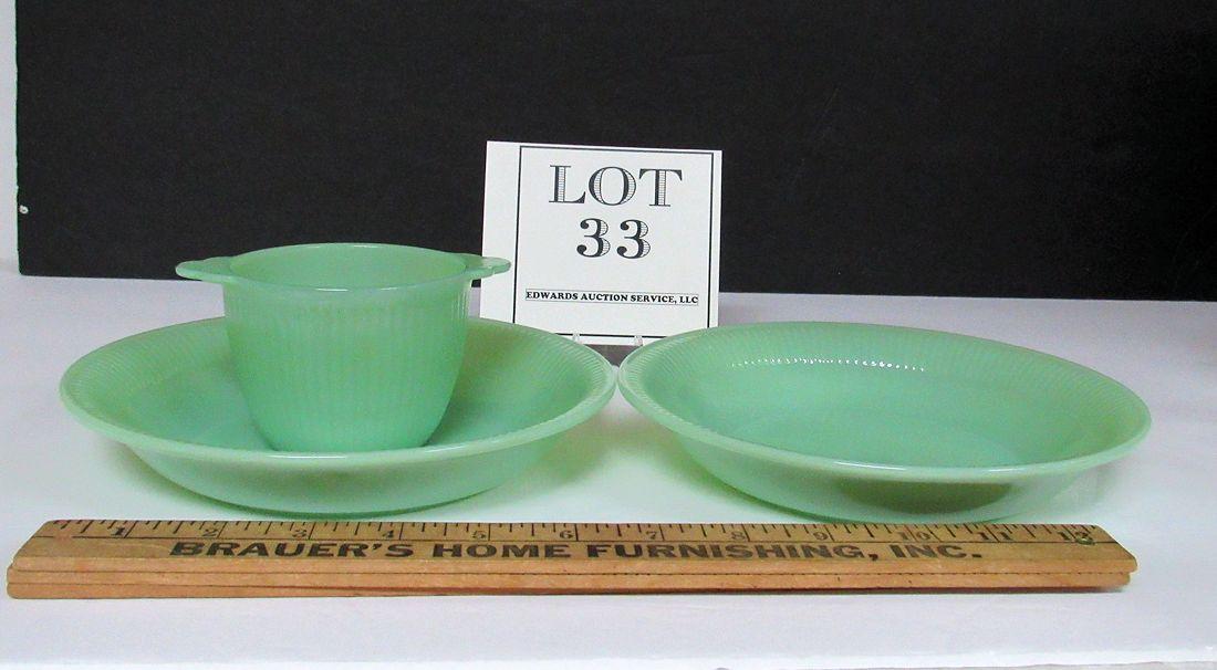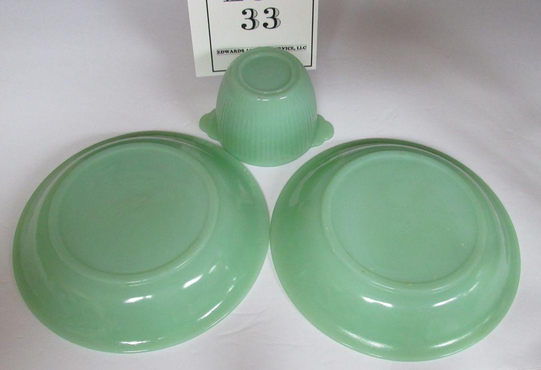 3 Fire King Jane Ray Jadite Pieces, 2 Soup Bowls, 1 Sugar Bowl