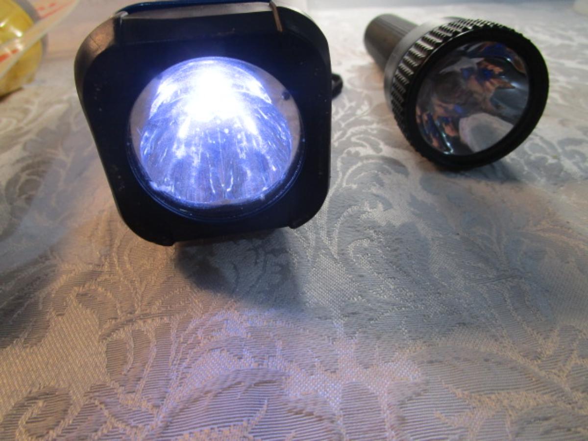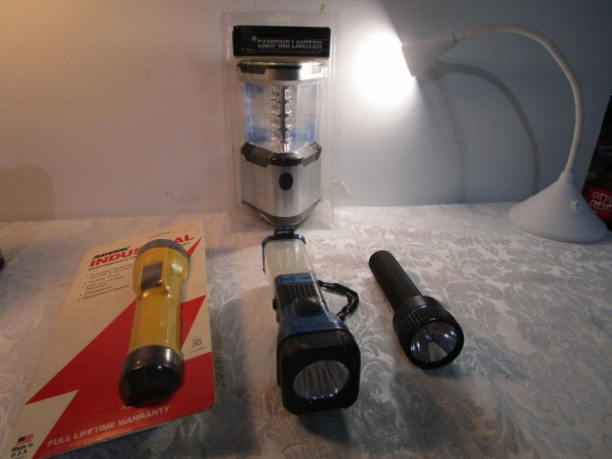 3 flashlights (one is dual), 1 LED lantern with compass