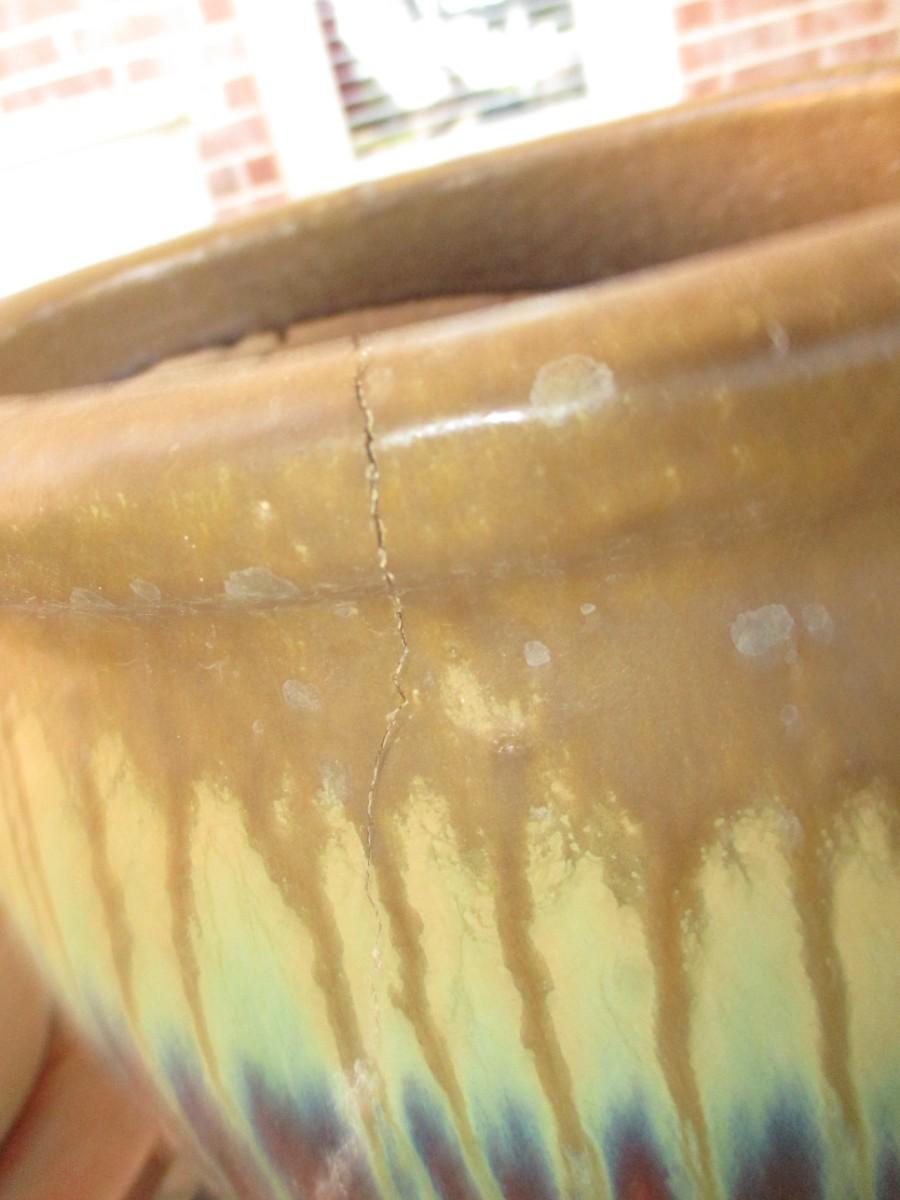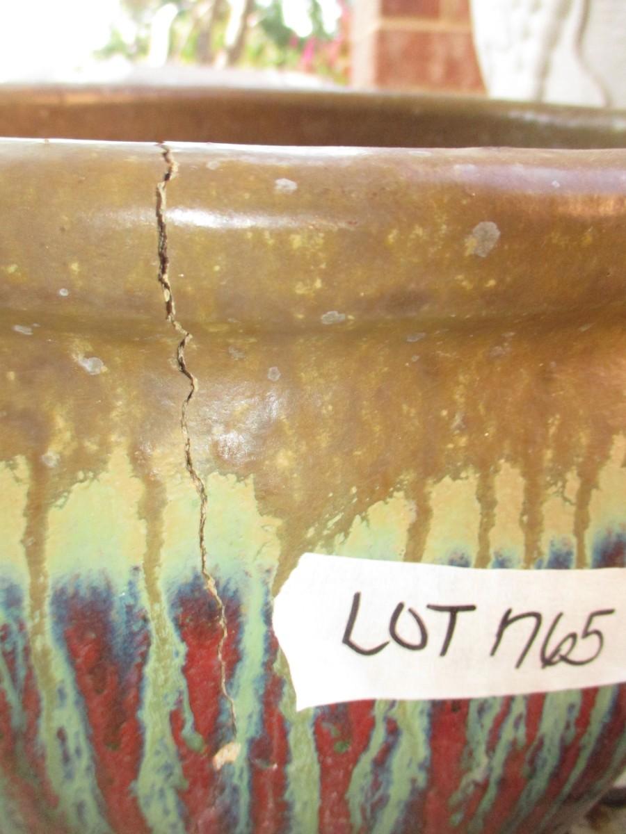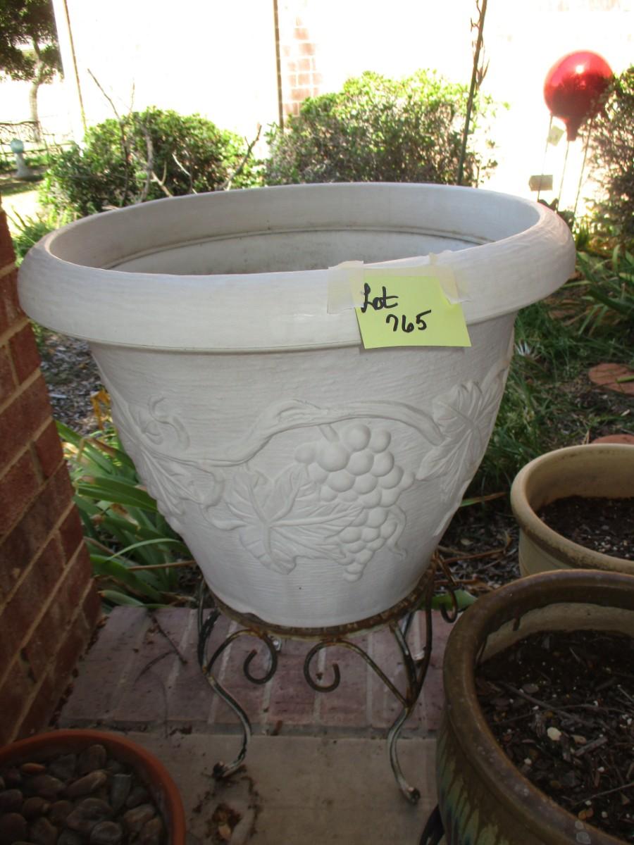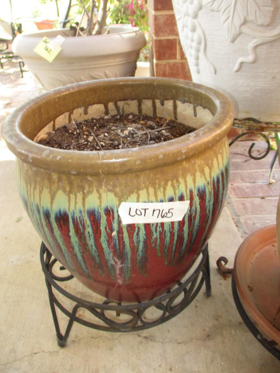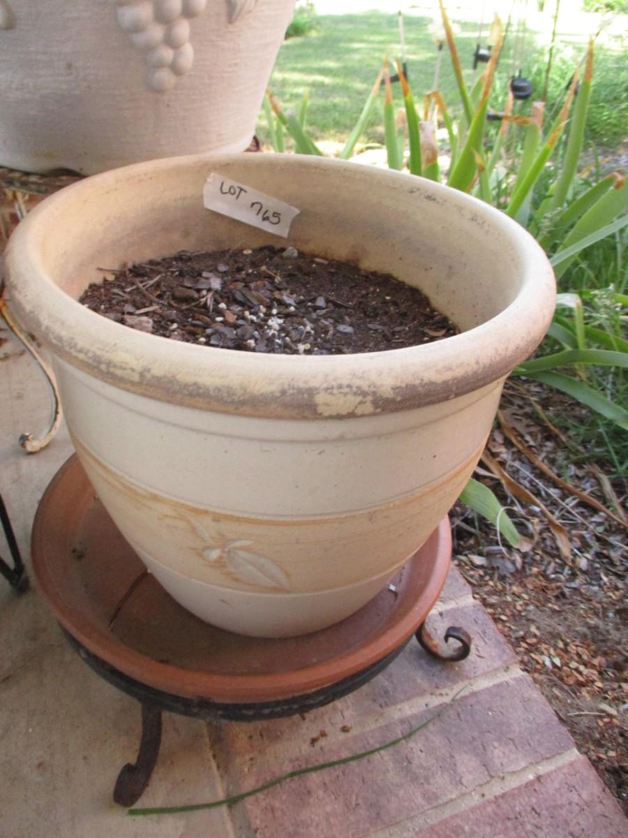 Saucer with rocks Not Included. Brown ceramic pot has cracks, Large plastic flower pot, 3 stands