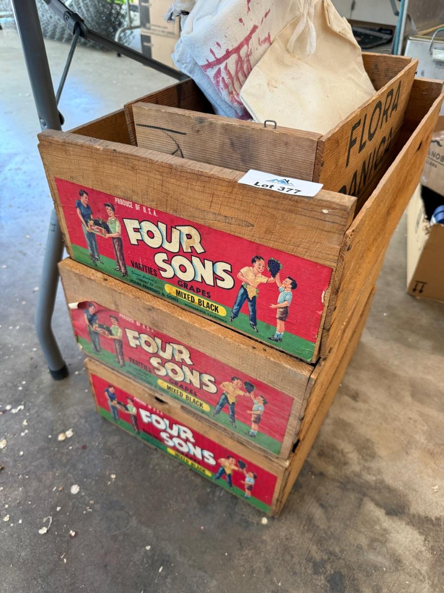 3 Four Sons Wood Grape Crates & 1 other & bags