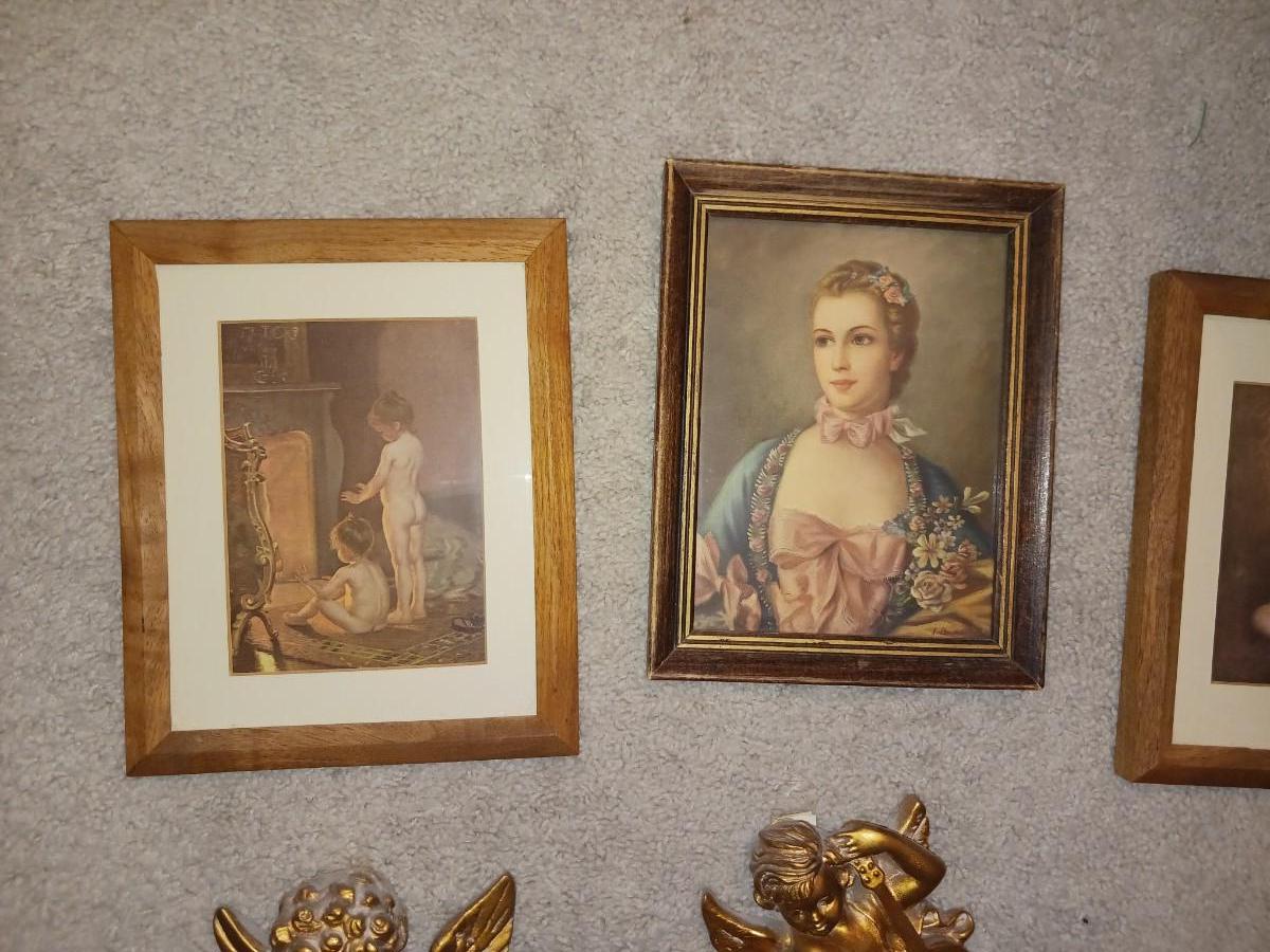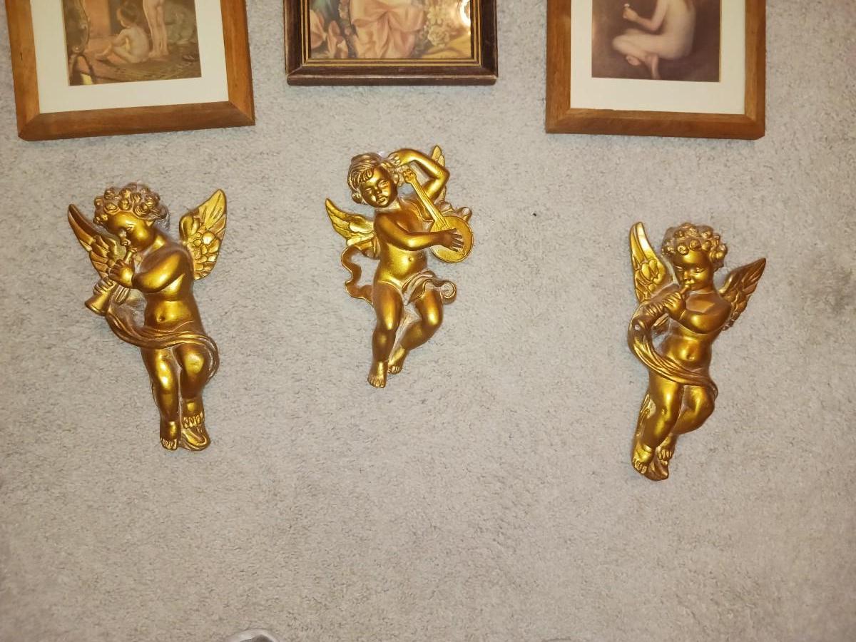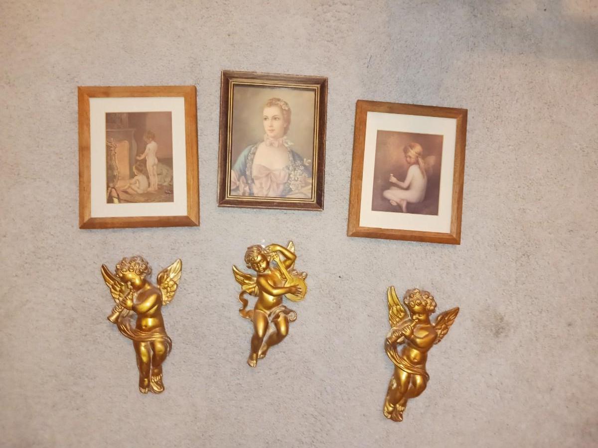 3 FRAMED PICTURES AND 3 WALL HUNG CHERUBS