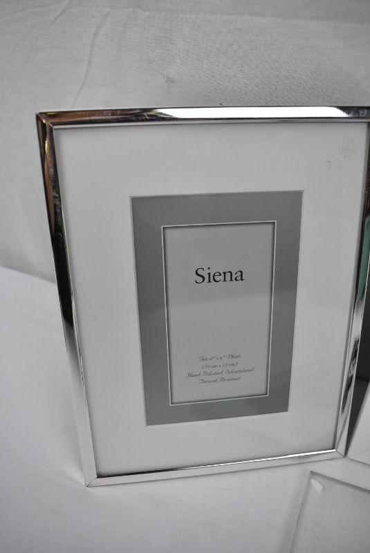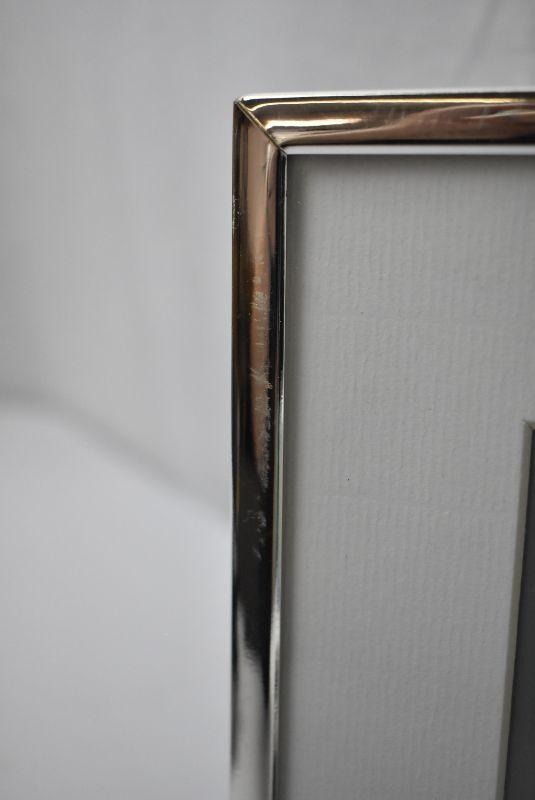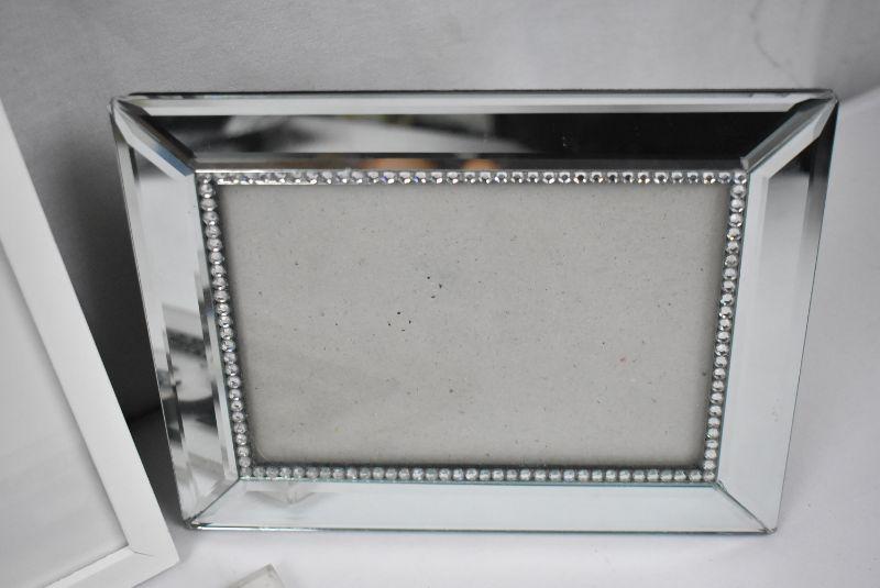 3 Frames: Silver with White Matt 4x6 small scuffs. Mirrored 5x7, both with velvet backing. White 11x14 with 8x10 mat