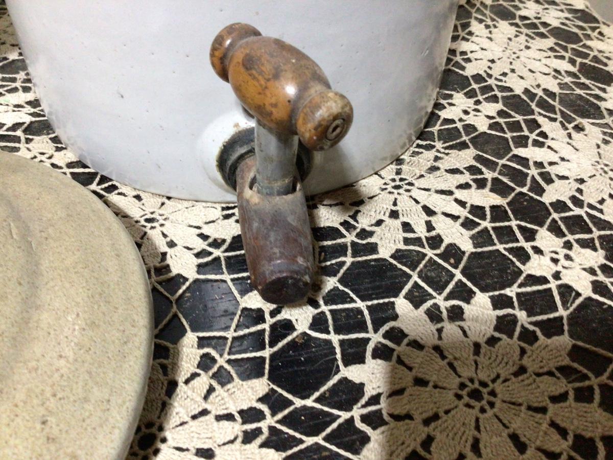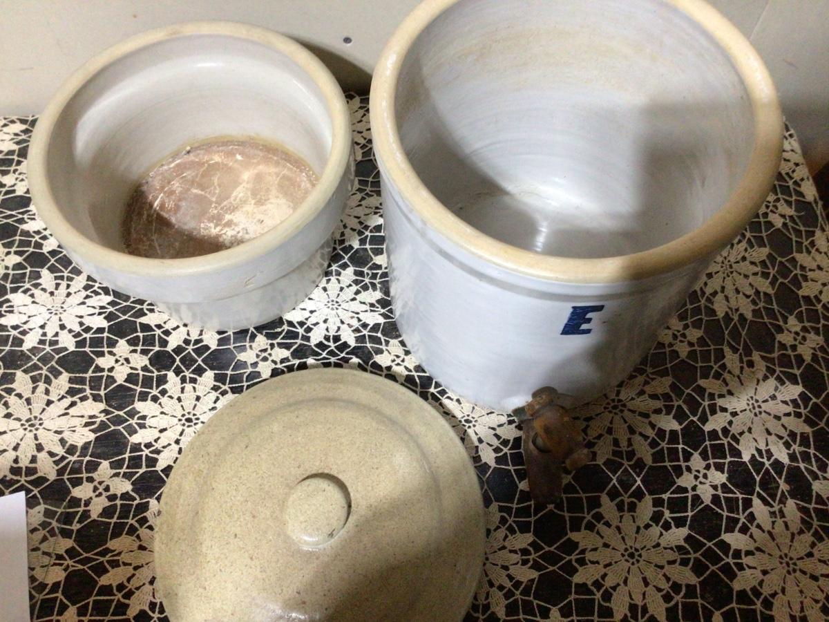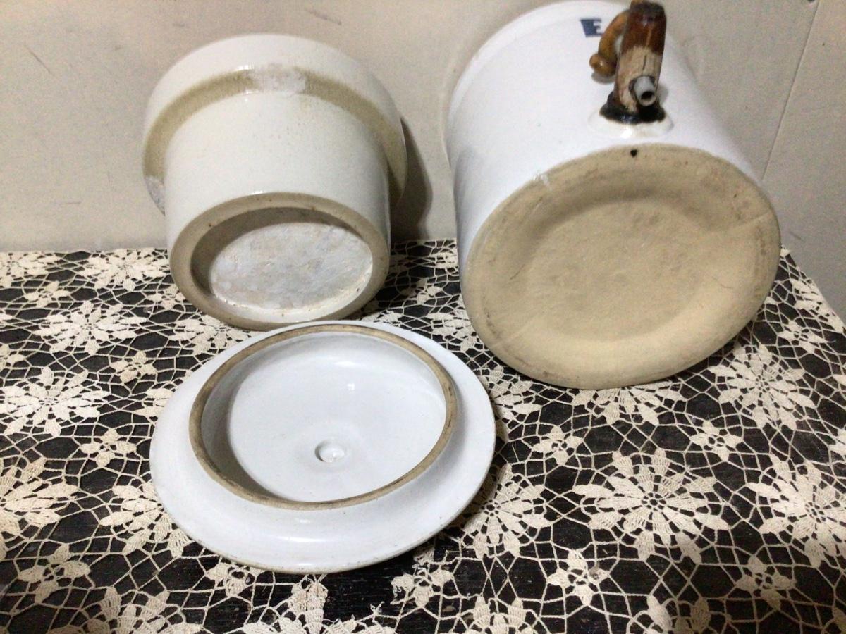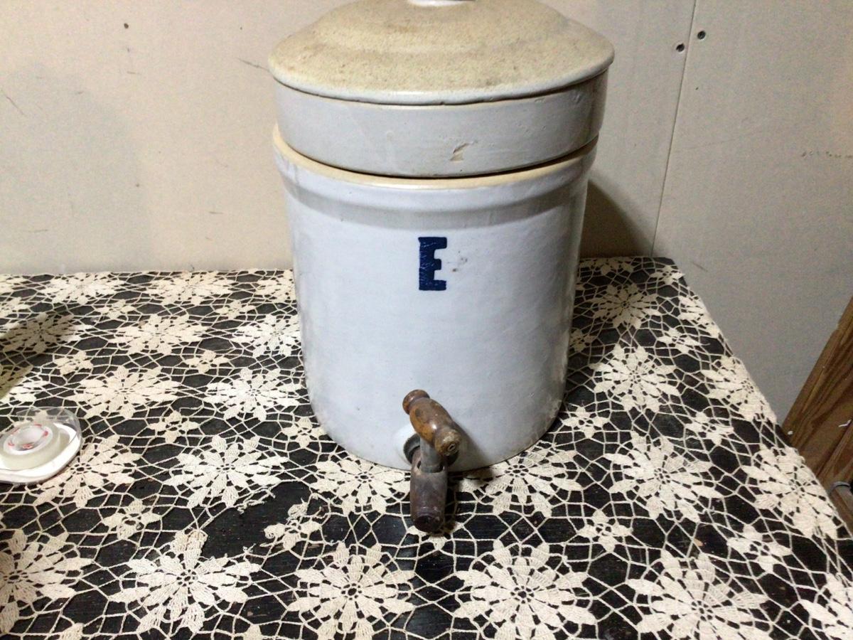 This is a great 3 Gal crock water dispenser with ice compartment. It has the lid and a wood spicket. All in great condition.
