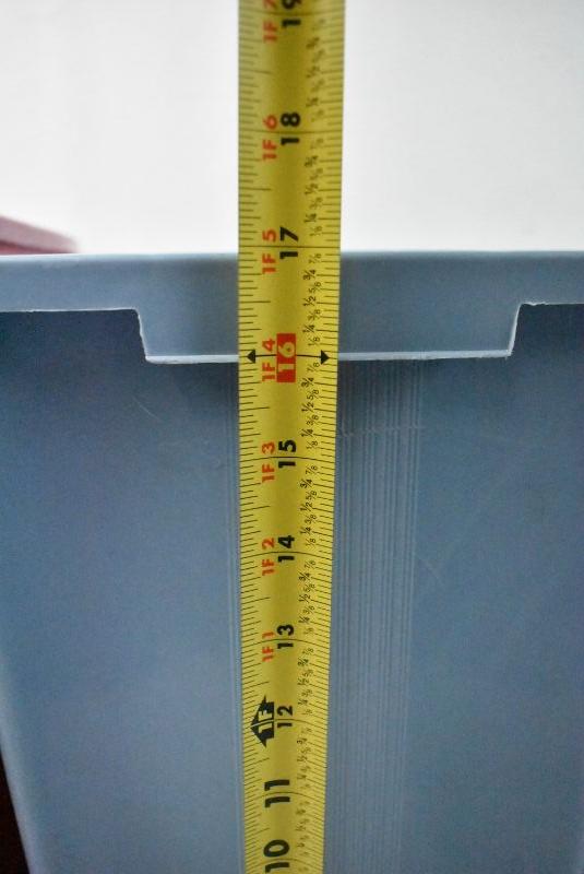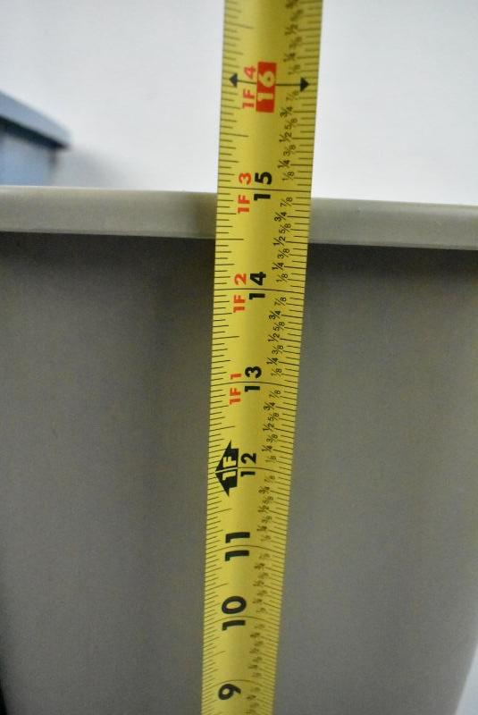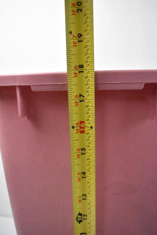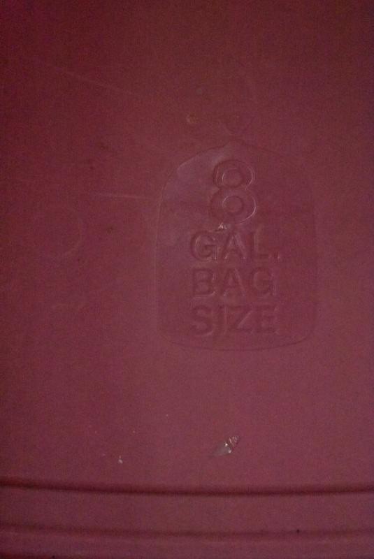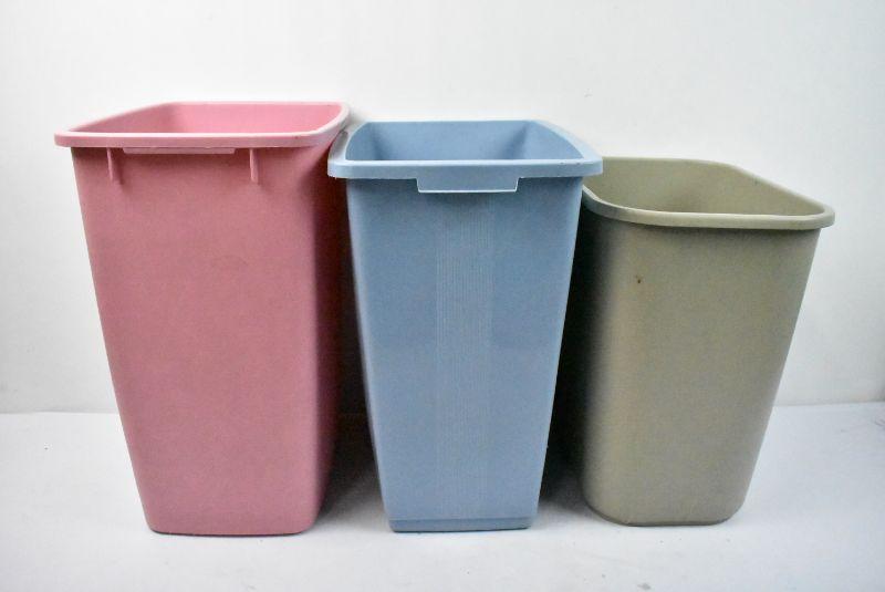3 Garbage Cans: Pink, Blue, & Gray. Pink is 8 Gallon Size