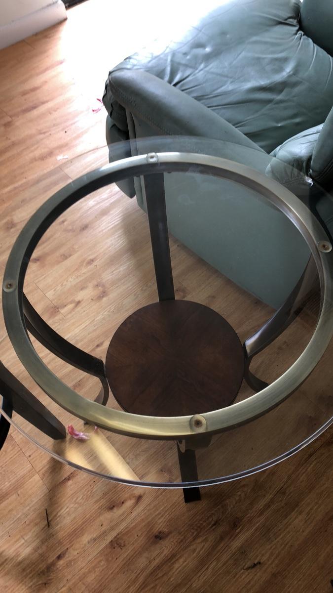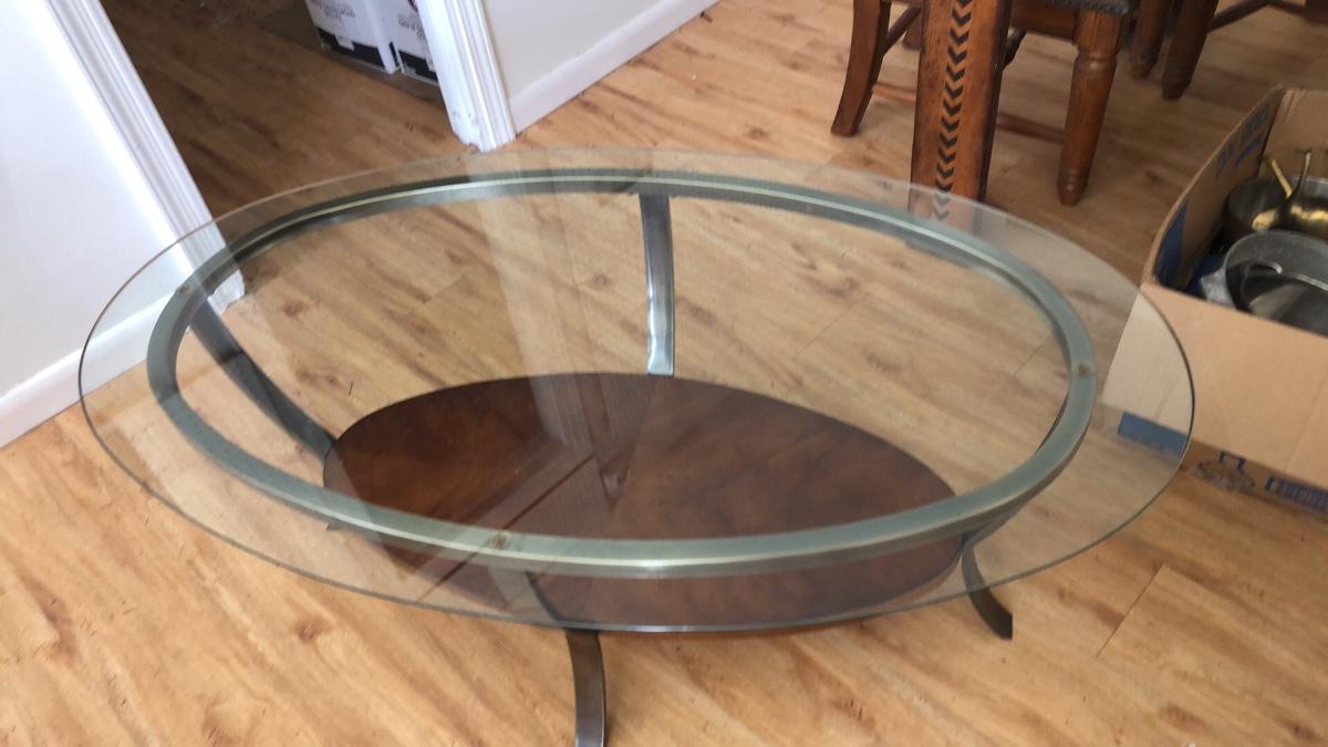 This is a great living room set. Oval table measures 48 x 20. Has a small chip underneath. End tables measure 23 x 25. Glass and wood