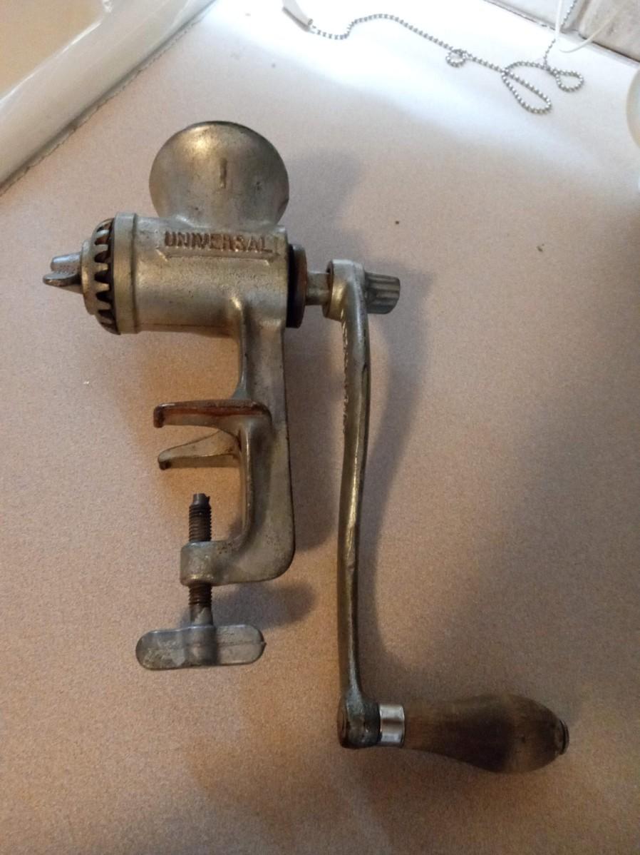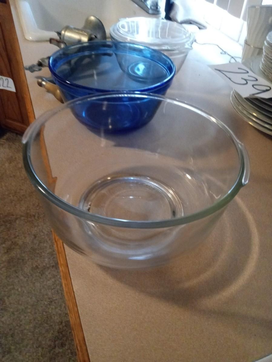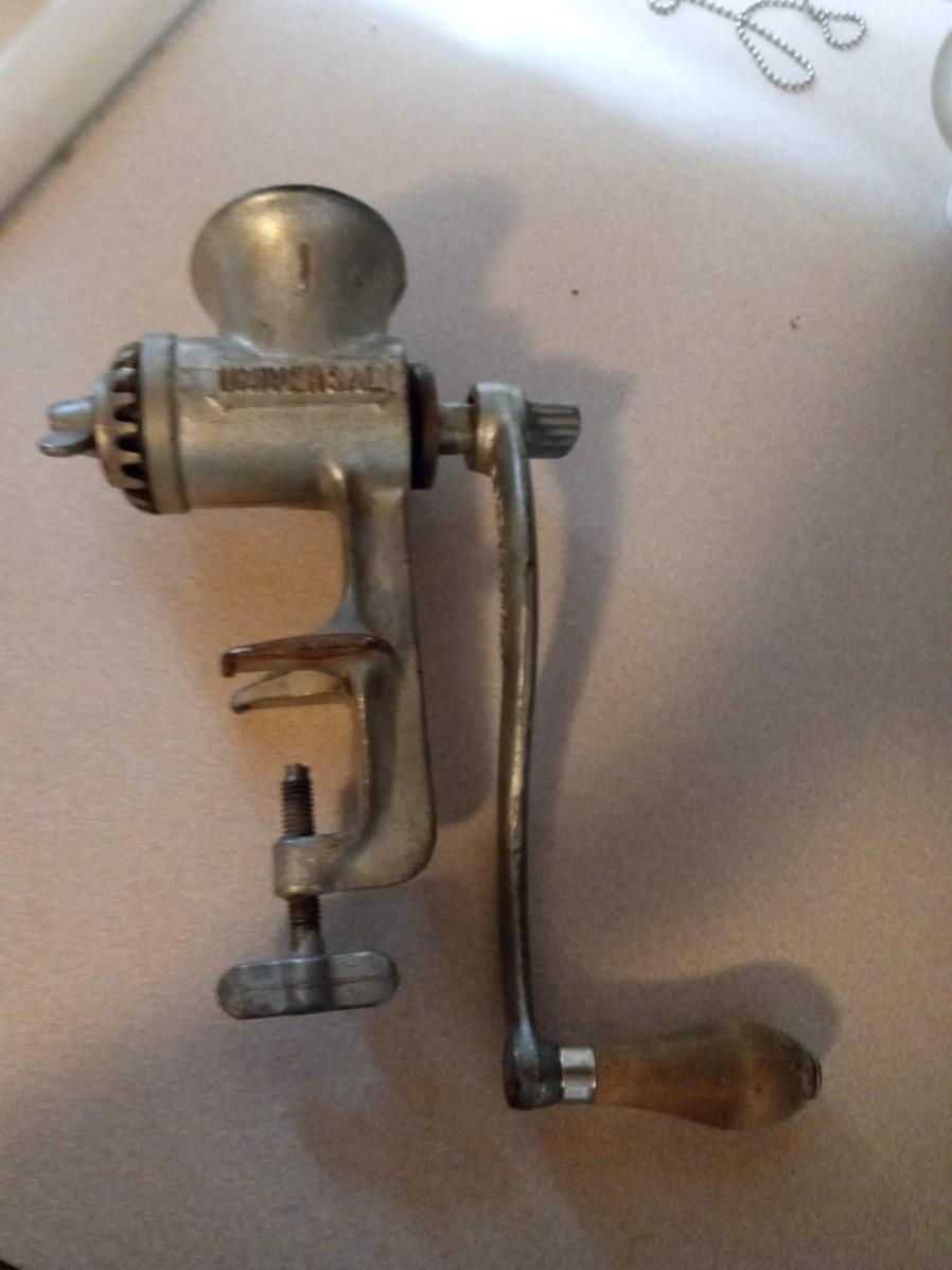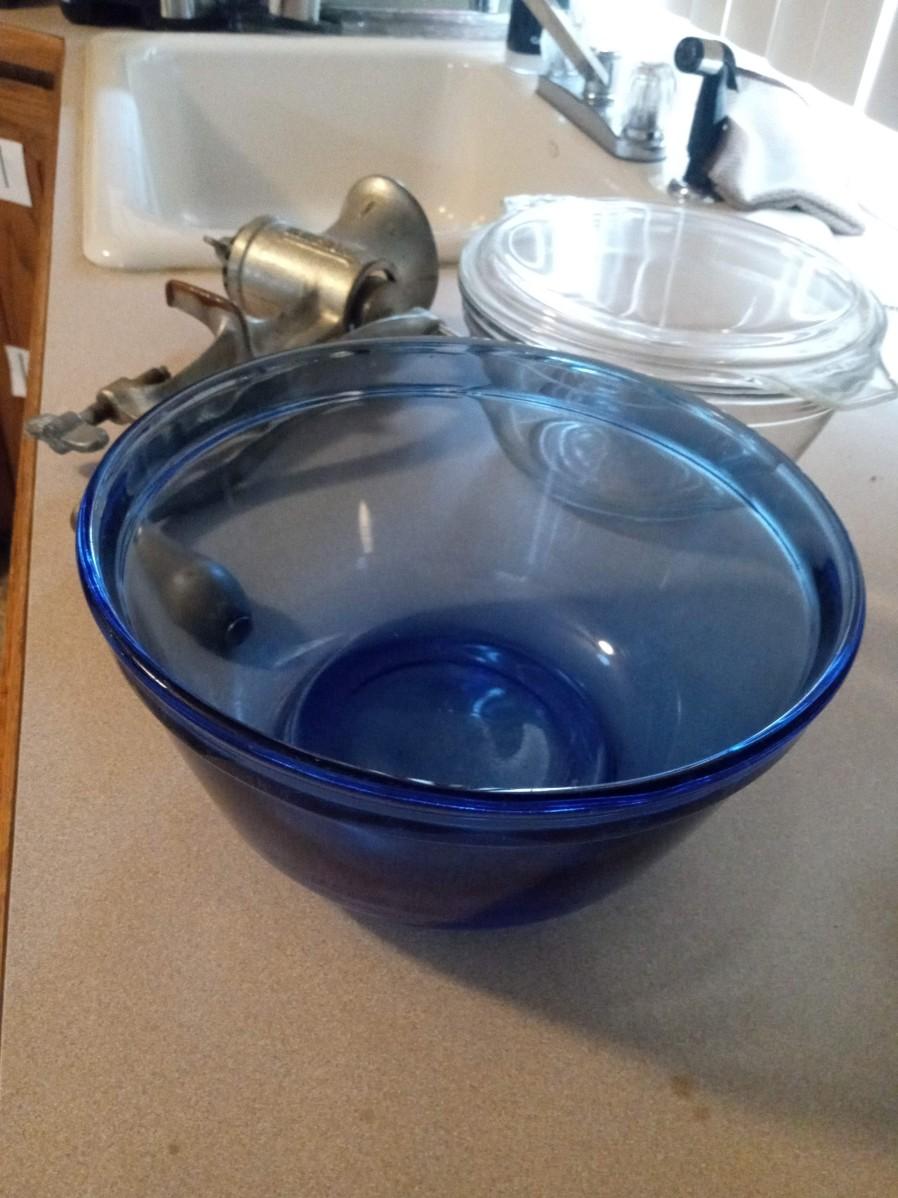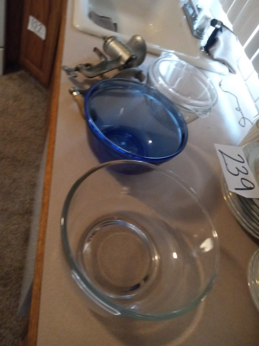 3 GLASS BOWLS AND AN UNIVERSAL MEAT GRINDER