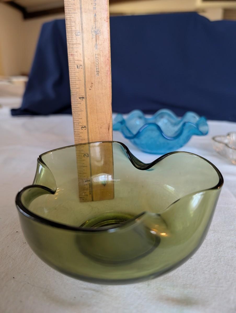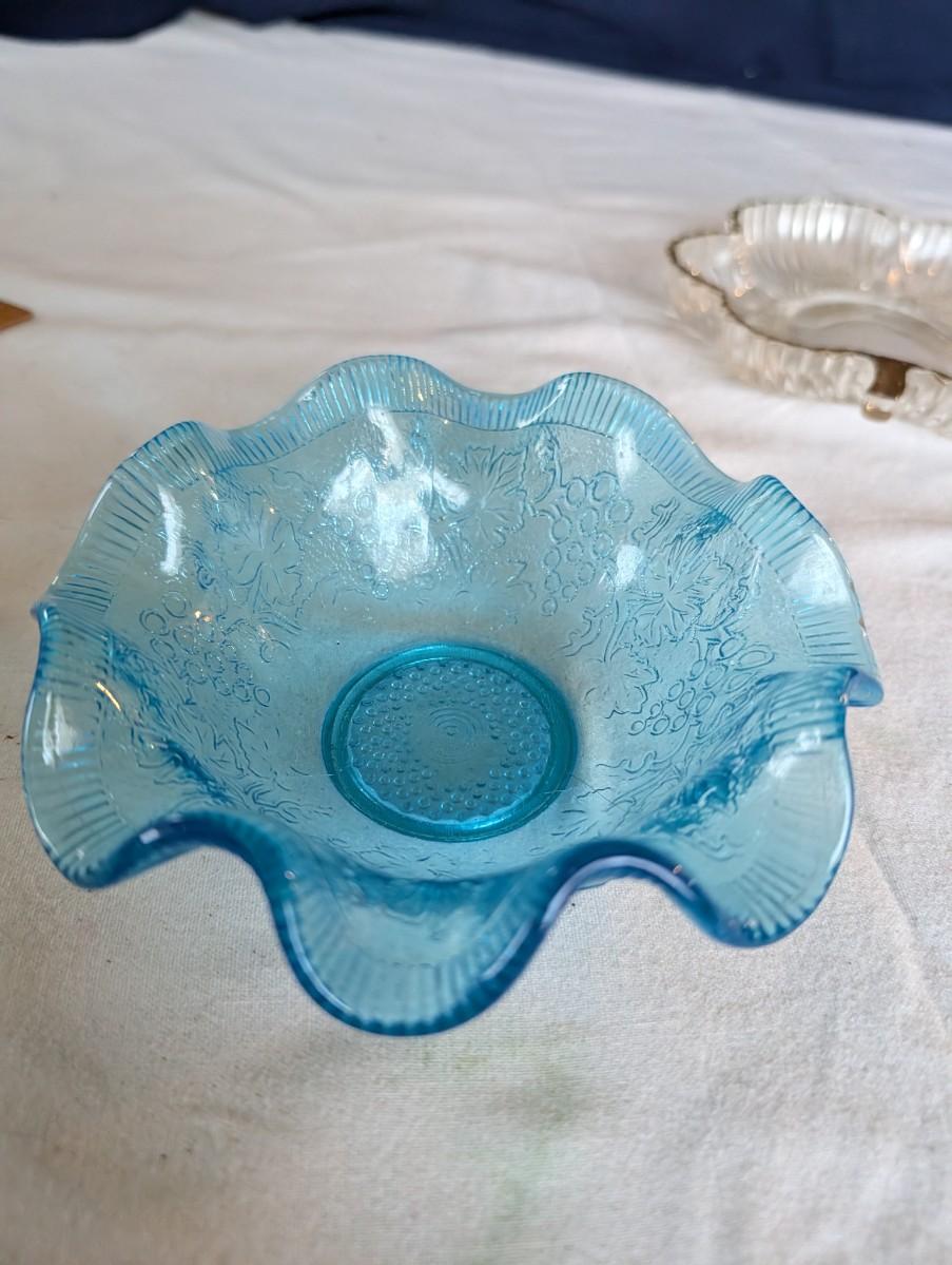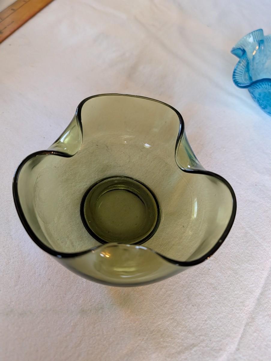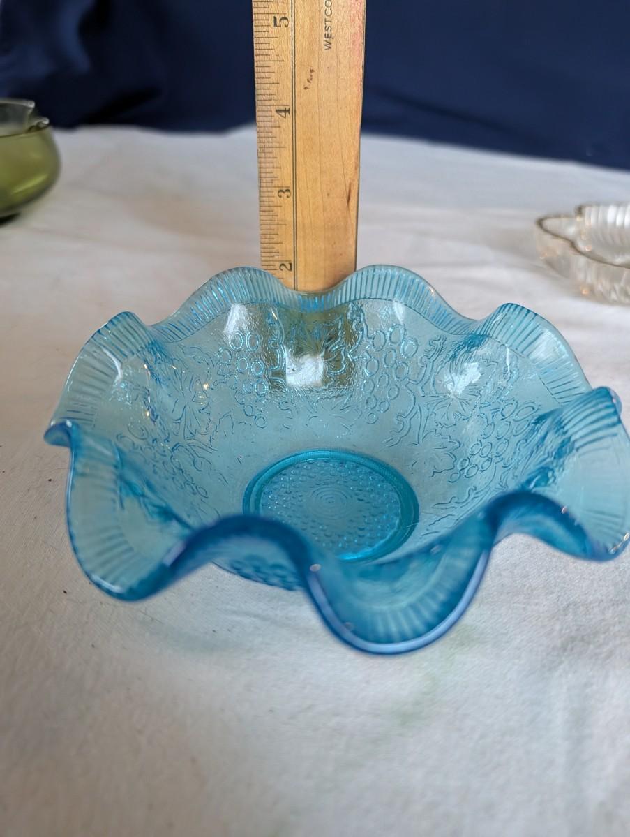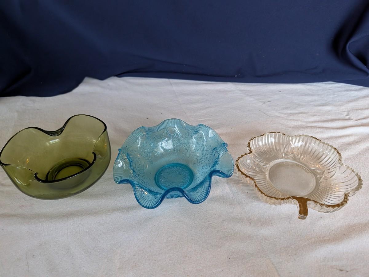 Green depression glass with ruffle. Blue with scalloped carnival glass candy dish. Clear pressed candy dish.