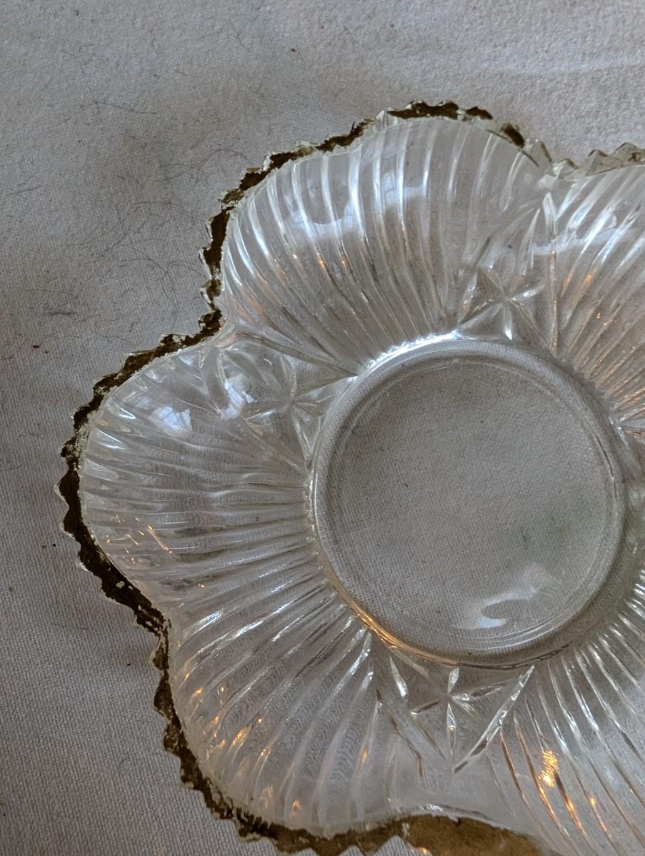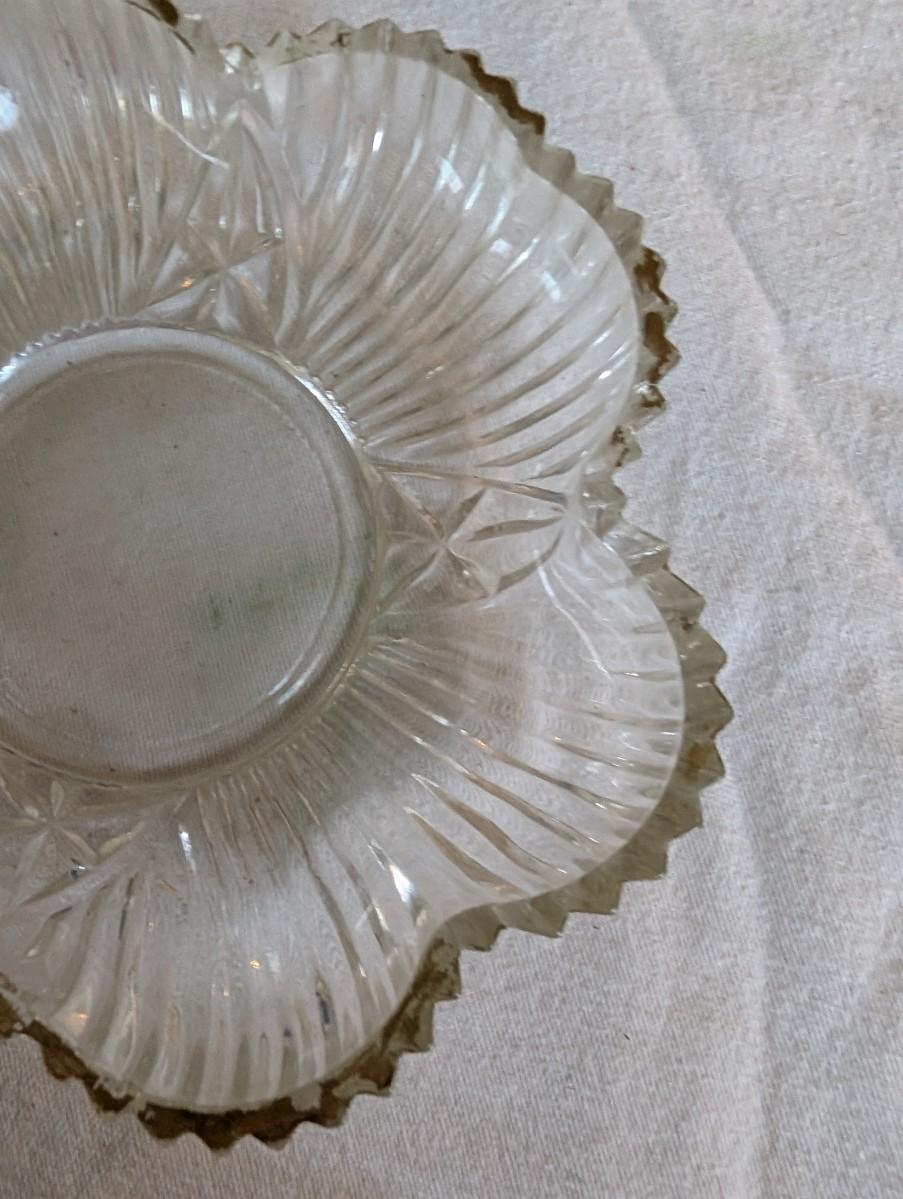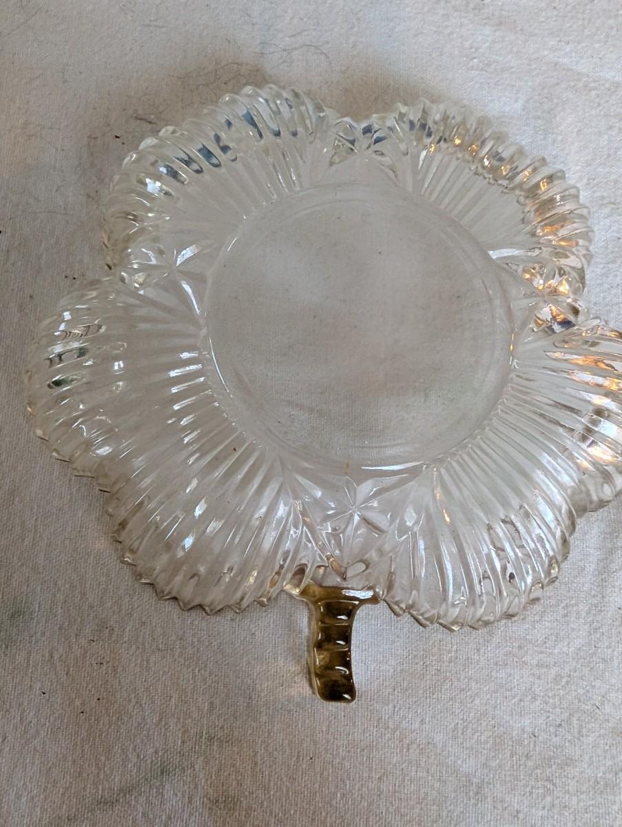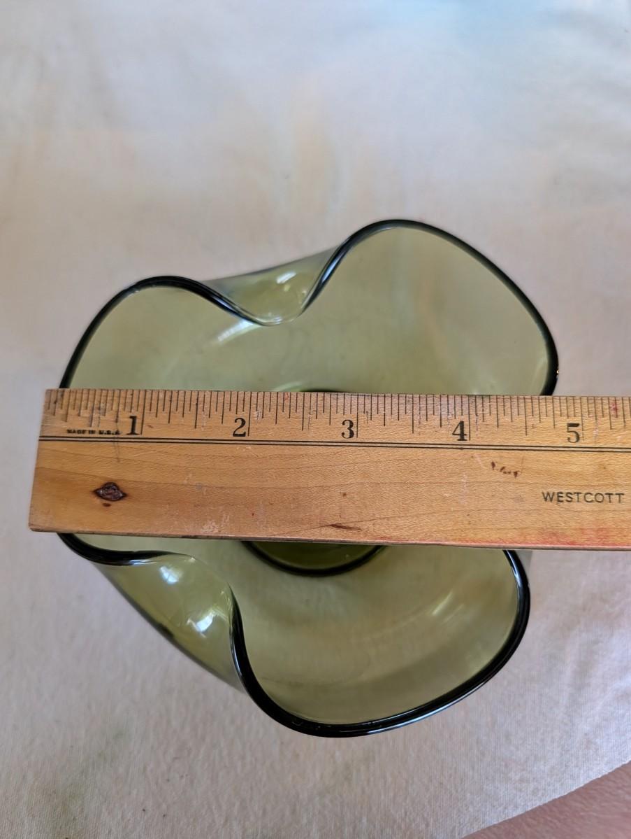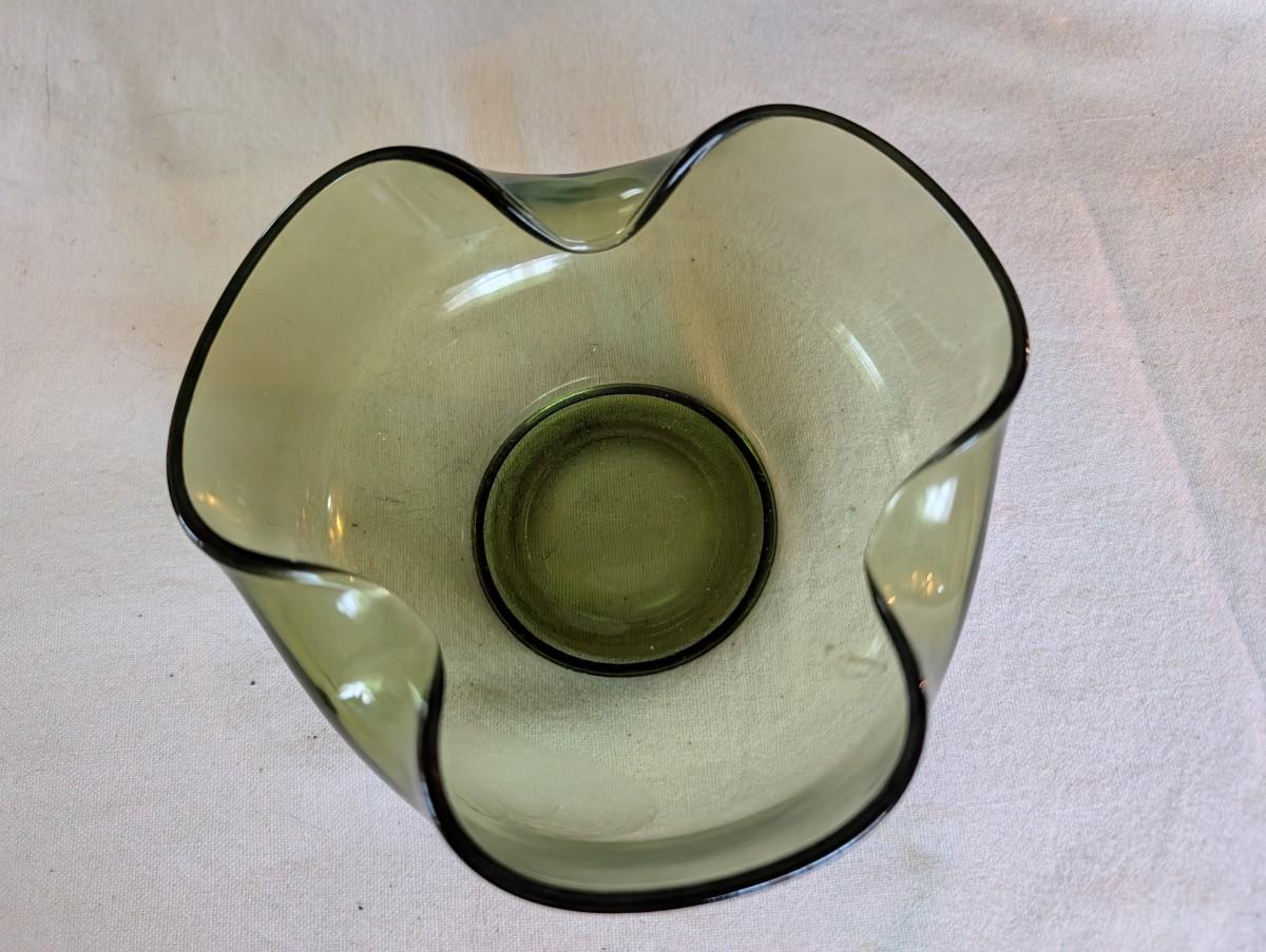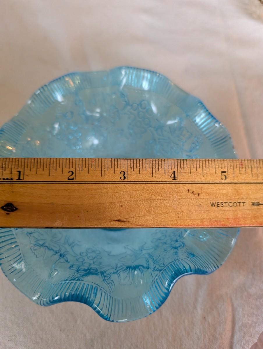 Green depression glass with ruffle. Blue with scalloped carnival glass candy dish. Clear pressed candy dish.