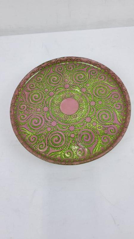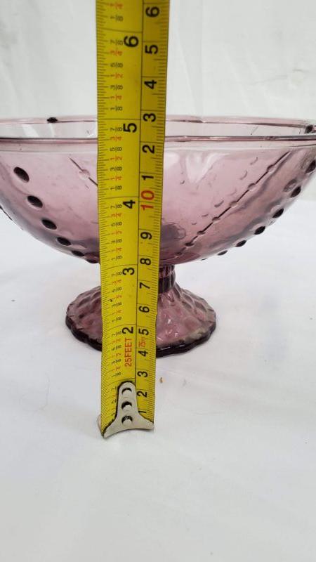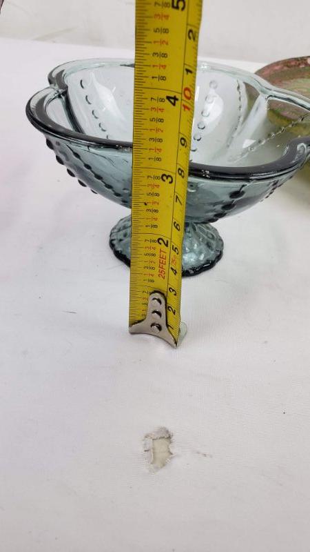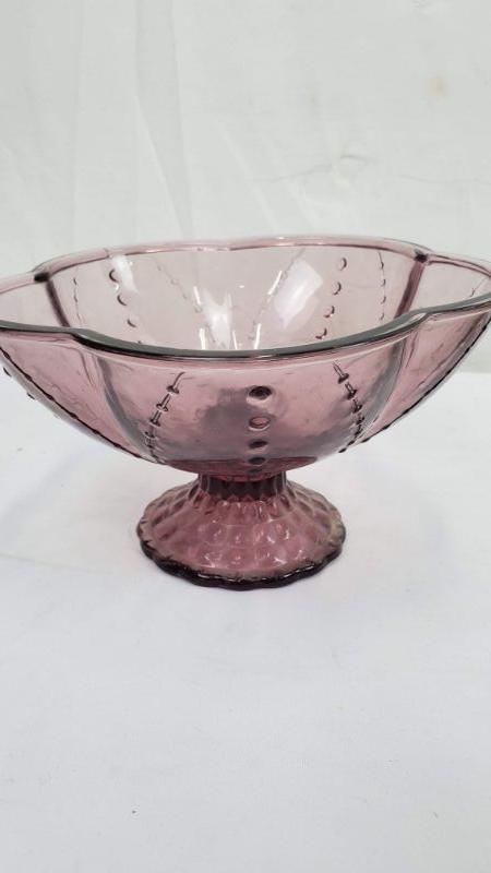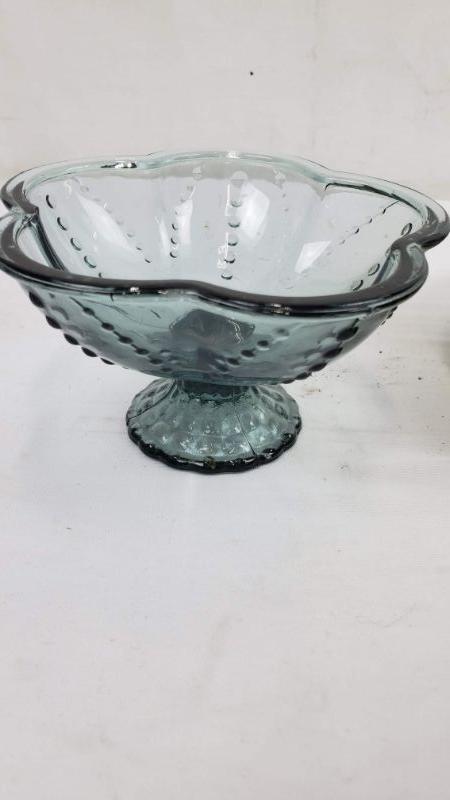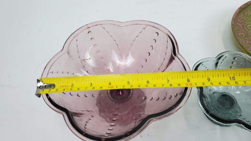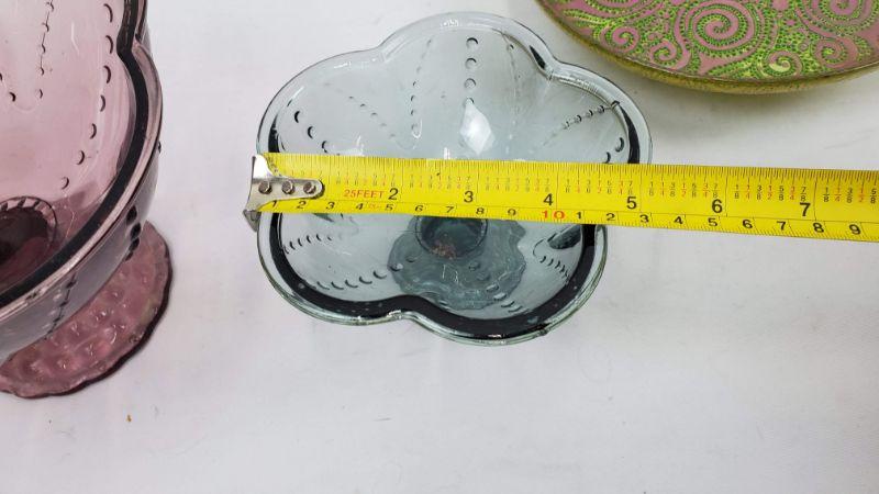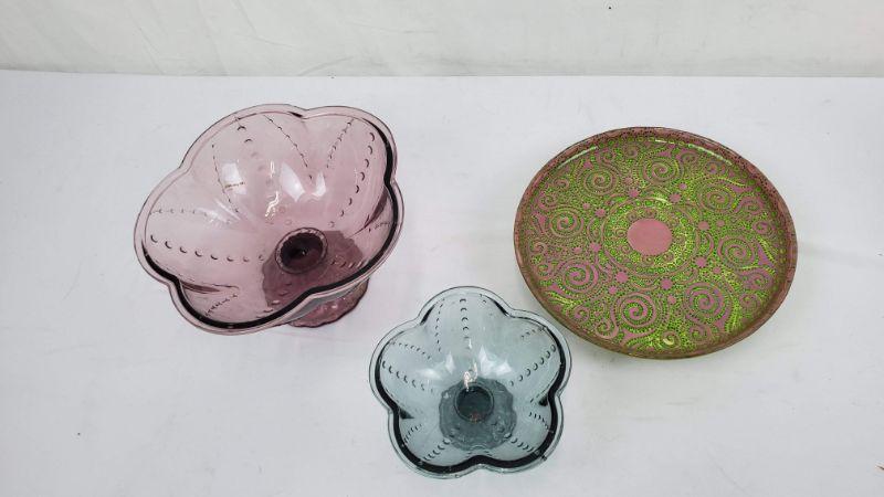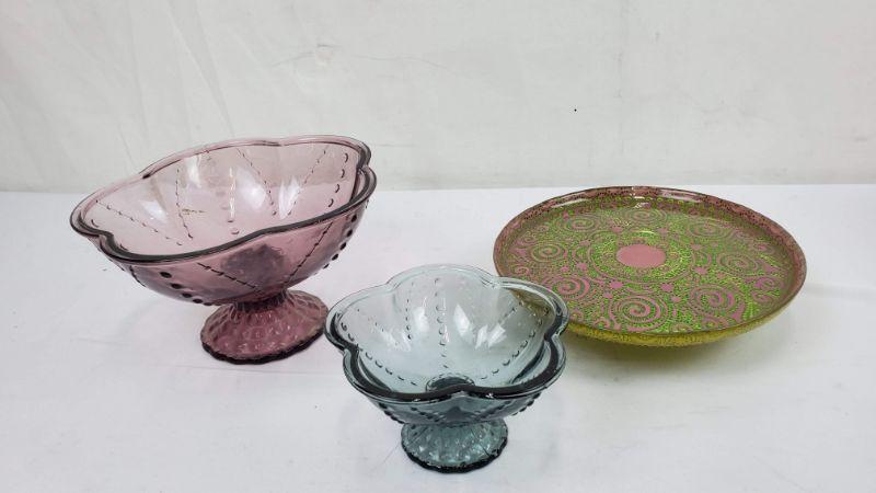 3 Glass Dishes, 2 Pedestal Bowls (Dusty Purple/Blue) Pedestal Tray Pink & Green