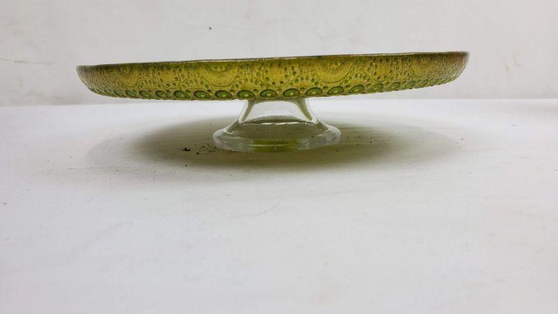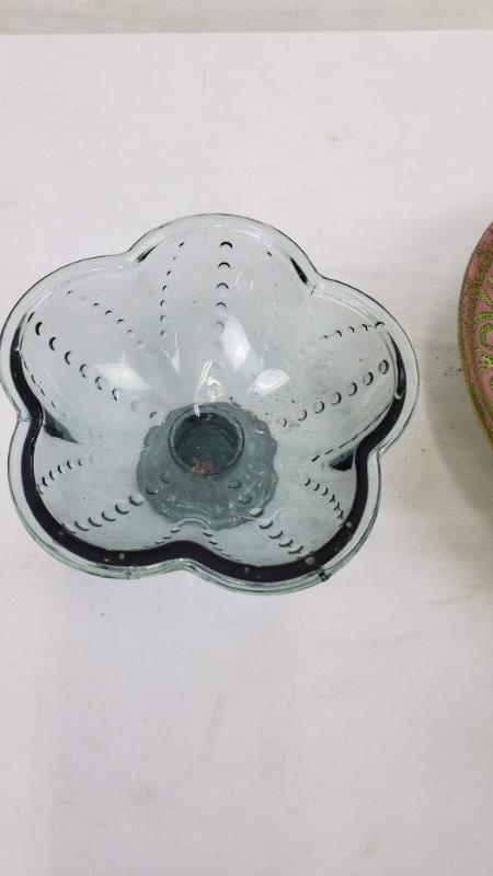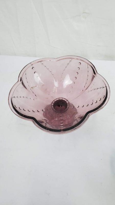 3 Glass Dishes, 2 Pedestal Bowls (Dusty Purple & Blue) Pedestal Tray Pink & Green