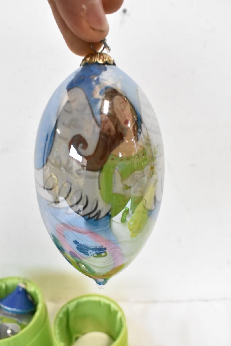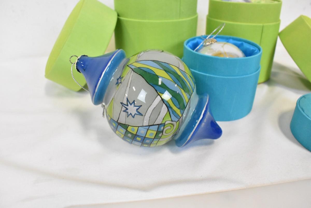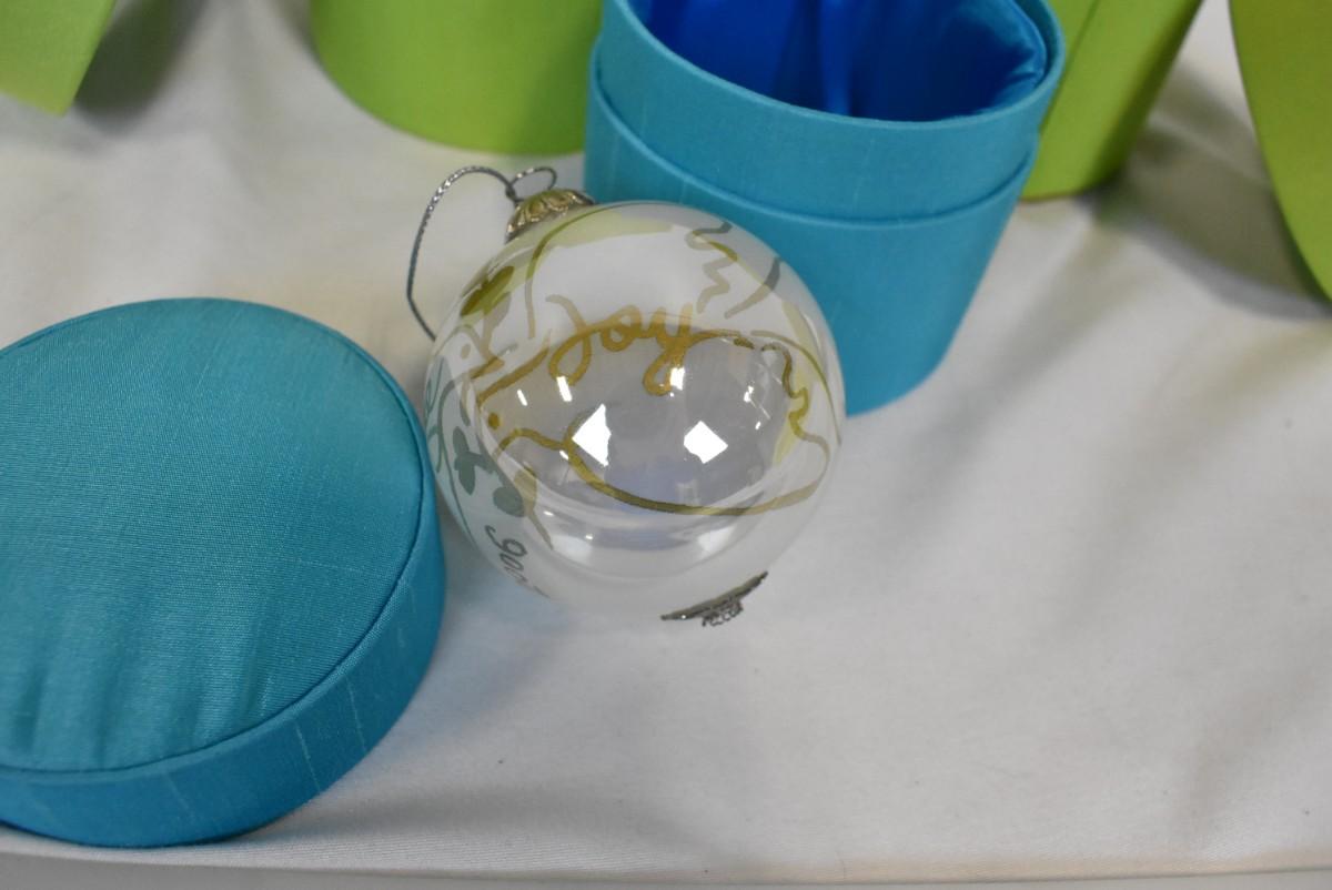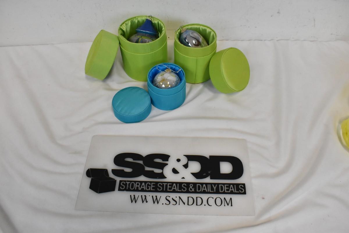 3 Glass Ornaments With Fabric Boxes