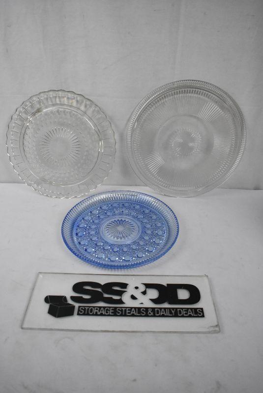 3 Glass Plates/Platters. 2 Clear 1 blue