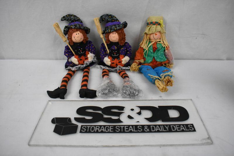 3 Halloween Shelf Sitter Decor Pieces: 2 Witches & 1 Scarecrow. New Condition, Includes Original Boxes