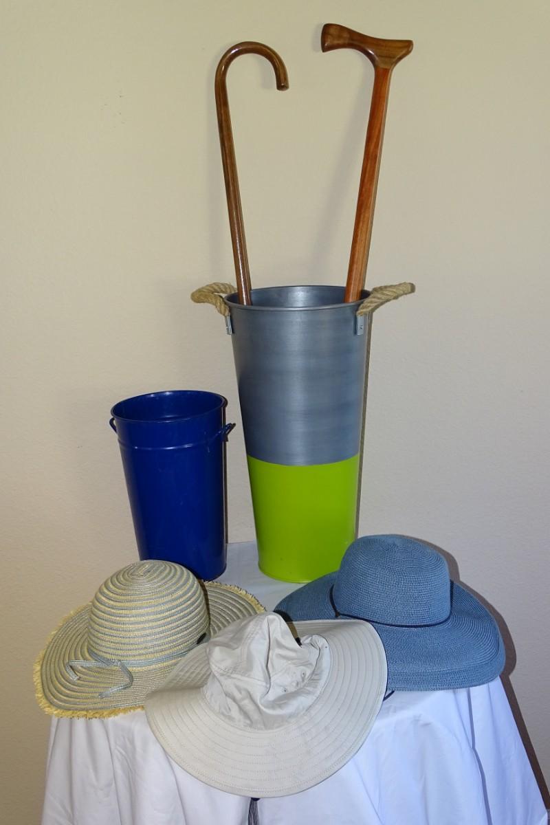 3 Hats, 2 Wooden Canes, 2 Metal Buckets