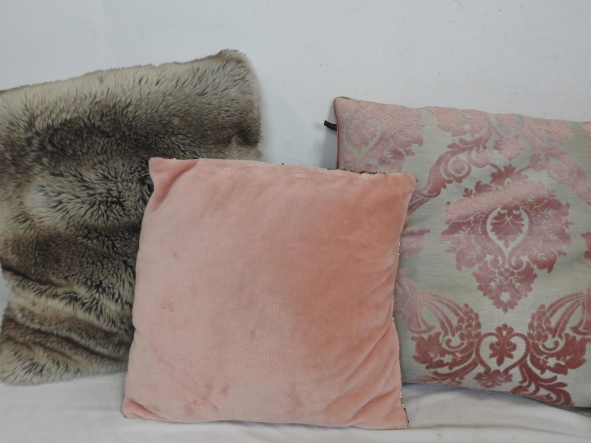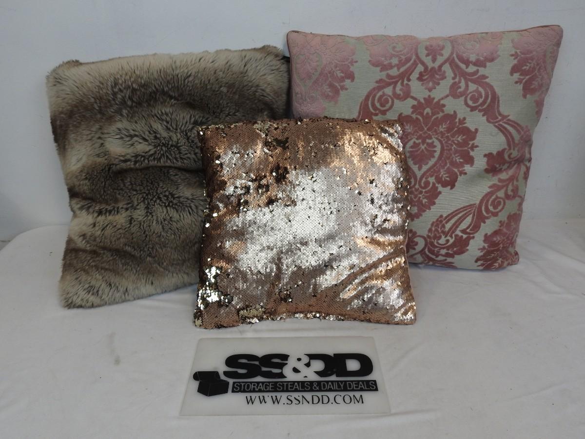 3 Home Decor Throw Pillows: Brown Furry, Pink, & Pink/Copper Sequins