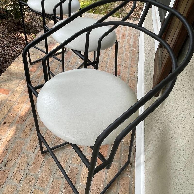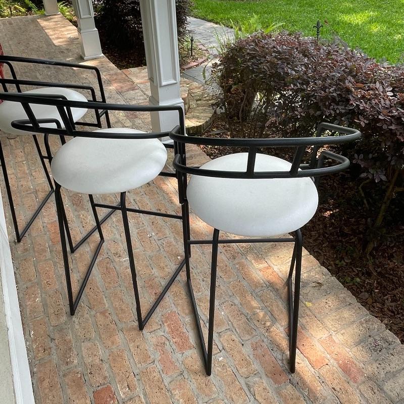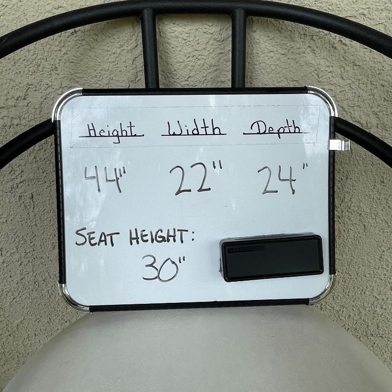 Seat is 30”. Dark Bronze Metal with off-white “leather-like” seat. Photographed outside but these are for indoor use.