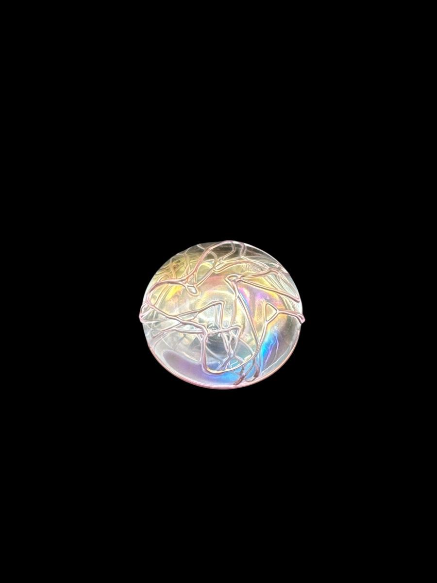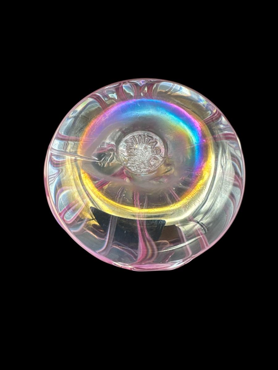 Stunning iridescent paperweight, marked on the base. Features swirling pink and gold ribbon-like patterns with a radiant rainbow finish under light. Handcrafted and collectible, in excellent condition.
