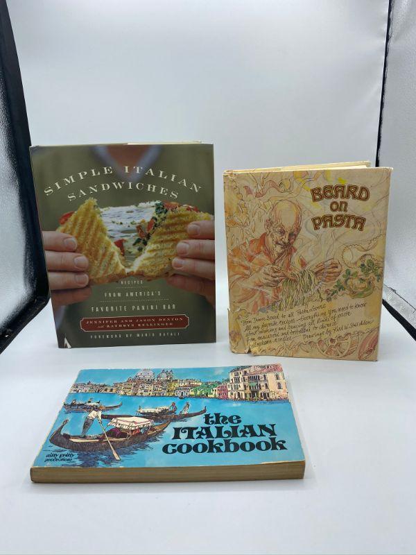 3 Italian cook books. Simple Italian Sandwiches, Beard on Pasta, and The Italian Cookbook. Good previously owned condition.