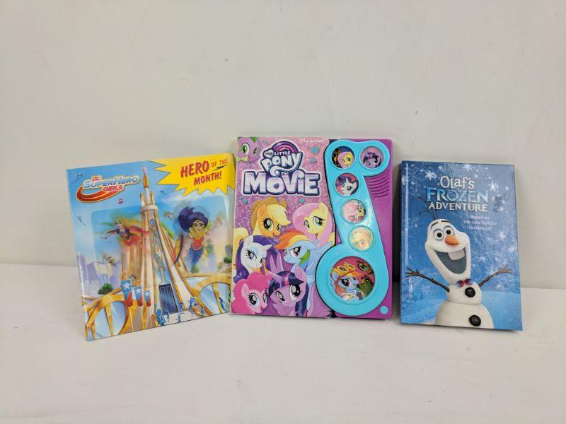 3 Kids Books, Olaf's Frozen Adventure, DC Super Heroes & My Little Pony Play-a-Song - New