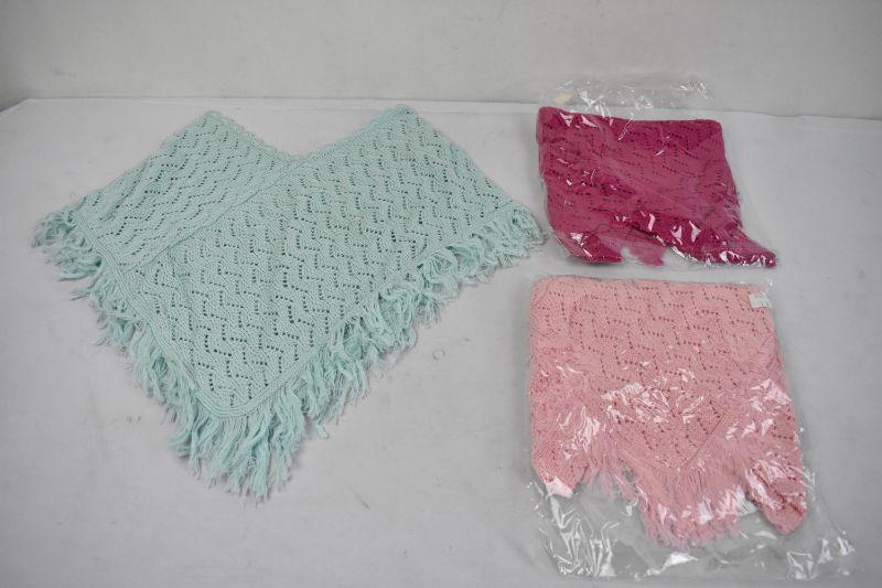 3 Knit Child Size Ponchos: Aqua, Magenta, and Baby Pink - New
