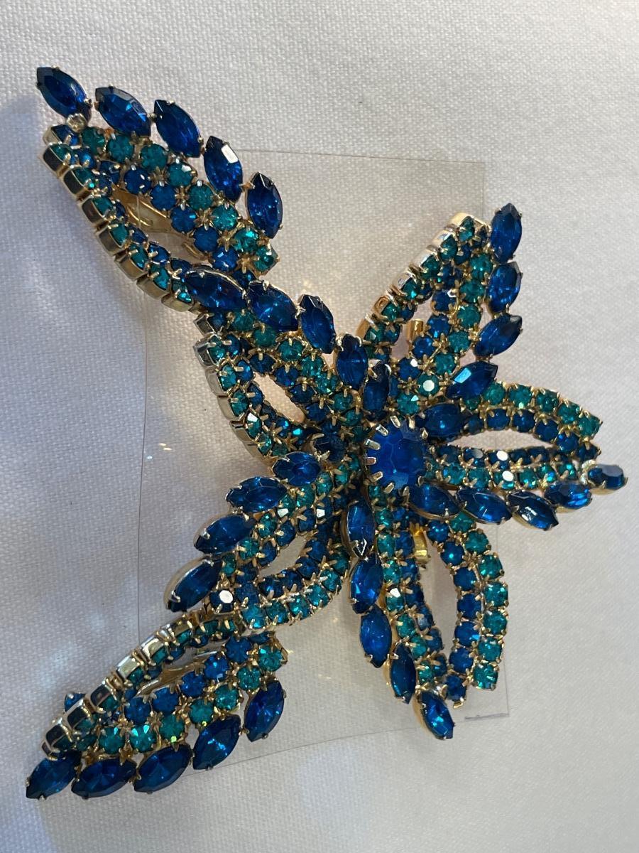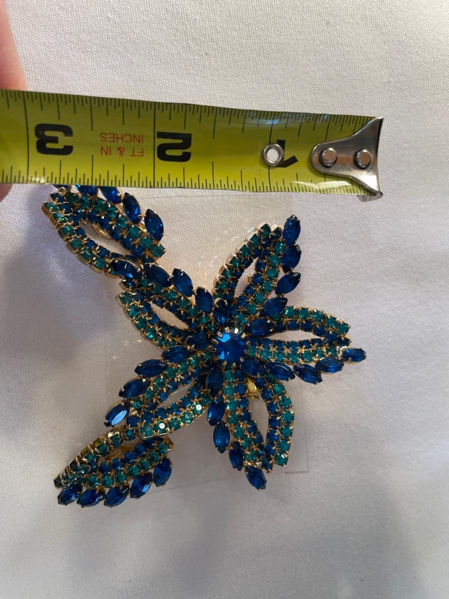 3” large blue and green brooch with matching clip on earrings