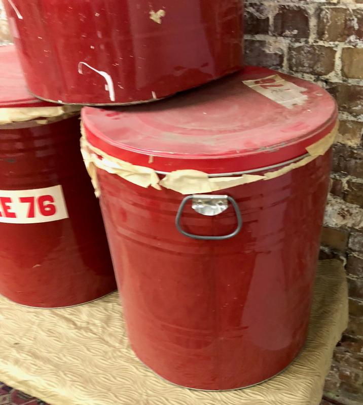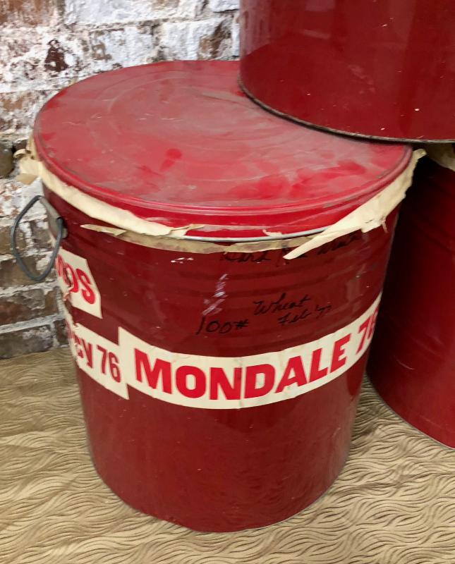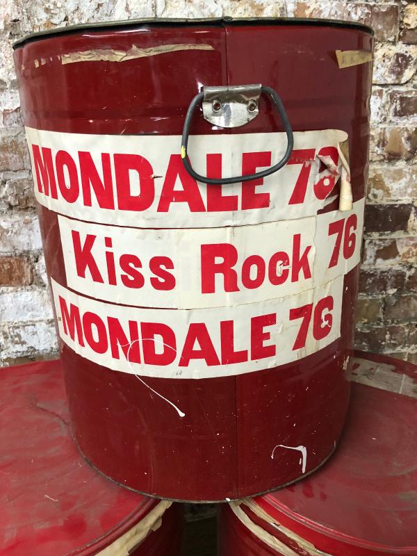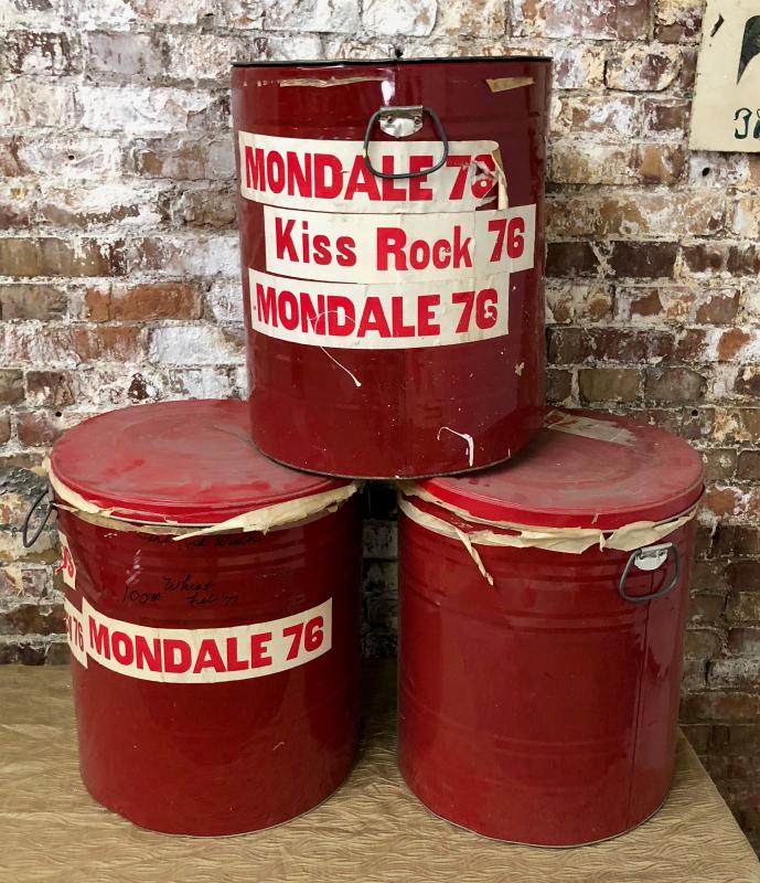 With Kiss Rock and Mondale stickers here are three large tin storage cans with lids and bail handles...as shown...