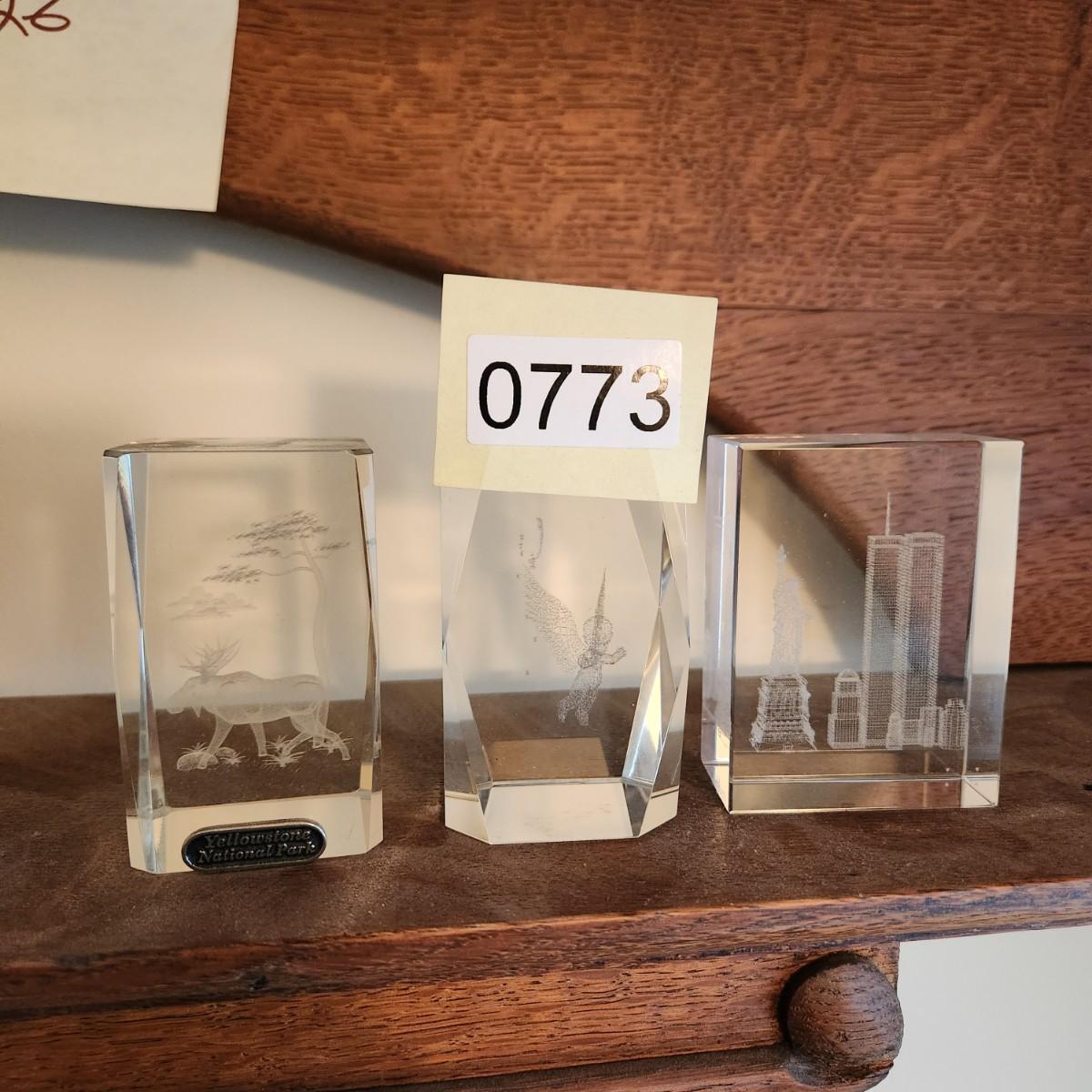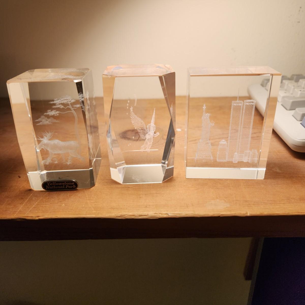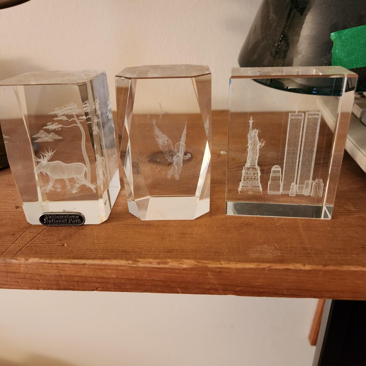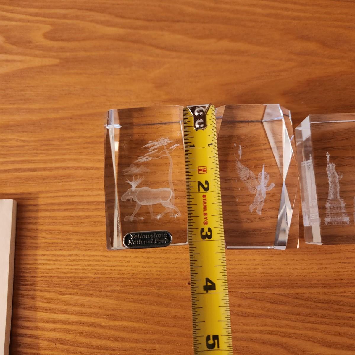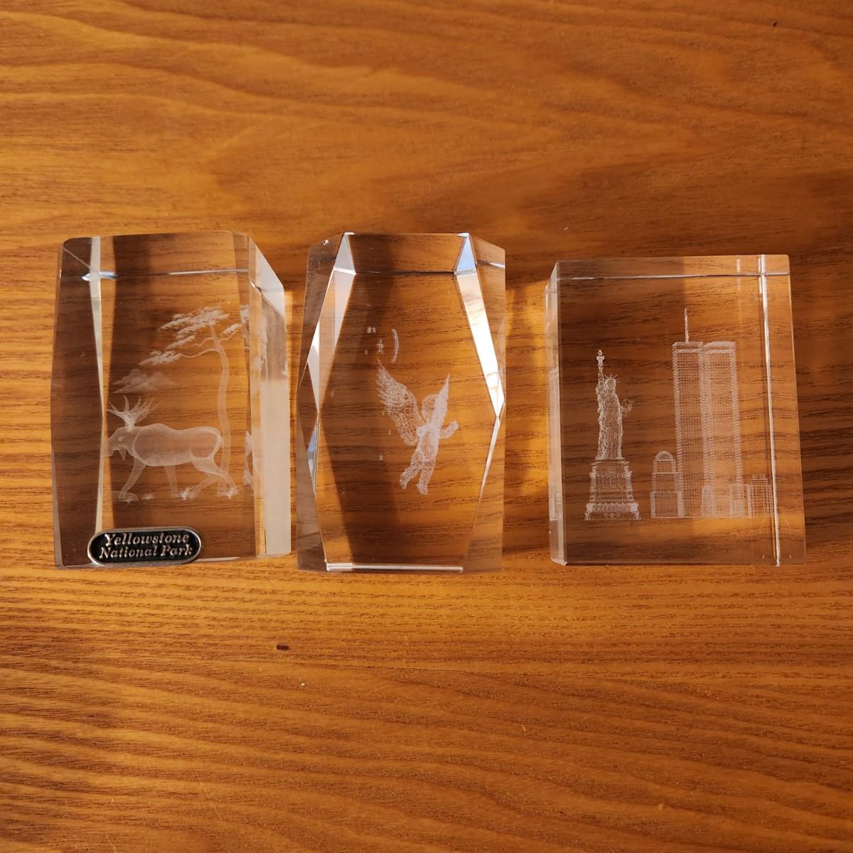 3 Laser Cut Etched Acrylic Paper weights , Yellowstone, New York City Twin Towers, Angle