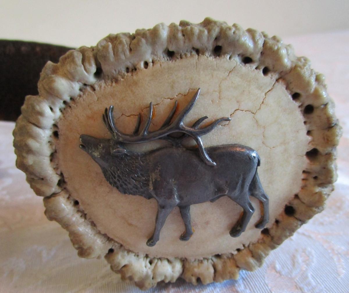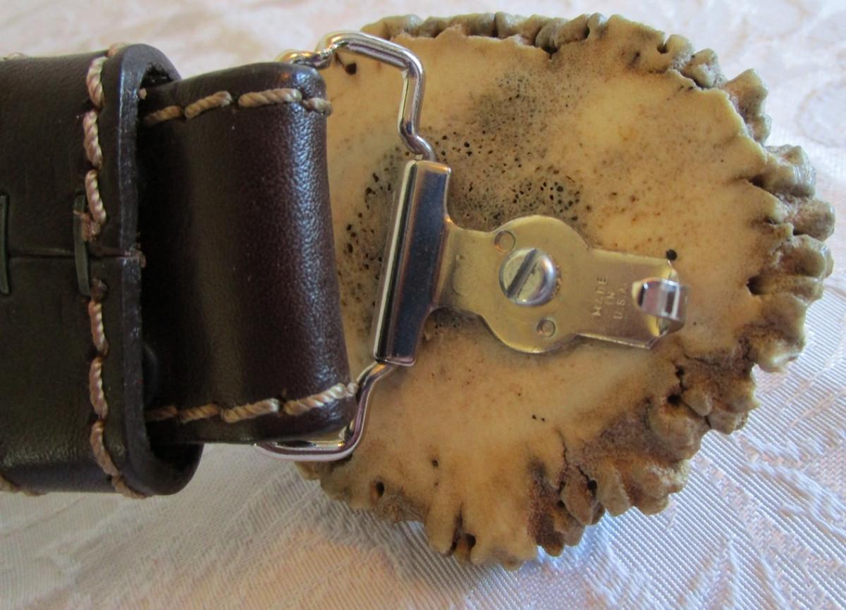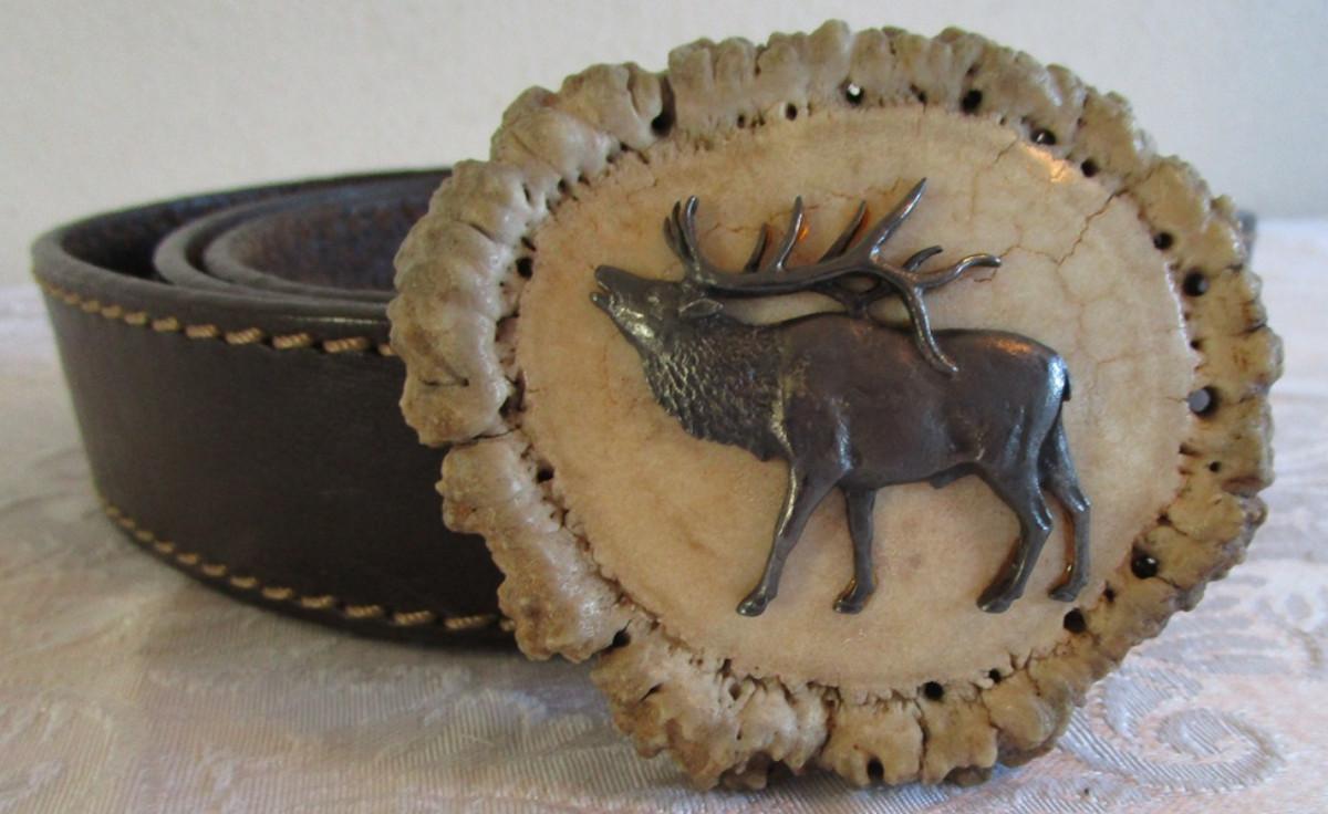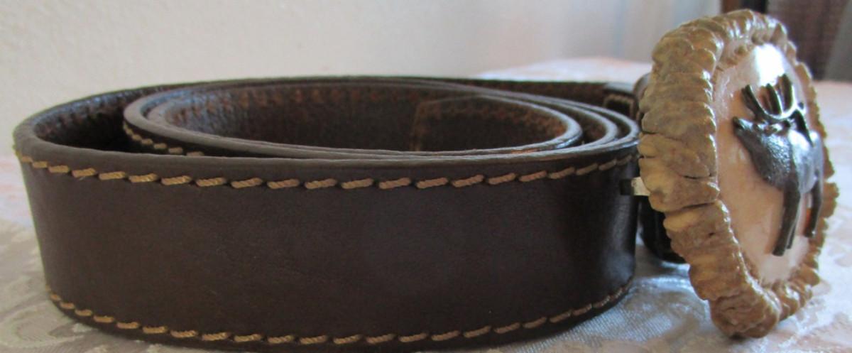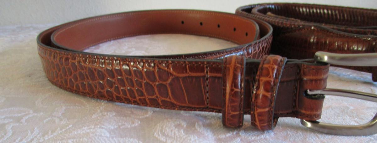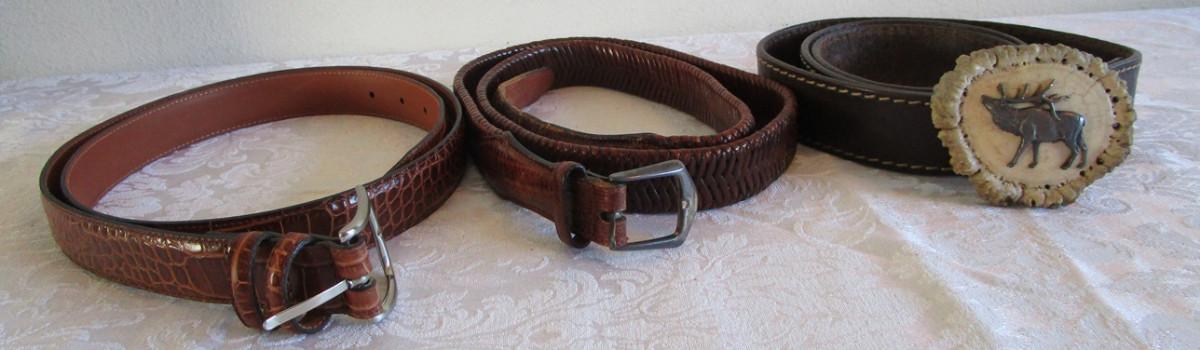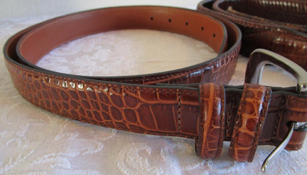 3 leather belts, one is Bill Blass alligator pattern size 42, one Leather woven belt size 42, one brown leather belt with elk buckle size 46